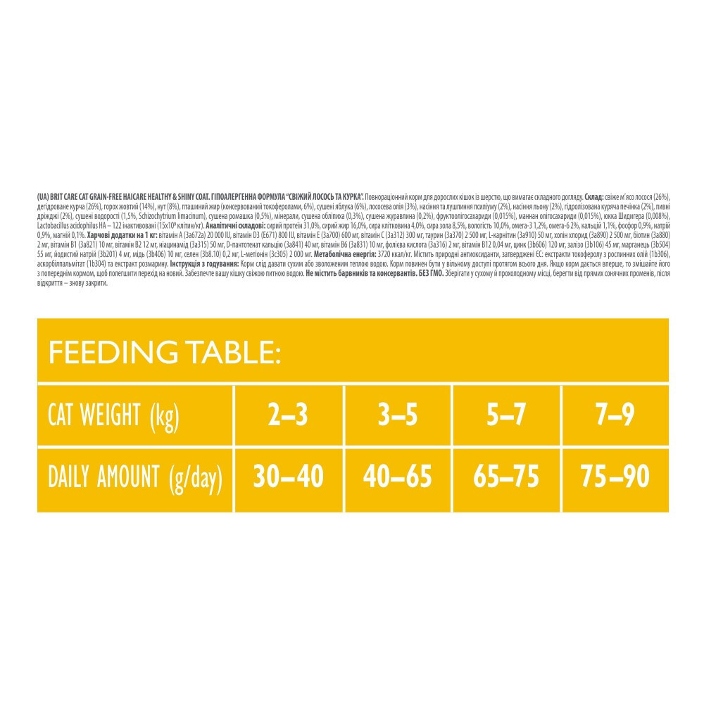 Гіпоалергенна рецептура зі свіжим лососем та куркою для дорослих котів з довгою шерстю або вимогливим доглядом за шерстю.Переваги корму:Багатий на жирні кислоти омега-3 і омега-6, які сприяють блиску шерсті та здоров’ю шкіриРецептура, збагачена клітковиною, сприяє легкому проходженню грудок шерсті через кишківникПробіотики і антиоксиданти зміцнюють імунну систему і підтримують здоров’я травної системиКорм Brit Care Cat GF Haircare Healthy & Shiny Coat це:Зір і здоров’я серця.Високоякісний м’ясний білок допомагає підтримувати хорошу м’язову масу. У поєднанні з таурином, важливою поживною речовиною для котів, він сприяє гарному зору і здоров’ю серця.Відмінний смак і спокусливий аромат.Поєднання свіжого лосося і високоякісної курки робить смак та аромат brit care cat привабливим навіть для найвибагливіших котів. Продукти виробляються з використанням натуральних інгредієнтів і не містять добавок глютену, цукру, сої, штучних ароматизаторів та консервантів.Здорова і блискуча шерсть.Натуральні джерела жирних кислот омега-3 і омега-6 (лосось і масло лосося, курка, лляне насіння, водорості) допомагають підтримувати здорову шкіру та красиву, блискучу шерсть, зміцнюючи її, скорочуючи линяння і зменшуючи сухість та лупу.Склад:свіже м’ясо лосося (26%), дегідратоване м’ясо курки (26%), жовтий горох (14 %), нут (8 %), курячий жир (консервований токоферолами, 6 %), сушені яблука (6 %), лососева олія (3 %), насіння та полова псиліуму (2 %), насіння льону (2 %), гідролізована куряча печінка (2%), пивні дріжджі (2 %), сушені водорості (1,5%, Schizochytrium limacinum), сушена ромашка (0,5%), мінерали, ушена обліпиха (0,3%), сушена журавлина (0,2%), фруктоолігосахариди (0,015 %), мананоолігосахариди (0,015 %), юка шидігера (0,008 %), Lactobacillus acidophilus HA – 122 інактивовані (15×109 клітин/кг).Аналітичні компоненти:сирий протеїн 31,0 %, вміст жиру 16,0 %, сира клітковина 4,0 %, сира зола 8,5 %, волога 10,0 %, омега-3 1,2 %, омега-6 2 %,кальцій 1,1 %, фосфор 0,9 %, натрій 0,9 %, магній 0,1 %.Харчові добавки на 1 кг:вітамін А (3a672a) 20 000 МО, вітамін D3 (E671) 800 МО, вітамін Е (3a700) 800 мг, вітамін С (3a312) 400 мг, таурин (3a370) 2800 мг, L- карнітин (3a910) 100 мг, холінхлорид (3a890) 2800 мг, біотин (3a880) 2,5 мг, вітамін B1 (3a821) 12 мг, вітамін B2 15 мг, ніацинамід (3a315) 60 мг, кальцій D-пантотенат (3a841 ) 50 мг, вітамін B6 (3a831) 12 мг, фолієва кислота (3a316) 3 мг, вітамін B12 0,05 мг, цинк (3b606) 140 мг, залізо (3b106) 55 мг, марганець (3b504) 65 мг, йодид калію (3b201) 4,5 мг, мідь (3b406) 12 мг, селен (3b8,10) 0,2 мг, L-метіонін (3c305) 2500 мг. Містить природні антиоксиданти, ухвалені ЄС: екстракти токоферолу з рослинних олій (1b306), аскорбіл пальмітат (1b304) і екстракт розмарину.Енергетична цінність:3720 ккал/кгВага кота, кг2-33-55-77-9Добова норма, г30-4040-6565-7575-90