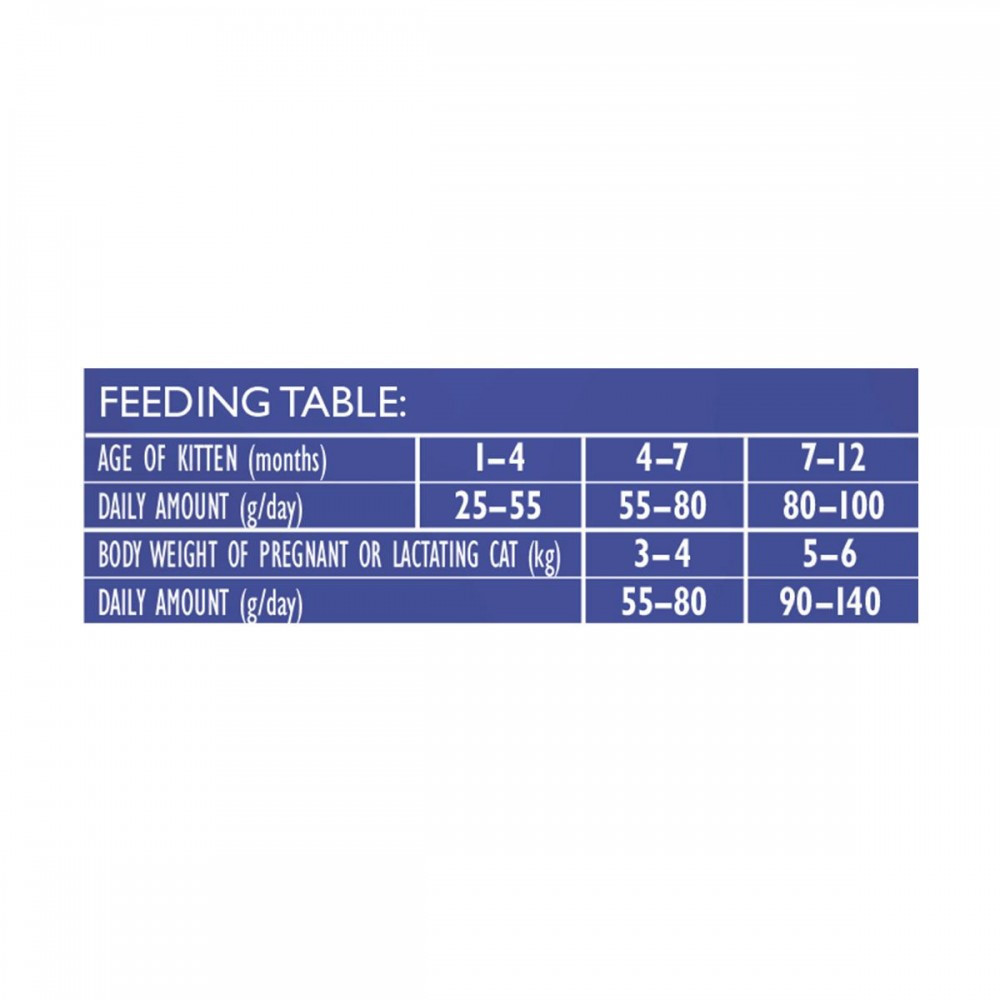Цей корм суперпреміум класу має гіпоалергенну беззернову рецептуру зі свіжим лососем. Підходить для кошенят (1–12 місяців), а також для вагітних або годуючих кішок. Такий раціон допомагає підтримувати зростання і розвиток м’язової маси, сприяє гарному зору і здоров’ю серця, а також дає енергію для нових відкриттів та ігор. Оптимальне поєднання вітамінів і органічних мікроелементів підтримує повсякденну активність і добре самопочуття кошеняти.Добре засвоювана формула, багата основними поживними речовинами, щоб задовольнити енергетичні потреби вагітних або годуючих кішок і підтримувати правильний розвиток плоду. Збалансований вміст кальцію, фосфору, магнію, вітаміну D, комплексу вітамінів, мінералів і незамінних жирних кислот забезпечує народження здорових кошенят і сприяє профілактиці рахіту.Переваги корму:Беззернова формула з високим вмістом білка та пробіотиками для чутливого травлення і формування сильного імунітету.Омега-3, DHA і EPA разом з таурином забезпечує правильну роботу серця, очей, мозку і допомагає прискорити когнітивний розвиток.Свіжий лосось, багатий Омега-3, а також корисними для котів вітамінами та мінералами, такими як ніацин, калій, селен, вітаміни В6 і В12.Без зерна. Без барвників. Без консервантів. Без ГМО. Без сої.Склад: дегідратований лосось (30%), свіжий лосось (26%), жир птиці (консервований токоферолами, 12%), жовтий горох (12%), нут (7%), лососева олія (3%), гідролізована куряча печінка (2%), насіння льону (2%), сушені яблука (2%), горохове борошно, пивні дріжджі (1%), молозиво (0,5%), сушена ромашка (0,5%), олія водоростей (0,3%, Schizochytrium limacinum), сушена обліпиха (0,3%), сушена журавлина (0,2%), фруктоолігосахариди (0,025%), маннаноолігосахариди (0,02%), юка Мохаве (0,01%), інактивовані бактерії та їх частинки (Lactobacillus helveticus HA – 122 інактивованих 15х109 клітин/кг).Аналітичний склад:сирий протеїн 39,0%, сирий жир 18,0%, сира клітковина 1,2%, сира зола 7,5%, вологість 10,0%, Омега-3 жирні кислоти 1,3%, Омега-6 жирні кислоти 2,0%, кальцій 1,2%, фосфор 1,0% , натрій 0,7%, магній 0,1%, EPA (20:5 n-3) 0,15%, DHA (22:6 n-3) 0,2%.Харчові добавки на 1 кг:вітамін А (3a672a) 23000 МО, вітамін D3 (3a671) 1000 МО, вітамін Е (3a700) 800 мг, вітамін С (3a312) 400 мг, таурин (3a370) 2800 мг, L-карнітин (3a910) 100 мг, холін хлорид (3a890) 2800 мг, біотин (3a880) 2,5 мг, вітамін B1 (3a821) 12 мг, вітамін B2 (3a825i) 15 мг, ніацинамід (3a315) 60 мг, кальцій-D -пантотенат (3a841) 50 мг, вітамін B6 (3a831) 12 мг, фолієва кислота (3a316) 3 мг, вітамін B12 0,05 мг, цинк (3b606) 140 мг, залізо (3b106) 55 мг, марганець (3b504) 65 мг, йодид (3b201) 4,5 мг, мідь (3b406) 12 мг, селен (3b810) 0,2 мг, L-метіонін (3c305) 2500 мг. Містить схвалені ЄС природні антиоксиданти: екстракти токоферолу з рослинної олії (1b306(i)), аскорбілпальмітат (1b304) і екстракт розмарину.Енергетична цінність:3965 ккал/кг.Рекомендації з годування:подавайте корм сухим або змоченою теплою водою. Переконайтеся, що в улюбленця є постійний доступ до свіжої питної води. Корм має бути у вільному доступі впродовж дня.Вік кошеняти (міс)1-44-77-12Добова норма (г)25-5555-8080-100Вага вагітної кішки (кг)3-45-6Добова норма (г)55-8090-140