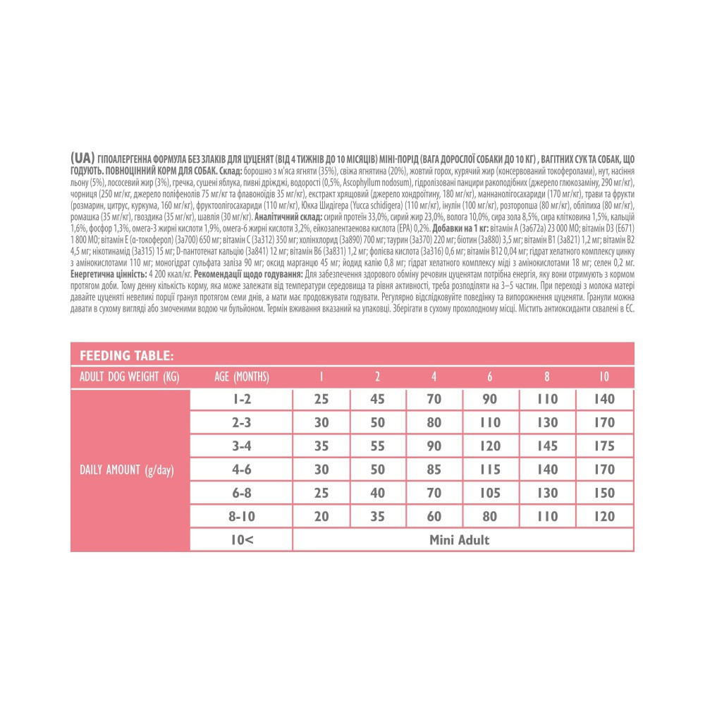 Гіпоалергенна формула з ягнятиною, без злаків для цуценят (від 2 тижнів до 10 місяців) мініпорід (до 10 кг), вагітних сук та собак, що годують. Повноцінний корм суперпреміум класу.Малі породи собак мають специфічні потреби у харчуванні. Завдяки невеликим розмірам вони перебувають у середовищах з високою концентрацією пилу та забруднюючих речовин. Це приносить з собою більший рівень стресу та надзвичайне навантаження на зовнішні та внутрішні захисні бар’єри організму – шерсть, шкіру, імунітет слизових оболонок та клітинну обороноздатність. Специфічна анатомія – короткий травний тракт і швидке травлення порівняно з великими собаками – вимагає високої концентрації поживних речовин у малій порції корму.Brit Care Mini пропонує нову рецептуру, розроблену спеціально з урахуванням потреб малих порід собак.Раціон Brit Care Mini дбає про:Чудовий вигляд, блискучу шерсть та здорову шкіру улюбленцяПідтримку клітинного імунітетуНервову систему та здоров’я серцяАнтибактеріальний захист зубівСклад:борошно з м’яса ягняти (35%), свіжа ягнятина (20%), жовтий горох, курячий жир (консервований токоферолами), нут, насіння льону (5%), лососевий жир (3%), гречка, сушені яблука, пивні дріжджі, водорості (0,5%, Ascophyllum nodosum), гідролізовані панцирі ракоподібних (джерело глюкозаміну, 290 мг/кг), чорниця (250 мг/кг, джерело поліфенолів 75 мг/кг та флавоноїдів 35 мг/кг), екстракт хрящовий (джерело хондроїтину, 180 мг/кг), мананолігосахариди (170 мг/кг), трави та фрукти (розмарин, цитрус, куркума, 160 мг/кг), фруктоолігосахариди (110 мг/кг), юка Шидігера (Yucca schidigera) (110 мг/кг), інулін (100 мг/кг), розторопша (80 мг/кг), обліпиха (80 мг/кг), ромашка (35 мг/кг), гвоздика (35 мг/кг), шавлія (30 мг/кг).Аналітичні компоненти:сирий протеїн 33,0%, сирий жир 23,0%, волога 10,0%, сира зола 8,5%, сира клітковина 1,5%, кальцій 1,6%, фосфор 1,3%, омега-3 жирні кислоти 1,9%, омега-6 жирні кислоти 3,2%, ейкозапентаенова кислота (EPA) 0,2%.Харчові добавки на 1 кг:вітамін A (3a672a) 23 000 МО, вітамін D3 (E671) 1 800 МО, вітамін E (α-токоферол) (3a700) 650 мг, вітамін C (3a312) 350 мг, холінхлорид (3a890) 700 мг, таурин (3a370) 220 мг, біотин (3a880) 3,5 мг, вітамін B1 (3a821) 1,2 мг, вітамін B2 4,5 мг, нікотинамід (3a315) 15 мг, D-пантотенат кальцію (3a841) 12 мг, вітамін B6 (3a831) 1,2 мг, фолієва кислота (3a316) 0,6 мг, вітамін B12 0,04 мг, гідрат хелатного комплексу цинку з амінокислотами 110 мг, моногідрат сульфата заліза 90 мг, оксид марганцю 45 мг, йодид калію 0,8 мг, гідрат хелатного комплексу міді з амінокислотами 18 мг, селен 0,2 мг.Енергетична цінність:4 200 ккал/кгВік, місяціВага цуценяти, кг1246810Добова норма, г1-2254570901101402-33050801101301703-43555901201451754-63050851151401706-82540701051301508-1020356080110120