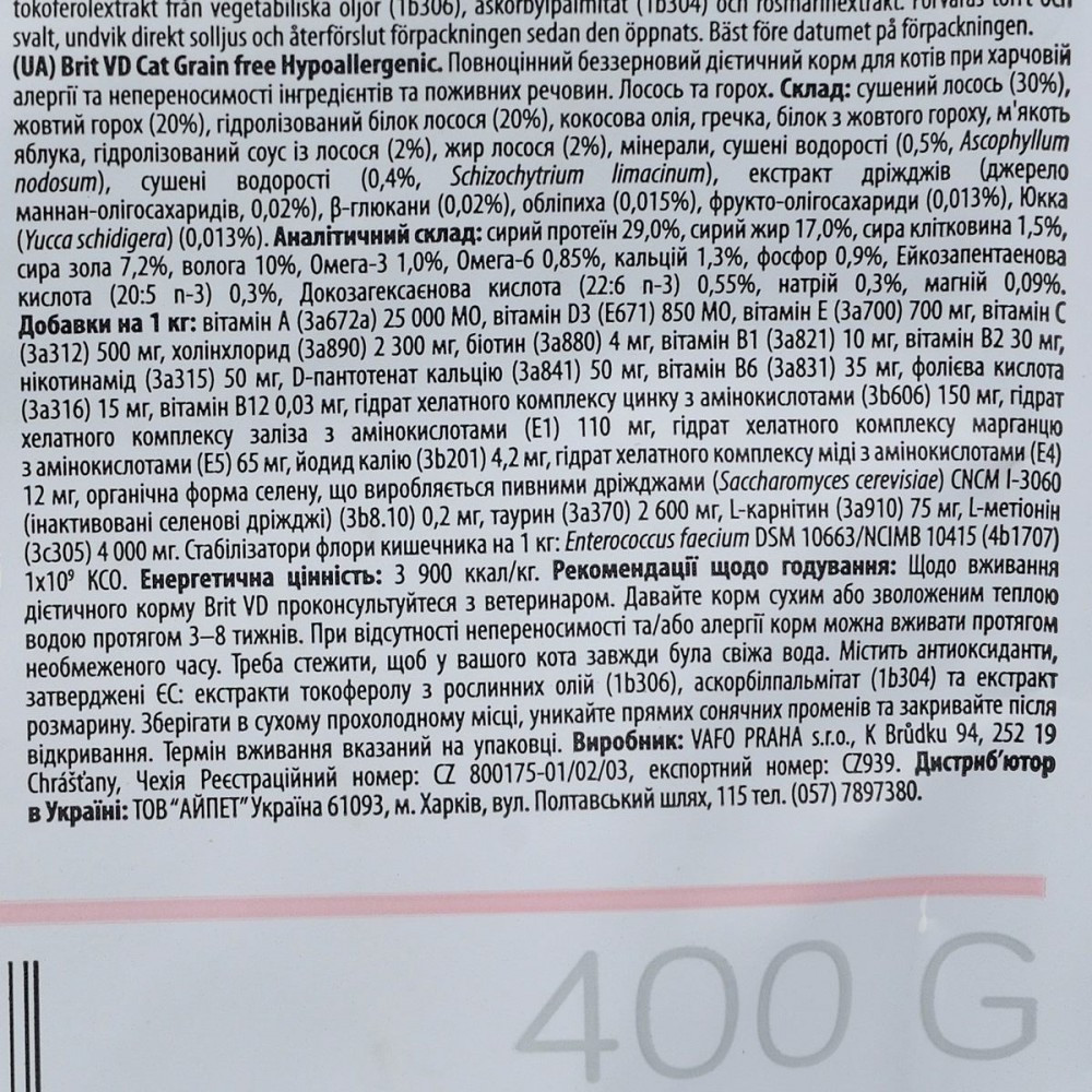 Повна і збалансована гіпоалергенна дієта для кішок з дерматологічними та шлунково-кишковими проблемами, викликаними негативними харчовими реакціями (харчова алергія/харчова непереносимість).Показання до вживання:Дієтичний повнораціонний сухий корм для котів – виключення потенційних алергенів з раціону знижує навантаження на організм та допомагає попередити харчову непереносимість.Харчова алергія з дерматологічними або шлунково-кишечними симптомами.Харчова непереносимістьАлергічний отит, атопічний дерматитПідтримка здоров’я та якості шерсті та шкіриХронічні діареї та захворювання кишківникаНормалізація процесів травної системиСпосіб використання:Усунення харчових алергічних реакцій і харчової непереносимості:Годуйте тільки Brit VD Hypoallergenic Cat і водою протягом 6–8 тижнів. Не годуйте жодним іншим кормом для тварин або харчовими продуктами для людини, закусками чи добавками.Підтримання дієти:Якщо непереносимість і/або алергія відступають, Brit VD Hypoallergenic Cat можна використовувати необмежено довго або у якості провокаційного тесту на монобілкову дієту.Склад:сушений лосось (30%), жовтий горох (20%), гідролізований білок лосося (20%), кокосова олія, гречка, білок жовтого гороху, м’якоть яблука, гідролізований соус із лосося (2%), жир лосося (2%), мінерали, сушені водорості (0,5%, Ascophyllum nodosum), сушені водорості (0,4%, Schizochytrium limacinum), екстракт дріжджів (джерело маннан-олігосахаридів, 0,02%), β-глюкани (0,02%), обліпиха (0,015%), фрукто-олігосахариди (0,013%), юка (Mojave yucca) (0,013%)Поживні речовини:сирий протеїн 29,0%, сирий жир 17,0%, сира клітковина 1,5%, сира зола 7,5%, волога 10%, Омега-3 1,0%, Омега-6 0,85%, кальцій 1,3%, фосфор 0,9%, Ейкозапентаенова кислота (20:5 n-3) 0,3%, Докозагексаєнова кислота (22:6 n-3) 0,55%, натрій 0,3%, магній 0,09%.Харчові добавки на 1 кг:вітамін A (3a672a) 25 000 МО, вітамін D3 (E671) 850 МО, вітамін E (3a700) 700 мг, вітамін C (3a312) 500 мг, холінхлорид (3a890) 2 300 мг, біотин (3a880) 4 мг, вітамін B1 (3a821) 10 мг, вітамін B2 30 мг, нікотинамід (3a315) 50 мг, D-пантотенат кальцію (3a841) 50 мг, вітамін B6 (3a831) 35 мг, фолієва кислота (3a316) 15 мг, вітамін B12 0,03 мг, гідрат хелатного комплексу цинку з амінокислотами (3b606) 150 мг, гідрат хелатного комплексу заліза з амінокислотами (E1) 110 мг, гідрат хелатного комплексу марганцю з амінокислотами (E5) 65 мг, йодид калію (3b201) 4,2 мг, гідрат хелатного комплексу міді з амінокислотами (E4) 12 мг, органічна форма селену, що виробляється пивними дріжджами (Saccharomyces cerevisiae) CNCM I-3060 (інактивовані селенові дріжджі) (3b8.10) 0,2 мг, таурин (3a370) 2 600 мг, L-карнітин (3a910) 75 мг, L-метіонін (3c305) 4 000 мг. Стабілізатори флори кишківника на 1 кг: Enterococcus faecium DSM 10663/NCIMB 10415 (4b1707) 1×109 КСО.Енергетична цінність:3 900 ккал/кгВага котаДобова норма2 кг55 г3 кг65 г4 кг70 г5 кг80 г6 кг85 г8 кг95 г10 кг100 г12 кг120 г