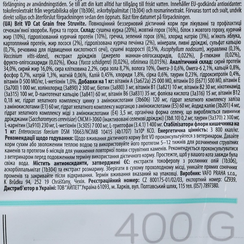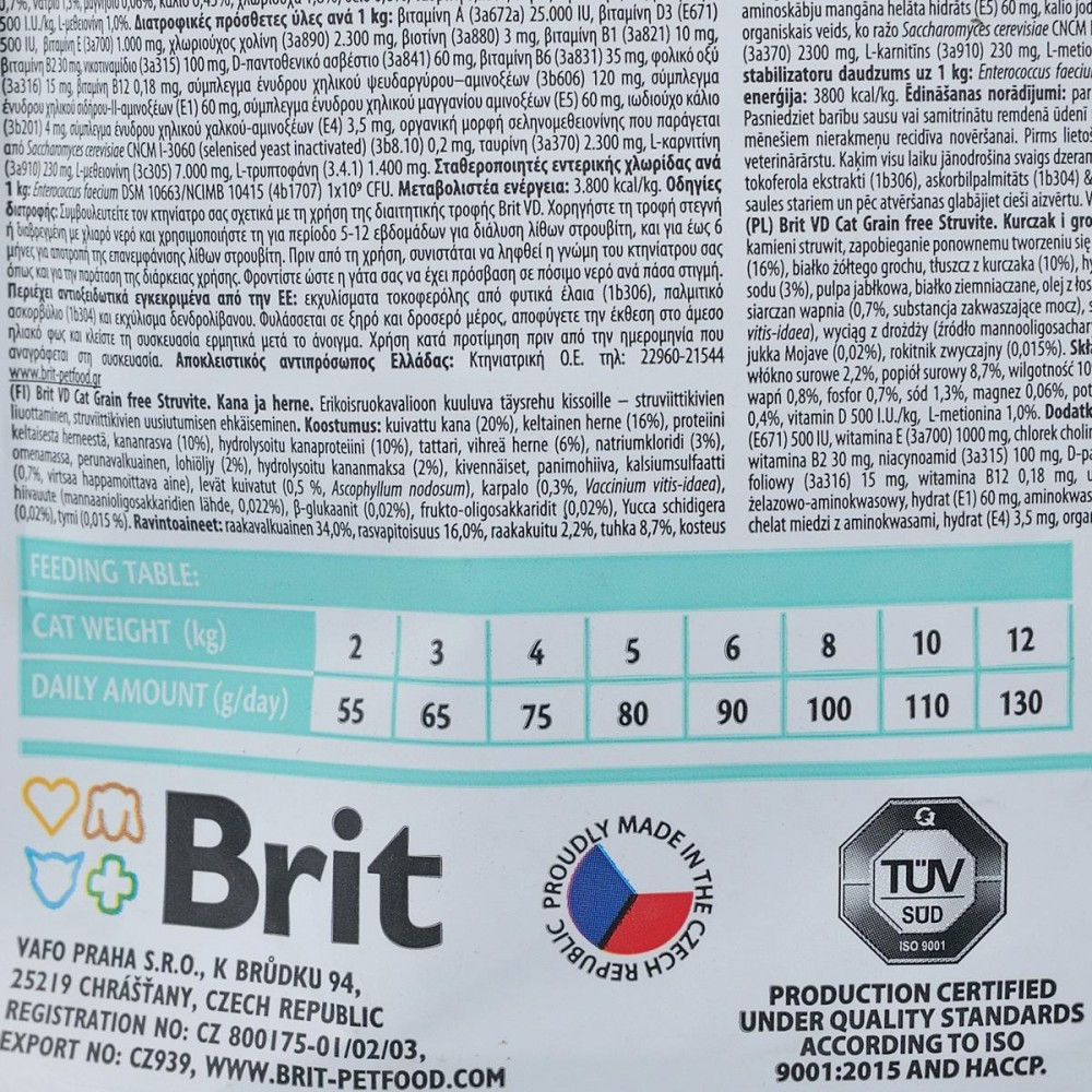 Повноцінний і збалансований дієтичний корм для лікування хвороби нижніх сечових шляхів у кішок.Показання:Цистит у котівТерапевтина частина для бактеріальної інфекції сечовивідних шляхівРозчин та попередження утворення струвітних каменівЗахист від сечосольового діатезуПротипоказання:Не використовуйте речовини, що підвищують кислотність сечіХронічне захворювання нирокХвороби серцяСпосіб використання:Розчинення струвиту:Використовуйте Brit VD Struvite Cat протягом 5–12 тижнів для розчинення струвитів. Регулярно перевіряйте цільовий рН сечі (6,2-6,4) та функцію нирки у старіючих кішокПрофілактика рецидиву утворення струвитів:Використовуйте Brit VD Struvite Cat на основі аналізу сечі протягом 6 місяців для запобігання рецидиву утворення струвитних каменів. Регулярно перевіряйте цільовий рН сечі (6,2-6,4).Склад:сушена курка (20%), жовтий горох (16%), білок жовтого гороху, курячий жир (10%), гідролізований курячий жир (10%), гречка, зелений горошок (6%), хлорид натрію (3%), м’якоть яблука, картопляний білок, жир лосося(2%),гідролізована куряча печінка (2%), мінерали, екстракт дріжджів, сульфат кальцію (0,7%, речовина для підвищення кислотності сечі), сушені водорості (0,5%, Ascophyllum nodosum), журавлина (0,3%, Vaccinium vitis-idaea), екстракт дріжджів (джерело маннан-олігосахаридів, 0,022%), β-глюкани (0,02%), фрукто-олігосахариди (0,02%), юка (Mojave yucca) (0,02%), обліпиха (0,015%).Поживні речовини:сирий протеїн 34,0%, сирий жир 16,0%, сира клітковина 2,2%, сира зола 9,2%, волога 10%, Омега-3 0,6%, Омега-6 2,1%, кальцій 0,8%, фосфор 0,7%, натрій 1,3%, магній 0,06%, Калій 0,45%, хлориди 1,8%, сірка 0,6%, таурин 0,23%, гідроксипролін 0,4%, L-метіонін 1,0%.Харчові добавки на 1 кг:вітамін A (3a672a) 25 000 МО, вітамін D3 (E671) 500 МО, вітамін E (3a700) 1 000 мг, холінхлорид (3a890) 2 300 мг, біотин (3a880) 3 мг, вітамін B1 (3a821) 10 мг, вітамін B2 30 мг, нікотинамід (3a315) 100 мг, D-пантотенат кальцію (3a841) 60 мг, вітамін B6 (3a831) 35 мг, фолієва кислота (3a316) 15 мг, вітамін B12 0,18 мг, гідрат хелатного комплексу цинку з амінокислотами (3b606) 120 мг, гідрат хелатного комплексу заліза з амінокислотами (E1) 60 мг, гідрат хелатного комплексу марганцю з амінокислотами (E5) 60 мг, йодид калію (3b201) 4 мг, гідрат хелатного комплексу міді з амінокислотами (E4) 3,5 мг, органічна форма селену, що виробляється пивними дріжджами (Saccharomyces cerevisiae) CNCM I-3060 (інактивовані селенові дріжджі) (3b8.10) 0,2 мг, таурин (3a370) 2 300 мг, L-карнітин (3a910) 230 мг, L-метіонін (3c305) 7 000 мг, L-триптофан (3.4.1) 1 400 мг. Стабілізатори флори кишківника на 1 кг: Enterococcus faecium DSM 10663/NCIMB 10415 (4b1707) 1×109 КСО.Енергетична цінність:3 800 ккал/кгВага котаДобова норма2 кг55 г3 кг65 г4 кг75 г5 кг80 г6 кг90 г8 кг100 г10 кг110 г12 кг130 г