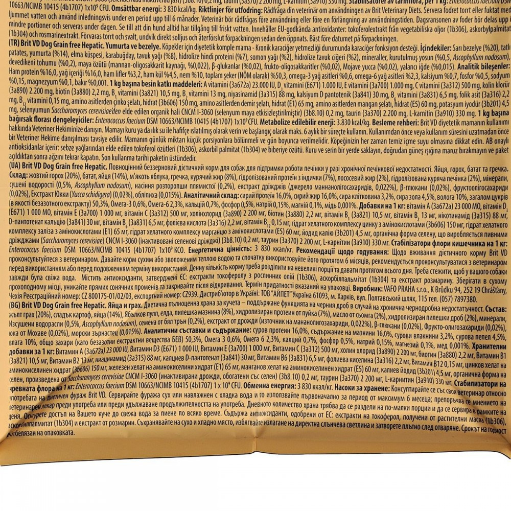 Дієтичний повнораціонний сухий корм для собак з низьким вмістом міді і білка для підтримки функції печінки при печінковій недостатності.Показання до застосування:Печінкова недостатність і пошкодження печінкиПортосистемного шунт (PSS)печінкова енцефалопатіяОдужання після інтоксикаціїПереваги:Беззернова рецептура – з низьким глікемічним індексомПомірний вміст білка тварин 16%Насіння розторопші – джерело силімарину, підтримка і регенерація клітин печінкиЯйце / гідролізований білок індички – легкопереваримой джерела білкаНизький вміст міді / високий вміст цинку – обмежує накопичення міді в тканинах печінкиЖирність 16% – більше енергії (3850 ккал / кг) в меншій кількості їжіАнтиоксиданти A, C, EЖовтий горох / гречка / солодка картопля (батат) – без глютену, з високою перевариваемостьюКелп (Ascophyllum nodosum) – природне джерело йоду, калію, сильний антиоксидант і регулятор обміну речовин, джерело Пребіотичний волокна для балансу мікрофлори кишечникаОбліпиха – антиоксидантні властивості, імунна стимуляція, протизапальну дію, ранозагоювальну діюСпосіб використання:Початковий період годування:Використовуйте Brit VD Hepatics Dog протягом 6 місяців. Щоденну кількість корму слід розділити на декілька рівних порцій і давати протягом дня. Не годуйте собаку жодним іншим кормом для тварин або харчовими продуктами для людини і закусками. У випадку хронічної печінкової недостатності корм слід використовувати протягом усього життя.Склад:жовтий горох (20%), батат, яйця (14%), м’якоть яблука, гречка, курячий жир (8%), гідролізований протеїн з індички (7%), жир лосося (2%), гідролізована куряча печінка (2%), мінерали, сушені водорості (0,5%, Ascophyllum nodosum), насіння розторопши плямистої (0,2%), екстракт дріжджів (джерело маннан-олігосахаридів, 0,022%), β-глюкани (0,02%), фрукто-олігосахариди (0,02%), юка (Mojave yucca) (0,02%), обліпиха (0,015%).Поживні речовини:сирий протеїн 16,0%, сирий жир 16,0%, сира клітковина 3,2%, сира зола 4,5%, волога 10%, загалом цукрів (в якості безазотного екстракту) 50,3%, Омега-3 0,6%, Омега-6 2,3%, кальцій 0,7%, фосфор 0,5%, натрій 0,15%, магній 0,1%, мідь 0,001%.Харчові добавки на 1 кг:вітамін A (3a672a) 23 000 MO, вітамін D3 (E671) 1 000 MO, вітамін E (3a700) 1 000 мг, вітамін C (3a312) 500 мг, холінхлорид (3a890) 2 200 мг, біотин (3a880) 2,2 мг, вітамін B1 (3a821) 10,5 мг, вітамін B2 13 мг, нікотинамід (3a315) 88 мг, D-пантотенат кальцію (3a841) 30 мг, вітамін B6 (3a831) 6,5 мг, фолієва кислота (3a316) 2,2 мг, вітамін B12 0,15 мг, гідрат хелатного комплексу цинку з амінокислотами (3b606) 150 мг, гідрат хелатного комплексу заліза з амінокислотами (E1) 65 мг, гідрат хелатного комплексу марганцю з амінокислотами (E5) 60 мг, йодид калію (3b201) 4,5 мг, органічна форма селену, що виробляється пивними дріжджами (Saccharomyces cerevisiae) CNCM I-3060 (інактивовані селенові дріжджі) (3b8.10) 0,2 мг, таурин (3a370) 2 200 мг, L-карнітин (3a910) 330 мг. Стабілізатори флори кишківника на 1 кг: Enterococcus faecium DSM 10663/NCIMB 10415 (4b1707) 1×109 КСО.Енергетична цінність:3 830 ккал/кгВага собакиДобова норма2 кг35 г5 кг80 г10 кг130 г15 кг180 г20 кг220 г25 кг260 г30 кг300 г40 кг390 г50 кг480 г60 кг550 г70 кг610 г80 кг680 г