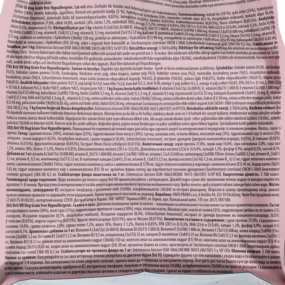 Дієтичний повнораціонний сухий корм для собак – виключення потенційних алергенів з раціону знижує навантаження на організм та допомагає попередити харчову непереносимість.Показання:Харчова алергія з дерматологічними або кишково-шлунковими симптомамиХарчова непереносимістьАлергічний отит, атопічний дерматитПідтримка здоров’я та якість шерсті та шкіриХронічні діареї та захворювання кишківникаНормалізація процесів травної системиМожливе довгострокове застосування дієтиПереваги:Беззернова рецептура – низький глікемічний індекс, оптимальне травлення, знижує ризик алергічної реакціїМонопротеїновый корм – одне джерело білку – лосося – легкозасвоюване джерело білкуГідролізований білок лосося – легкоперетравлюваний з низькою молекулярною масою (менше 5000 Da), знижує ризик виникнення алергії та харчової непереносимості.Высокий вміст омега – 3 жирних кислот (1,2%) – підтримка здоров’я шкіри та шерстіБіотин 3,5 мг / Цинк 150 мг / Вітамін С 600 мг – посилення бар’єрної функції шкіри та слизових оболонок, доведений лікувальний ефектЖовтий горох / Гречка – дієтичні безглютенові нутрієнти, гіпоалергенні дієтичні безглютенові нутрієнти, гіпоалергенні властивості, висока засвоюваністьКелп (Ascophyllum nodosum) – природнє джерело йоду, найсильніший антиоксидант та регулятор обміну речовин, джерело пребіотичного волокна для балансу мікрофлори кишківникаБЕЗ СОЇ – відсутність баластних поєднань, які порушують метаболізм та можуть провокувати розвиток алергії відсутність баластних поєднань, які порушують метаболізм та можуть провокувати розвиток алергії.Обліпиха – антиоксидантні властивості, імунна стимуляція, протизапальна та регенеруюча діяSchizochytrium limacinum – концентроване джерело DHA (докозогексаенова кислота)Спосіб використання:Усунення харчових алергічних реакцій і харчової непереносимості:Годуйте тільки Brit VD Hypoallergenic Dog і водою протягом 6–8 тижнів. Не годуйте собаку жодним іншим кормом для тварин або харчовими продуктами для людини, закусками чи добавками.Підтримання дієти:У разі нетерпимості і/або алергії припиніть використання. Brit VD Hypoallergenic Dog може використовуватися необмежено довго або у якості провокаційного тесту на монобілкову дієту.Склад:сушений лосось (30%), жовтий горох (25%), гідролізований білок лосося (18%), гречка, кокосова олія, м’якоть яблук, жир лосося(3%), гідролізований соус із лосося (2%), мінерали, сушені водорості (0,5%, Ascophyllum nodosum), сушені водорості (0,4%, Schizochytrium limacinum), екстракт дріжджів (джерело маннан-олігосахаридів, 0,02%), β-глюкани (0,02%), обліпиха (0,015%), фрукто-олігосахариди (0,013%), юка (Mojave yucca) (0,013%)Поживні речовини:сирий протеїн 27,0%, сирий жир 14,0%, сира клітковина 2,0%, сира зола 7,2%, волога 10%, Омега-3 1,2%, Омега-6 0,85%, Ейкозапентаенова кислота (20:5 n-3) 0,3%, Докозагексаєнова кислота (22:6 n-3) 0,4%, кальцій 1,2%, фосфор 0,9%, натрій 0,5%, магній 0,1%.Харчові добавки на 1 кг:вітамін A (3a672a) 26 000 MO, вітамін D3 (E671) 1 800 MO, вітамін E (3a700) 1 000 мг, вітамін C (3a312) 600 мг, холінхлорид (3a890) 750 мг, біотин (3a880) 3,5 мг, вітамін B1 (3a821) 2,5 мг, вітамін B2 9,5 мг, нікотинамід (3a315) 32 мг, D-пантотенат кальцію (3a841) 25 мг, вітамін B6 (3a831) 2,5 мг, фолієва кислота (3a316) 1,3 мг, вітамін B12 0,12 мг, гідрат хелатного комплексу цинку з амінокислотами (3b606) 150 мг, гідрат хелатного комплексу заліза з амінокислотами (E1) 90 мг, гідрат хелатного комплексу марганцю з амінокислотами (E5) 45 мг, йодид калію (3b201) 0,85 мг, гідрат