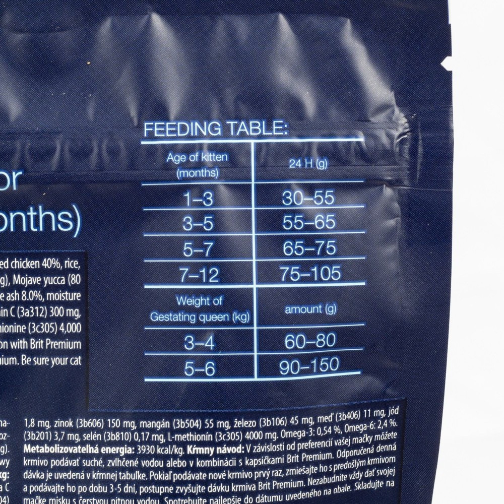 Повноцінний корм преміумкласу для кошенят (1–12 місяців), а також для вагітних або годуючих кішок.Смачний і апетитний корм з м’ясом курки та цінними натуральними інгредієнтами для щоденного здорового харчування вашого улюбленця.Особливості корму:Для сильному імунітету з перших днів життяДля правильного зростання, що стане фундаментом здорового і тривалого життяДля розвитку м’язів і міцних кісткокЗ м’якоттю яблука — натуральним джерелом клітковиниЗ розмарином, гвоздикою, куркумою і цитрусовими — природними антиоксидантамиЗ пребіотиками для делікатного та здорового травлення та для відмінного засвоєння всіх компонентівБЕЗ пшениці БЕЗ сої БЕЗ кукурудзиСклад:курка дегідрована 40%, рис, курячий жир, горох, лосось дегідрований 4%, сушена яблучна м’якоть, гідролізована куряча печінка 2%, лососеве масло 2%, сушений шпинат 0,5%, мананолігосахариди (150 мг/кг), фруктоолігосахаріди (120 мг/кг), Юка Шидігера (80 мг/кг), сушений розмарин (12 мг/кг), сушена гвоздика (12 мг/кг), сушені цитрусові (12 мг/кг), сушена куркума (12 мг/кг).Аналітичні компоненти:сирий білок 40,0%, сирий жир 18,0%, вологість 2,8%, сира зола 8,0%, сира клітковина 10,0%, кальцій 1,4%, фосфор 1,0%, натрій 0,5%, магній 0,1%.Харчові добавки на 1 кг:вітамін А (3a672a) 22000 МО, вітамін D3 (3a671) 900 МО, вітамін E (3a700) 700 мг, вітамін C (3a312) 300 мг, таурин (3a370) 2300 мг, біотин (3a880) 1,8 мг, цинк (3b606) 150 мг, марганець (3b504) 55 мг, залізо (3b106) 45 мг, мідь (3b406) 11 мг, йод (3b201) 3,7 мг, селен (3b810) 0,17 мг, L -метіонін (3c305) 4000 мг. Омега-3: 0,54%, Омега -6: 2,4%.Енергетична цінність:3 930 ккал/кг.Вік кошеняти, місДобова норма, г1-330-553-555-655-765-757-1275-105Вага кішки, кгДобова норма, г3-460-805-690-150