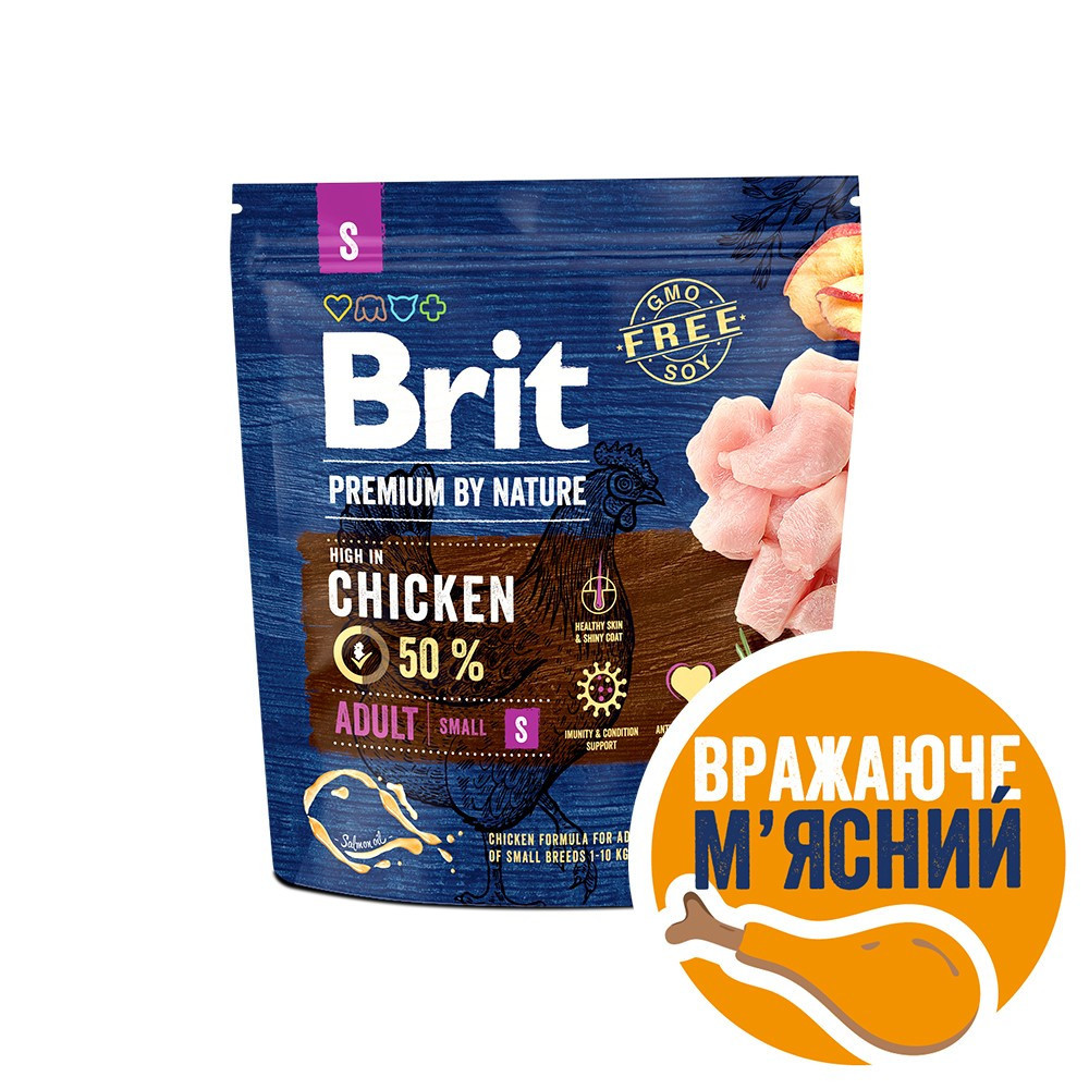 Brit Premium by Nature Adult S – досконала формула з курячим м’ясом для дорослих собак малих порід (1-10 кг).Здорова шкіра та блискуча шерстьСприяє захисту від стресу та підтримує роботу серцяПідтримка імунітету та загального самопочуттяПівпакета куркиКращий смак і засвоюваністьКолаген, мідія зелена новозеландська та панцири ракоподібних для суглобів і хрящівВисокий рівень омега-3 для здорового серця, здорової шкіри та блискучої шерстіФрукти і трави для хорошого травлення та імунітетуСклад:курятина 50% (дегідратована 30%, очищена від кісток 20%), овес, пшениця, курячий жир (консервований сумішшю токоферолів), кукурудза, сушені яблука, лососеве масло (2%), гідролізована куряча печінка, пивні дріжджі, колаген, панцири ракоподібних (джерело глюкозаміну, 210 мг/кг), хрящі (джерело хондроїтину, 150 мг/кг), трави та фрукти (гвоздика, цитрусові, розмарин, куркума, 120 мг/кг), мананолігосахариди (120 мг/кг), фруктоолігосахариди (90 мг/кг), юка Шидігера (90 мг/кг), сушена ромашка (80 мг/кг), новозеландські зелені мідії (джерело глікозаміногліканів, 50 мг/кг), сушена лохина (50 мг/кг).Аналітичні компоненти:сирий білок 28,0 %, вміст жирів 16,0 %, волога 10,0 %, сира зола 7,2 %, сира клітковина 2,5 %, кальцій 1,5 %, фосфор 1,1 %, омега 3 0,2 %, омега 6 1,85 %.Харчові добавки на 1 кг:вітамін A (3a672a) 15 000 МО, вітамін D3 (E671) 1 000 МО, вітамін E (a-токоферол) (3a700) 400 мг, біотин (3a880) 0,5 мг, холінхлорид (3a890) 500 мг, гідрат хелатний комплекс цинку з амінокислотами (3b606) 70 мг, гідрат хелатний комплекс заліза з амінокислотами (Е1) 60 мг, гідрат хелатний комплекс марганцю з амінокислотами (Е5) 30 мг, йодид калію (3b201) 0,5 мг, гідрат хелатний комплекс міді з амінокислотами (Е4) 12 мг, органічна форма селену, що виробляється Saccaromyces cerevisiae CNCM I-3060 (інактивовані селенові дріжджі) (3b8.10) 0,2 мг.Енергетична цінність:3 820 ккал/кгВага собаки, кгДобова норма, г12034557078510120
