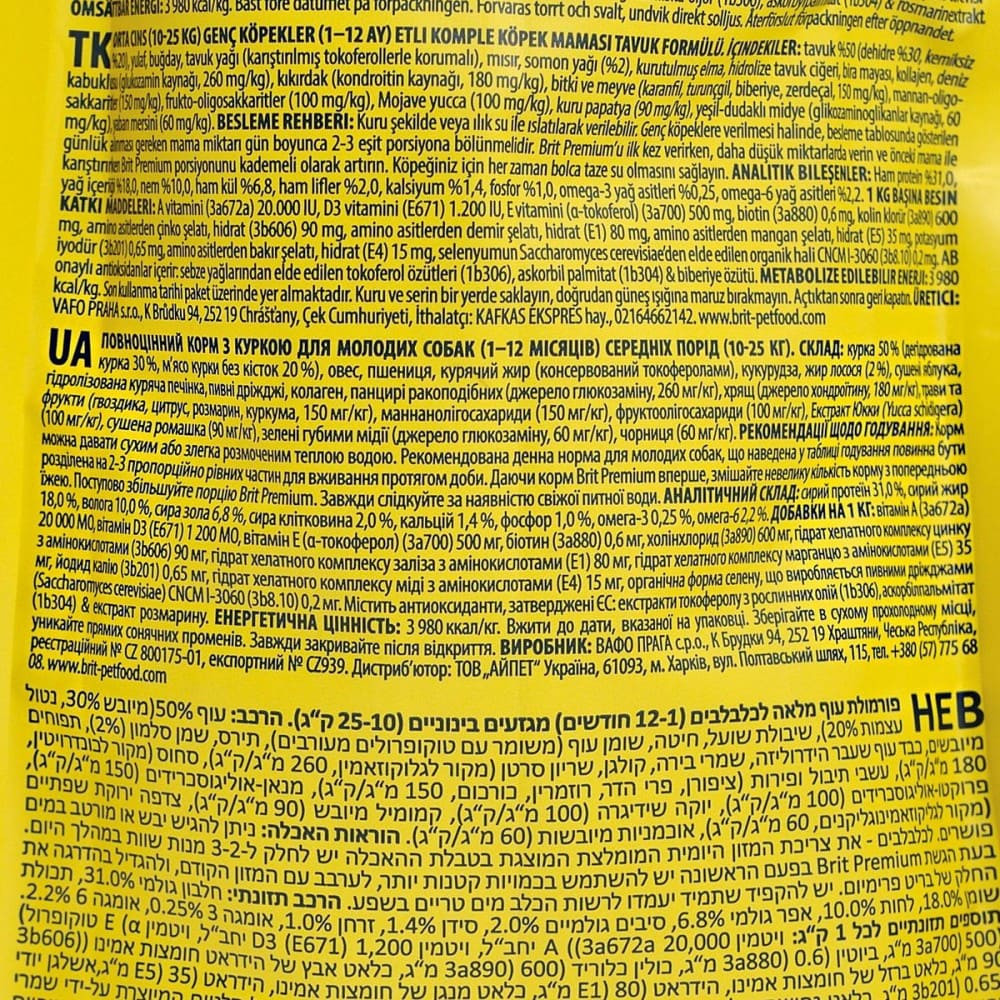 Brit Premium by Nature Junior М – досконала формула з курячим м’ясом для молодих собак (1- 12 місяців) середніх порід (10-25 кг).Здоровий розвиток скелета, кісток, суглобів, зубівОптимальний ріст тіла та м’язівПрекрасна засвоюваністьПідтримка імунітету та загального самопочуттяПівпакета куркиКращий смак і засвоюваністьКолаген, мідія зелена новозеландська та панцири ракоподібних для суглобів і хрящівВисокий рівень омега-3 для здорового серця, здорової шкіри та блискучої шерстіФрукти і трави для хорошого травлення та імунітетуСклад:курятина 50% (дегідратована 30%, очищена від кісток 20%), овес, пшениця, курячий жир (консервований сумішшю токоферолів), лососеве масло (2%), кукурудза, сушені яблука, гідролізована куряча печінка, пивні дріжджі, колаген, панцири ракоподібних (джерело глюкозаміну, 260 мг/кг), хрящі (джерело хондроїтину, 180 мг/кг), трави та фрукти (гвоздика, цитрусові, розмарин, куркума, 150 мг/кг), мананолігосахариди (150 мг/кг), фруктоолігосахариди (100 мг/кг), юка Шидігера (100 мг/кг), сушена ромашка (90 мг/кг), новозеландські зелені мідії (джерело глікозаміногліканів, 60 мг/кг), сушена лохина (60 мг/кг).Аналітичні компоненти:сирий білок 31,0 %, вміст жирів 18,0 %, волога 10,0 %, сира зола 6,8 %, сира клітковина 2,0 %, кальцій 1,4 %, фосфор 1,0 %, омега 3 0,25 %, омега 6 2,2 %.Харчові добавки на 1 кг:вітамін A (3a672a) 20 000 МО, вітамін D3 (E671) 1200 МО, вітамін E (a-токоферол) (3a700) 500 мг, біотин (3a880) 0,6 мг, холінхлорид (3a890) 600 мг, гідрат хелатний комплекс цинку з амінокислотами (3b606) 90 мг, гідрат хелатний комплекс заліза з амінокислотами (Е1) 80 мг, гідрат хелатний комплекс марганцю з амінокислотами (Е5) 35 мг, йодид калію (3b201) 0,65 мг, гідрат хелатний комплекс міді з амінокислотами (Е4) 15 мг, органічна форма селену, що виробляється Saccaromyces cerevisiae CNCM I-3060 (інактивовані селенові дріжджі) (3b8.10) 0,2 мг.Енергетична цінність:3 980 ккал/кгВік, місяціВага дорослого собаки, кг10152025Добова норма, г1-2801001351452-3901101401503-41201501802304-61301802102506-12120170210250