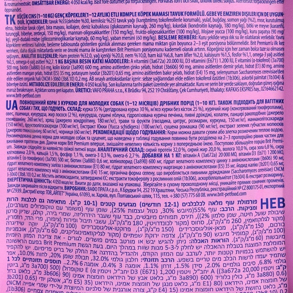 Brit Premium by Nature Junior S – досконала формула з курячим м’ясом для дорослих собак малих порід (1-10 кг).Оптимальний ріст тіла і м’язівЗдоровий розвиток скелета, кісток, суглобів і зубівПідходить і для вагітних та годуючих сукПідтримка імунітету та загального самопочуттяПівпакета куркиКращий смак і засвоюваністьКолаген, мідія зелена новозеландська та панцири ракоподібних для суглобів і хрящівВисокий рівень омега-3 для здорового серця, здорової шкіри та блискучої шерстіФрукти і трави для хорошого травлення та імунітетуСклад:курятина 55% (дегідратована 30%, очищена від кісток 25%), курячий жир (консервований сумішшю токоферолів), овес, пшениця, лососеве масло (2%), кукурудза, сушені яблука, гідролізована куряча печінка, пивні дріжджі, колаген, панцири ракоподібних (джерело глюкозаміну, 260 мг/кг), хрящі (джерело хондроїтину, 180 мг/кг), трави та фрукти (гвоздика, цитрусові, розмарин, куркума, 150 мг/кг), мананолігосахариди (150 мг/кг), фруктоолігосахариди (100 мг/кг), юка Шидігера (100 мг/кг), сушена ромашка (90 мг/кг), новозеландські зелені мідії (джерело глікозаміногліканів, 60 мг/кг), сушена лохина (60 мг/кг).Аналітичні компоненти:сирий білок 32,0 %, вміст жирів 20,0 %, волога 10,0 %, сира зола 6,8 %, сира клітковина 2,0 %, кальцій 1,5 %, фосфор 1,1 %, омега 3 0,3 %, омега 6 2,7 %.Харчові добавки на 1 кг:вітамін A (3a672a) 20 000 МО, вітамін D3 (E671) 1 200 МО, вітамін E (a-токоферол) (3a700) 500 мг, біотин (3a880) 0,6 мг, холінхлорид (3a890) 600 мг, гідрат хелатний комплекс цинку з амінокислотами (3b606) 90 мг, гідрат хелатний комплекс заліза з амінокислотами (Е1) 80 мг, гідрат хелатний комплекс марганцю з амінокислотами (Е5) 35 мг, йодид калію (3b201) 0,65 мг, гідрат хелатний комплекс міді з амінокислотами (Е4) 15 мг, органічна форма селену, що виробляється Saccaromyces cerevisiae CNCM I-3060 (інактивовані селенові дріжджі) (3b8.10) 0,2 мг.Енергетичнацінність: 4050 ккал/кгВік, місяціВага дорослого собаки, кг135710Добова норма, г1-315304560803-4204570901104-6254570901106-1220406585105