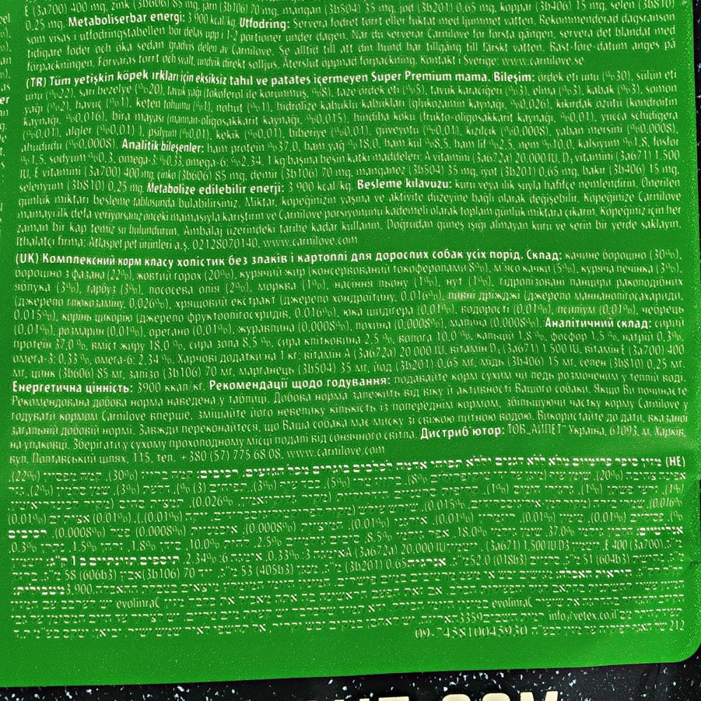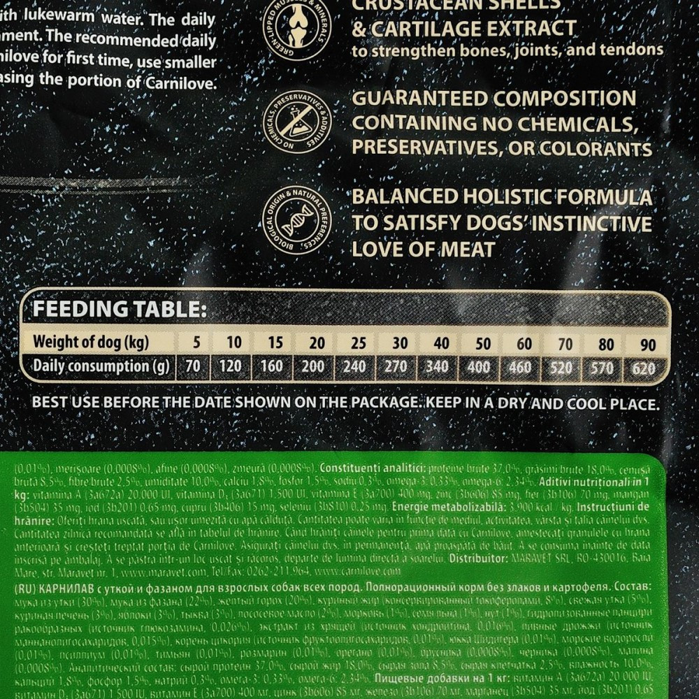 Carnilove Duck & Pheasant для дорослих розроблено з урахуванням спеціальних потреб дорослих собак, аби забезпечити збалансований раціон і надходження поживних речовин, необхідних для здоров’я кісток, суглобів та підтримання нормального тиску крові.Качка— це ідеальне джерело білків з високим вмістом поліненасичених жирних кислот (ПНЖК), які знижують рівень холестерину в крові. М’ясо качки — це фантастичне джерело ніацину (вітаміну В3), який відіграє важливу роль у процесах обміну речовин в організмі, а також допомагає знизити рівень холестерину в крові.Качкамістить вітаміни А і С, а також важливі мінерали, такі як залізо, кальцій і селен, тоді як фазан є чудовим джерелом вітаміну В12, фосфору і селену. Поєднання м’яса качки і фазана дозволило створити дієтично збалансований і поживний продукт, що містить всі незамінні амінокислоти.Склад: борошно з м’яса качки (30%), борошно з м’яса фазана (22%), жовтий горох (20%), курячий жир (консервований токоферолами, 8%), свіжа качка (5%), куряча печінка (3%), яблука (3%), тапіоковий крохмаль (3%), лососева олія (2%), морква (1%), насіння льону (1%), нут (1%), гідролізовані панцири ракоподібних (джерело глюкозаміну, 0,026%), хрящовий екстракт (джерело хондроітину, 16%), пивні дріжджі (джерело маннанолігосахаридів, 0,015%), коріння цикорію (джерело фруктоолігосахаридів, 0,01%), екстракт юкки Шидігера (0,01%), водорості (0,01%), подорожник (0,01%), чебрець (0,01%), розмарин (0,01%), орегано (0,01%), журавлина (0,0008%), лохина (0,0008%), малина (0,0008%).Харчові добавки на 1 кг:вітамін A (3b406) 20 000 МО, вітамін D3 (3a671) 1 500 МО, вітамін E (3a700) 400 мг, цинк (3b606) 85 мг, залізо (3b106) 70 мг, марганець (3b504) 35 мг, йод (3b201) 0,65 мг, мідь (3b406) 15 мг, селен (3b810) 0,25 мгАналітичний склад на 1 кг:сирий протеїн 37,0 %, вміст жиру 18,0 %, волога 10,0 %, сира зола 8,5 %, сира клітковина 2,5 %, кальцій 1,8 %, фосфор 1,5 %, натрій 0,3 %.Калорійність:3 900 ккал/кг Омега 3: 0,33% Омега 6: 2,34%Рекомендації щодо дозуваннязазначені на упаковці, обов’язково забезпечте вихованця порцією питної води.Вага собаки (кг)51015202530405060708090Добова норма (г/день)70120160200240270340400460520570620