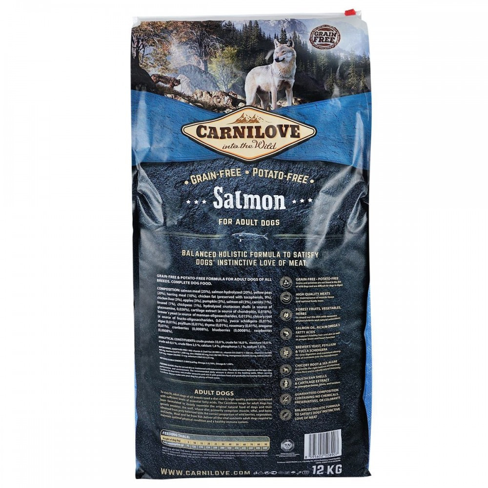 Carnilove Salmon для дорослих розроблено з урахуванням спеціальних потреб дорослих собак, аби забезпечити надходження поживних речовин, необхідних для здоров’я і блиску шерсті і належного функціонування нервової системи.Лосось— чудове джерело легкозасвоюваних білків, має протизапальні властивості. Він містить велику кількість ненасичених жирних кислот омега-3, які позитивно впливають на розумовий розвиток, серцево-судинну систему та обмін речовин (знижують рівень цукру в крові).Лососьтакож сприяє попередженню дегенеративних захворювань очей, а його жир покращує якість і зовнішній вигляд шерсті і шкіри.Склад: борошно з м’яса лосося (25%), гідролізований лосось (20%), жовтий горох (20%), борошно з м’яса оселедця (10%), курячий жир (консервований токоферолами, 9%), куряча печінка (3%), яблука (3%), тапіоковий крохмаль (3%), лососева олія (3%), морква (1%), насіння льону (1%), нут (1%), гідролізовані панцири ракоподібних (джерело глюкозаміну, 0,026%), хрящовий екстракт (джерело хондроітину, 0,016%), пивні дріжджі (джерело маннанолігосахаридів, 0,015%), коріння цикорію (джерело фруклоолігосахаридів, 0,01%), екстракт юкки Шидігера (0,01%), водорості (0,01%), подорожник (0,01%), чебрець (0,01%), розмарин (0,01%), орегано (0,01%), журавлина (0,0008%), лохина (0,0008%), малина (0,0008%).Харчові добавки на 1 кг:вітамін A (3a672a) 20 000 МО, вітамін D3 (3a671) 1 500 МО, вітамін E (3a700) 400 мг, цинк (3b606) 85 мг, залізо (3b106) 70 мг, марганець (3b504) 35 мг, йод (3b201) 0,65 мг, мідь (3b406) 15 мг, селен (3b810) 0,25 мгАналітичний склад на 1 кг:сирий протеїн 33,0 %, вміст жиру 16,0 %, волога 10,0 %, сира зола 8,5 %, сира клітковина 2,5 %, кальцій 1,4 %, фосфор 1,1 %, натрій 1,0 %Калорійність:3 800 ккал/кг Омега 3: 0,70% Омега 6: 1,98%.Рекомендації щодо дозуваннязазначені на упаковці, обов’язково забезпечте вихованця порцією питної води.Вага собаки (кг)51015202530405060708090Добова норма (г/день)75125170210250280350420470530590640
