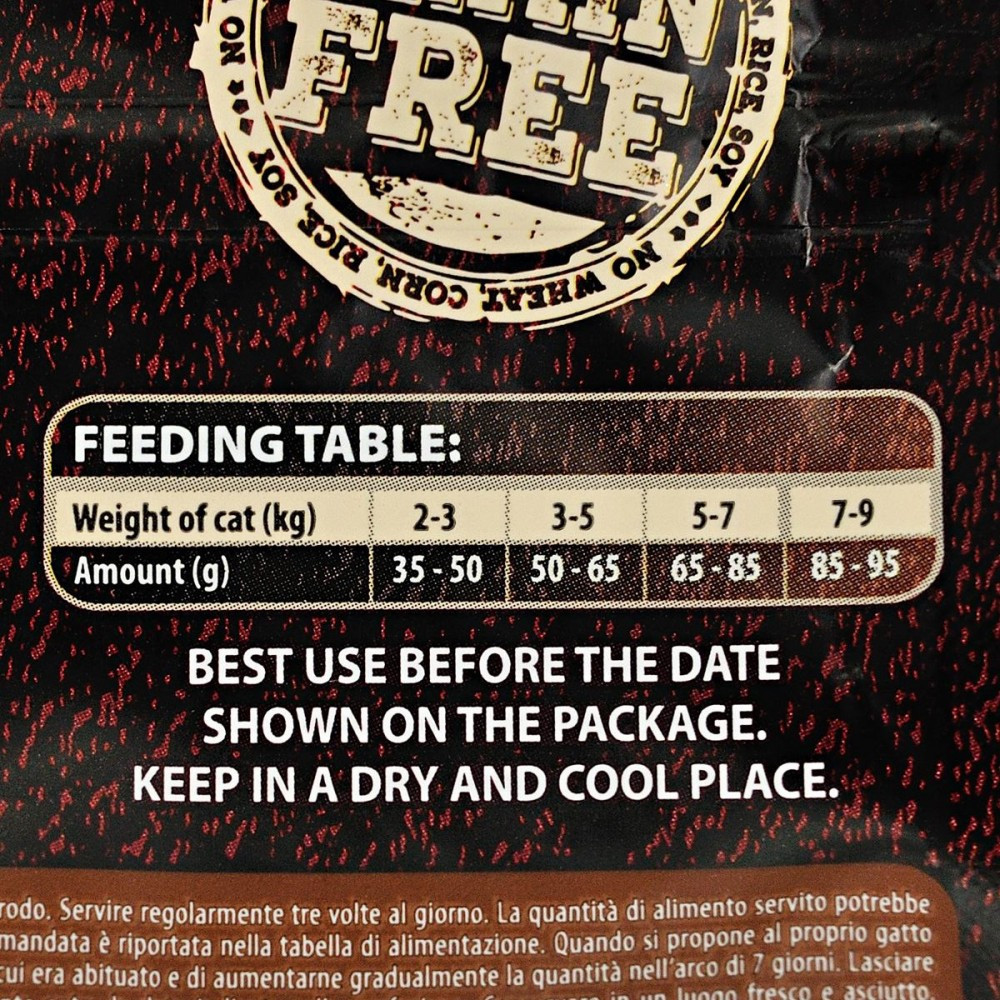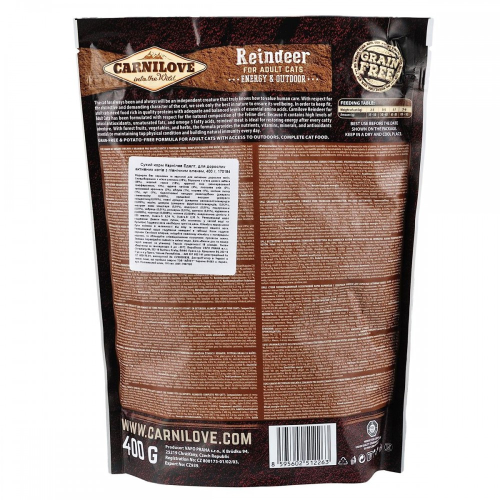 Аби зберегти відмінну форму, дорослим котам потрібна якісна білкова їжа зі збалансованим рівнем незамінних амінокислот. Carnilove Reindeer для дорослих котів розроблено з урахуванням природного раціону котів у дикій природі. М’ясо північного оленя містить багато натуральних антиоксидантів, ненасичених жирів, а також жирних кислот омега-3 і є ідеальним джерелом нової енергії після щоденних пригод вашого улюбленця.Корм містить лісові плоди, овочі та трави, щоденно забезпечуючи ваших улюбленців поживними речовинами, вітамінами, мінералами та антиоксидантами, необхідними для підтримання відмінної фізичної форми і чудового природного імунітету.Оленина та кабан -прерасне джерело енергії та вітамінів. З таким кормом вихованець завжди матиме сили для активності і буде забезпечений запасом поживних речовин.Склад: борошно з м’яса оленини (28%), борошно з м’яса дикого кабана (28%), жовтий горох (18%), курячий жир (консервований токоферолами, 13%), куряча печінка (4%), лососева олія (2%), тапіоковий крохмаль (2%), яблука (1%), морква (1%), насіння льону (1%), нут (1%), гідролізовані панцири ракоподібних (джерело глюкозаміну 0,026%), хрящовий екстракт (джерело хондроїтину,0,016%), пивні дріжджі (джерело маннан-олігосахаридів (0,016%), корінь цикорію (джерело фрукто-олігосахаридів, 0,012%), екстракт юкки Шидігера (0,01%), водорості (0,01%), подорожник (0,01%), чебрець (0,01%), розмарин (0,01%), орегано (0,01%), журавлина (0,0008%), чорниця (0,0008%), малина (0,0008%).Харчові добавки на 1 кг:вітамін A (3a672a) 23 000 МО, вітамін D3 (3a671) 940 МО, вітамін E (3a700) 650 мг, вітамін C (3a312) 300 мг, таурин (3a370) 2 400 мг, холіну хлорид (3a890) 2 200 мг, L-карнітин (3a910) 65 мг, ніацинамід (3a315) 45 мг, біотин (3a880) 1,8 мг, цинк (3b606) 150 мг, залізо (3b106) 48 мг, марганець (E5) 55 мг, йод (3b201) 3,8 мг, мідь (3b406) 11 мг, селен (3b810) 0,23 мг, L-метіонин (3c305) 14 мг, аргінін (3c3.6.1) 12 мг, L-лізин (3.2.3.) 10 мг.Аналітичний склад на 1 кг:сирий протеїн 41,0 %, вміст жиру 19,0 %, волога 10,0 %, сира зола 5,5 %, сира клітковина 2,5 %, кальцій 1,1 %, фосфор 0,9 %, натрій 0,3 %, магній 0,08 %.Енергетична цінність:4 050 ккал/кг, Омега-3: 0,34 %, Омега-6: 2,35 %.Рекомендації щодо дозуваннязазначені на упаковці, обов’язково забезпечте вихованця порцією питної води.Вага кота (кг)2-33-55-77-9Добова норма (г)35-5050-6565-8585-95