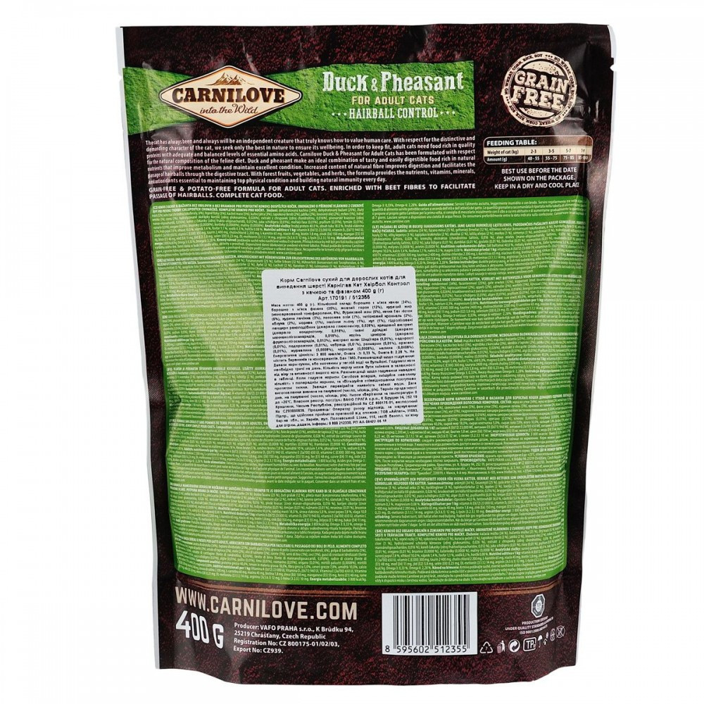 Корм сухий Carnilove Cat Hairball Controll для дорослих котів для виведення шерстяних грудочок з качкою та фазаном 400 г