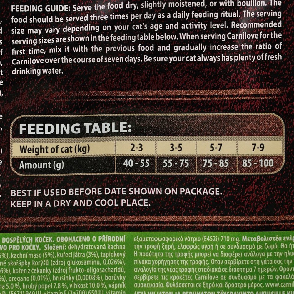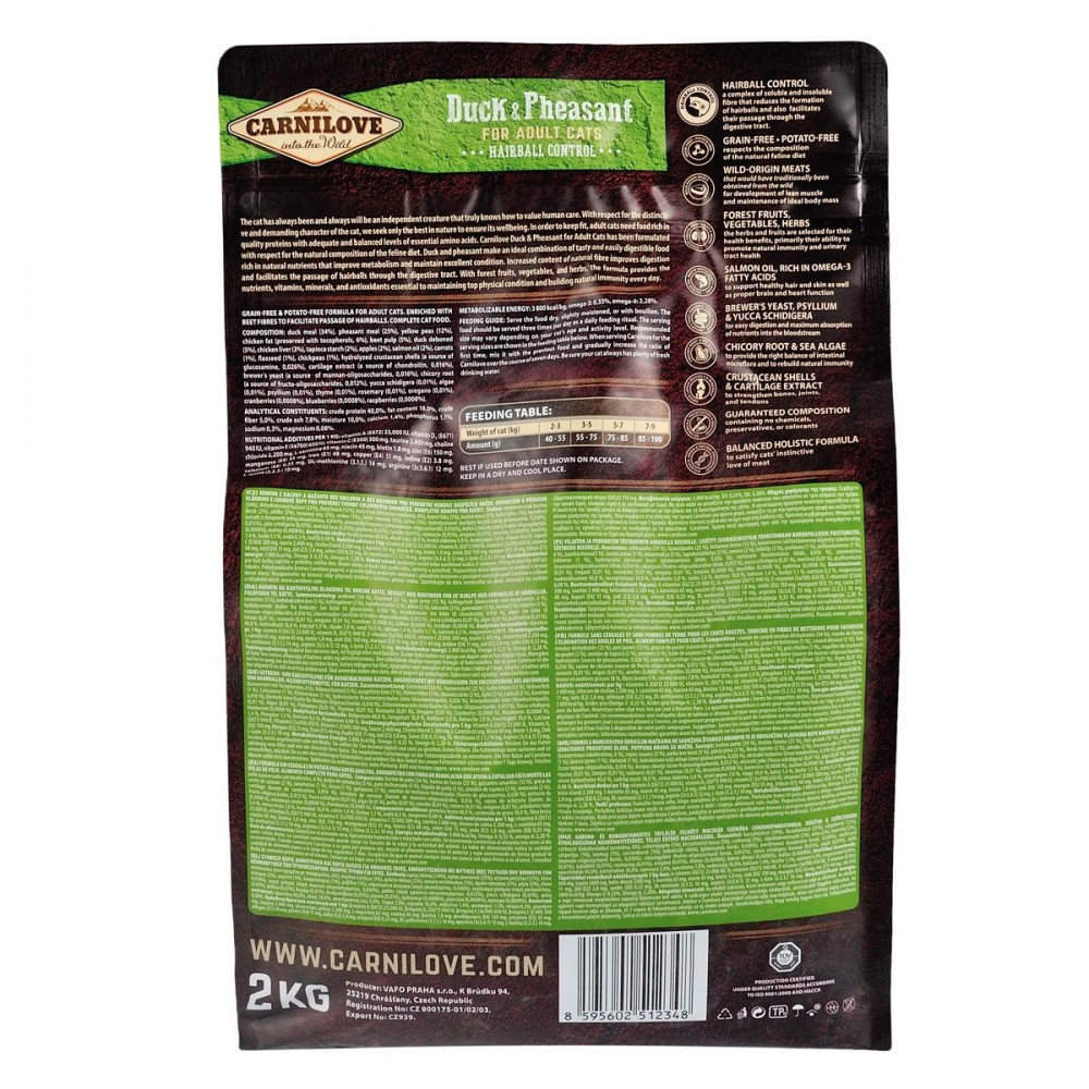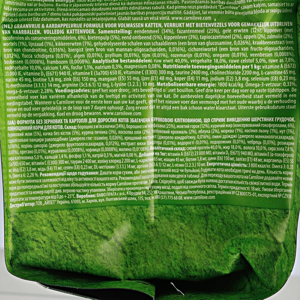 Формула без зернових та картоплі для дорослих котів збагачена буряковою клітковиною, що сприяє виведенню шерстяних грудочок.Аби зберегти відмінну форму, дорослим котам потрібна якісна білкова їжа зі збалансованим рівнем незамінних амінокислот. Carnilove Duck & Pheasant для дорослих котів розроблено з урахуванням природного раціону котів у дикій природі.Качка та фазан— ідеальне поєднання смачної та легкозасвоюваної їжі, що багата на природні поживні речовини і сприяє покращенню метаболізму і підтриманню відмінної фізичної форми. Підвищений вміст натуральної клітковини покращує травлення та полегшує проходження кульок шерсті через травний тракт. Корм містить лісові плоди, овочі та трави, щоденно забезпечуючи ваших улюбленців поживними речовинами, вітамінами, мінералами та антиоксидантами, необхідними для підтримання відмінної фізичної форми і чудового природного імунітету.Склад: борошно з м’яса качки (34%), борошно з м’яса фазана (25%), жовтий горох (12%), курячий жир (консервований токоферолами, 6%), буряковий жом (5%), качка без кісток (5%), куряча печінка (3%), лососева олія (2%), тапіоковий крохмаль (2%), яблука (2%), морква (1%), насіння льону (1%), нут (1%), гідролізовані панцири ракоподібних (джерело глюкозаміну, 0,026%), хрящовий екстракт (джерело хондроїтину, 0,016%), пивні дріжджі (джерело маннан-олігосахаридів, 0,016%), корінь цикорію (джерело фрукто-олігосахаридів, 0,012%), екстракт юкки Шидігера (0,01%), водорості (0,01%), подорожник (0,01%), чебрець (0,01%), розмарин (0,01%), орегано (0,01%), журавлина (0,0008%), чорниця (0,0008%), малина (0,0008%).Харчові добавки на 1 кг:вітамін A (3a672a) 23 000 МО, вітамін D3 (3a671) 940 МО, вітамін E (3a700) 650 мг, вітамін C (3a312) 300 мг, таурин (3a370) 2 400 мг, холіну хлорид (3a890) 2 200 мг, L-карнітин (3a910) 65 мг, ніацинамід (3a315) 45 мг, біотин (3a880) 1,8 мг, цинк (3b606) 150 мг, залізо (3b106) 48 мг, марганець (E5) 55 мг, йод (3b201) 3,8 мг, мідь (3b406) 11 мг, селен (3b810) 0,23 мг, L-метіонин (3c305) 14 мг, аргінін (3c3.6.1) 12 мг, L-лізин (3.2.3.) 10 мг.Аналітичні складові:сирий протеїн 40,0 %, вміст жиру 18,0 %, волога 10,0 %, сира зола 7,8 %, сира клітковина 5,0 %, кальцій 1,4 %, фосфор 1,1 %, натрій 0,3 %, магній 0,08 %.Енергетична цінність:3 800 ккал/кг, Омега -3: 0,33 %, Омега-6: 2,28 %.Рекомендації щодо дозуваннязазначені на упаковці, обов’язково забезпечте вихованця порцією питної води.Вага кота (кг)2-34-56-78-9Добова норма (г)40-5555-7575-8585-100