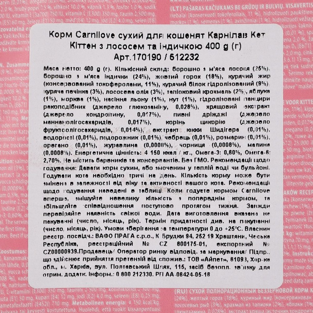 Для кошенят вкрай важливо вибирати корм з багатим вмістом білків, жирів, вітамінів, а також поживних речовин, необхідних для здорового росту і оптимального фізичного розвитку.Корм Carnilove Salmon & Turkeyдля кошенят створений з урахуванням природного раціону кішок в дикій природі. Основа корму – лосось і індичка, джерела незамінних амінокислот. У складі корму також міститься комбінація лісових фруктів, овочів і трав, які щодня є джерелами необхідних поживних речовин, вітамінів, мінералів і антиоксидантів для здорового розвитку скелета, м’язів і імунної системи.Лосось- це комбінація неймовірного смаку, вітамінів і поживних речовин. Лосось сприяє прекрасному самопочуттю вихованця, надає шерсті блиску та укріплює здоров’я і імунітет, а індичка укріпляє організм та забезпечує здоровий ріст та розвиток.Склад: борошно з м’яса лосося (25%), борошно з м’яса індички (24%), жовтий горох (18%), курячий жир (консервований токоферолами, 11%), курячий білок гідролізований (9%), куряча печінка (3%), лососева олія (3%), тапіоковий крохмаль (2%), яблука (1%), морква (1%), насіння льону (1%), нут (1%), гідролізовані панцири ракоподібних (джерело глюкозаміну, 0,028%), хрящовий екстракт (джерело хондроїтину, 0,017%), пивні дріжджі (джерело маннан-олігосахаридів, 0,017%), корінь цикорію (джерело фрукто-олігосахаридів, 0,014%), екстракт юкки Шидігера (0,01%), водорості (0,01%), подорожник (0,01%), чебрець (0,01%), розмарин (0,01%), орегано (0,01%), журавлина (0,0008%), чорниця (0,0008%), малина (0,0008%).Харчові добавки на 1 кг:вітамін A (3a672a) 25 000 МО, вітамін D3 (3a671) 1 000 МО, вітамін E (3a700) 750 мг, вітамін C (3a312) 350 мг, таурин (3a370) 2 500 мг, холіну хлорид (3a890) 2 300 мг, L-карнітин (3a910) 70 мг, ніацинамід (3a315) 50 мг, біотин (3a880) 2 мг, цинк (3b606) 160 мг, залізо (3b106) 50 мг, марганець (3b504) 60 мг, йод (3b201) 4,0 мг, мідь (3b406) 12 мг, селен (3b810) 0,28 мг, L-метіонин (3c305) 15 мг, аргінін (3c3.6.1) 13 мг, L-лізин (3.2.3.) 11 мг.Аналітичний склад на 1 кг:сирий протеїн 40,0 %, вміст жиру 20,0 %, волога 10,0 %, сира зола 7,5 %, сира клітковина 2,0 %, кальцій 1,3 %, фосфор 1,0 %, натрій 0,5 %, магній 0,08 %.Енергетична цінність: 4 150 ккал/кг, Омега-3: 0,60%, Омега-6: 2,70%.Рекомендації щодо дозуваннязазначені на упаковці, обов’язково забезпечте вихованця порцією питної води.Вік кошеняти (місяці)1-44-77-12Добова норма (г/день)25-4545-6060-100