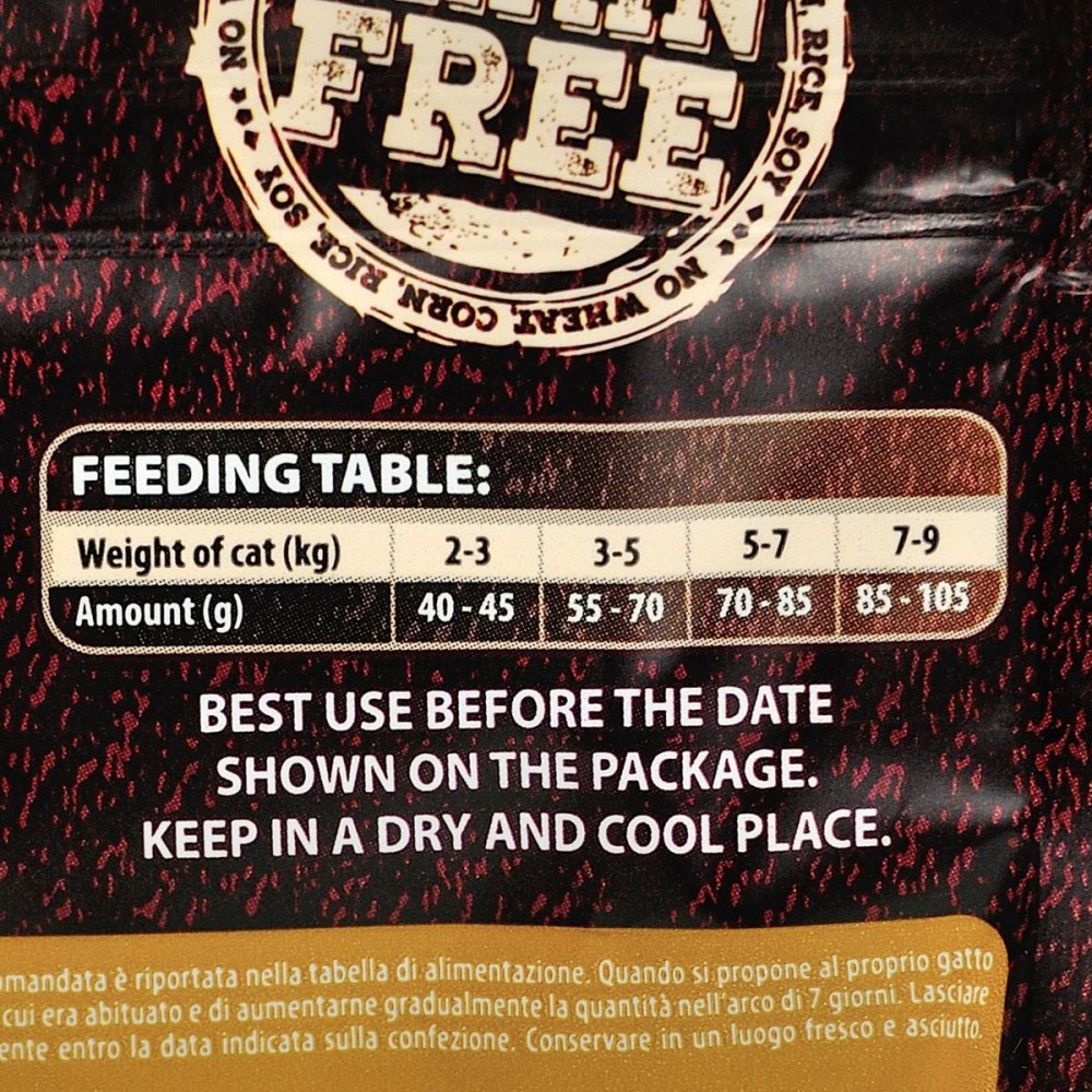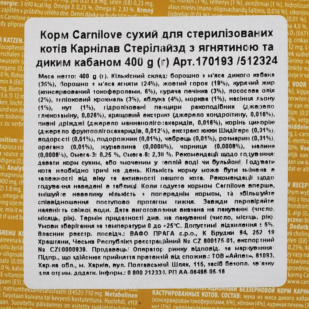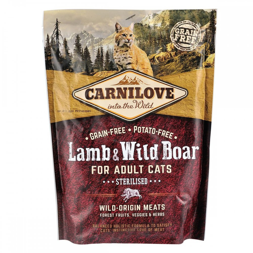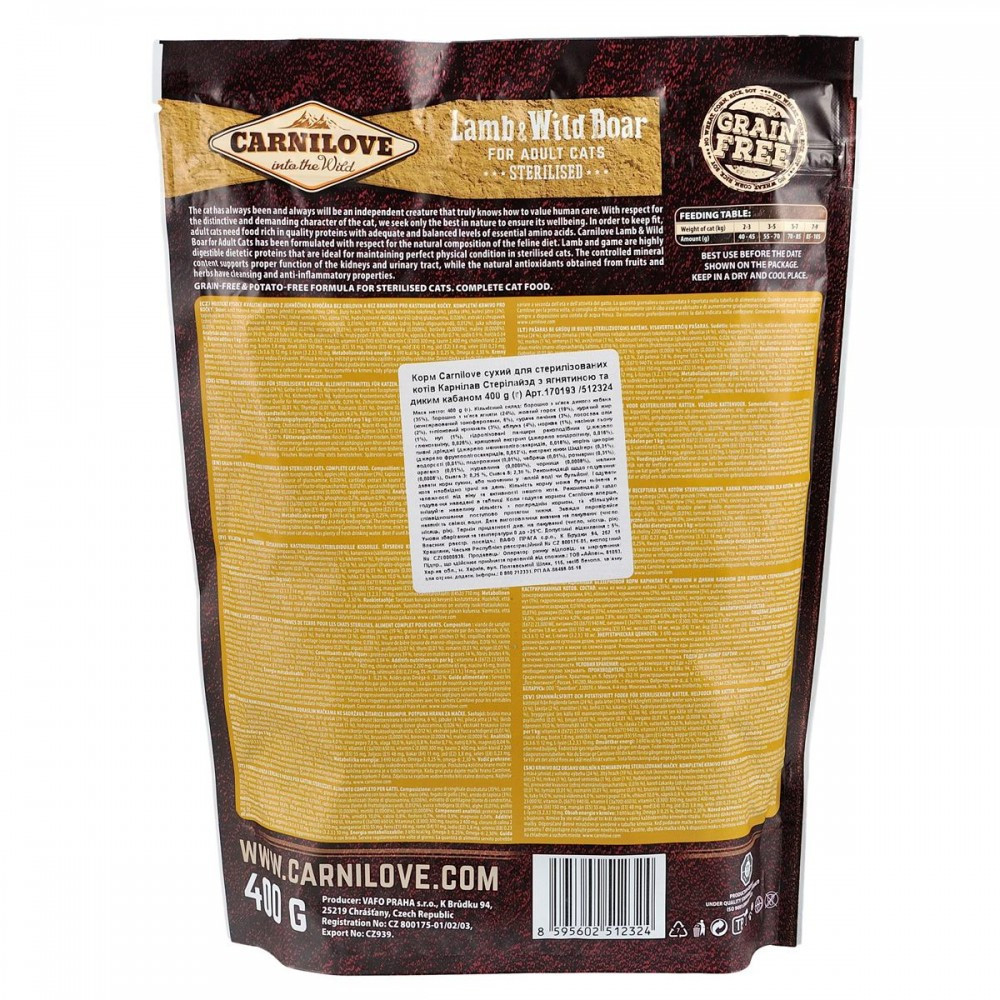Аби зберегти відмінну форму, дорослим котам потрібна якісна білкова їжа зі збалансованим рівнем незамінних амінокислот. Carnilove Lamb & Wild Boar для дорослих котів розроблено з урахуванням природного раціону котів у дикій природі. Ягня і дичина містять легкозасвоюваний дієтичний білок, який ідеально підходить для підтримання відмінного здоров’я стерилізованих котів.Мінеральні речовини,які містяться в кормі, підтримують нормальну роботу нирок і сечовивідної системи, а натуральні антиоксиданти, отримані з фруктів і трав, мають очищаючі та протизапальні властивості.Ягня та кабан- прерасне джерело енергії та вітамінів. З таким кормом вихованець завжди матиме сили для активності і буде забезпечений запасом поживних речовин.Склад:борошно з м’яса дикого кабана (35%), борошно з м’яса ягняти (24%), жовтий горох (19%), курячий жир (консервований токоферолами, 6%), куряча печінка (3%), лососева олія (2%), тапіоковий крохмаль (3%), яблука (4%), морква (1%), насіння льону (1%), нут (1%), гідролізовані панцири ракоподібних (джерело глюкозаміну, 0,026%), хрящовий екстракт (джерело хондроїтину, 0,016%), пивні дріжджі (джерело маннанолігосахаридів, 0,016%), корінь цикорію (джерело фруктоолігосахаридів, 0,012%), екстракт юкки Шидігера (0,01%), водорості (0,01%), подорожник (0,01%), чебрець (0,01%), розмарин (0,01%), орегано (0,01%), журавлина (0,0008%), чорниця (0,0008%), малина (0,0008%)Харчові добавки на 1 кг:вітамін A (3a672a) 23 000 МО, вітамін D3 (3a671) 940 МО, вітамін E (3a700) 650 мг, вітамін C (3a312) 300 мг, таурин (3a370) 2 400 мг, холіну хлорид (3a890) 2 200 мг, L-карнітин (3a910) 65 мг, ніацинамід (3a315) 45 мг, біотин (3a880) 1,8 мг, цинк (3b606) 150 мг, залізо (3b106) 48 мг, марганець (E5) 55 мг, йод (3b201) 3,8 мг, мідь (3b406) 11 мг, селен (3b810) 0,23 мг, L-метіонин (3c305) 14 мг, аргінін (3c3.6.1) 12 мг, L-лізин (3.2.3.) 10 мг.Аналітичний склад на 1 кг:сирий протеїн 39,0 %, вміст жиру 14,0 %, волога 10,0 %, сира зола 7,8 %, сира клітковина 4,0 %, кальцій 0,8 %, фосфор 0,7 %, натрій 0,9 %, магній 0,04 %Калорійність:3 690 ккал/кг. Омега 3: 0,25 %, Омега 6: 2,30 %Рекомендації щодо дозуваннязазначені на упаковці, обов’язково забезпечте вихованця порцією питної води.Вага кота (кг)2-34-56-78-9Добова норма (г)40-5555-7575-8585-100