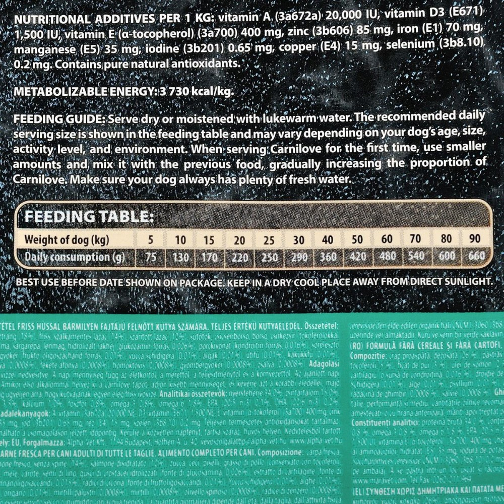 Carnilove Fresh Carp & Trout створено з повагою до законів природи, забезпечуючи вашу собаку збалансованим харчуванням, багатим свіжою рибою та морепродуктами у поєднанні з різноманітними овочами, ягодами та травами. Повернення до природного раціону допомагає підтримувати оптимальний фізичний стан, захищає серцево-судинну систему, живить суху шкіру та сприяє здоровій та блискучій шерсті.Карпмає унікальний склад білків, які легко засвоюються завдяки коротшим м’язовим волокнам. Поєднання карпа і форелі є природним джерелом омега-3 жирних кислот, які дуже корисні для зовнішнього вигляду та здоров’я шкіри і шерсті. Вміст ДГК і ЕПК підсилює позитивний вплив цієї особливої комбінації білків.Склад:свіжий короп (26%), сушена тріска (18%), гідролізований лосось (14%), сушений лосось (12%), гарбуз, нут, горох, курячий гідролізовані панцири ракоподібних (джерело глюкозаміну, 0,026%), хрящовий екстракт (джерело хондроїтину, 0.016%), пивні дріжджі (джерело мананоолігосахаридів, 0.015%), корінь цикорію (джерело фруктоолігосхридів, 0.016%), екстракт юки Шидігера (0,01%), водорості (0,01%), псиліум (0,01%), чебрець (0,01%), розмарин (0,01%), орегано (0,01%), журавлина (0,0008%), лохина (0,0008%), обліпиха (0,0008%), корінь імбиру (0,0008%), шавлія (0,0008%).Харчові добавки на 1 кг:вітамін А (3a672a) 20,000 I.U., вітамін D3 (3a671) 1500 I.U., вітамін E (3a700) 400 мг, цинк (3b606) 85 мг, залізо (3b106) 70 мг, манган (3b504) 35 мг, йод (3b201) 0.65 мг, мідь (3b406) 15 мг, селен (3b810) 0,2 мг.Аналітичний склад на 1 кг:сирий протеїн 34,0 %, вміст жиру 15,0 %, волога 10,0 %, сира зола 7,2 %, сира клітковина 3,5 %, кальцій 1,0 %, фосфор 0,8 %, натрій 0,5 %, омега-3 0,8 %, омега-6 1,8 %, EPA (20:5 n-3) 0,1 %, DHA (22:6 n-3) 0,2 %.Калорійність:3 730 ккал/кгРекомендації щодо дозуваннязазначені на упаковці, обов’язково забезпечте вихованця порцією питної води.Вага собаки (кг)51015202530405060708090Добова норма (г/день)75130170220250280350420470530580640
