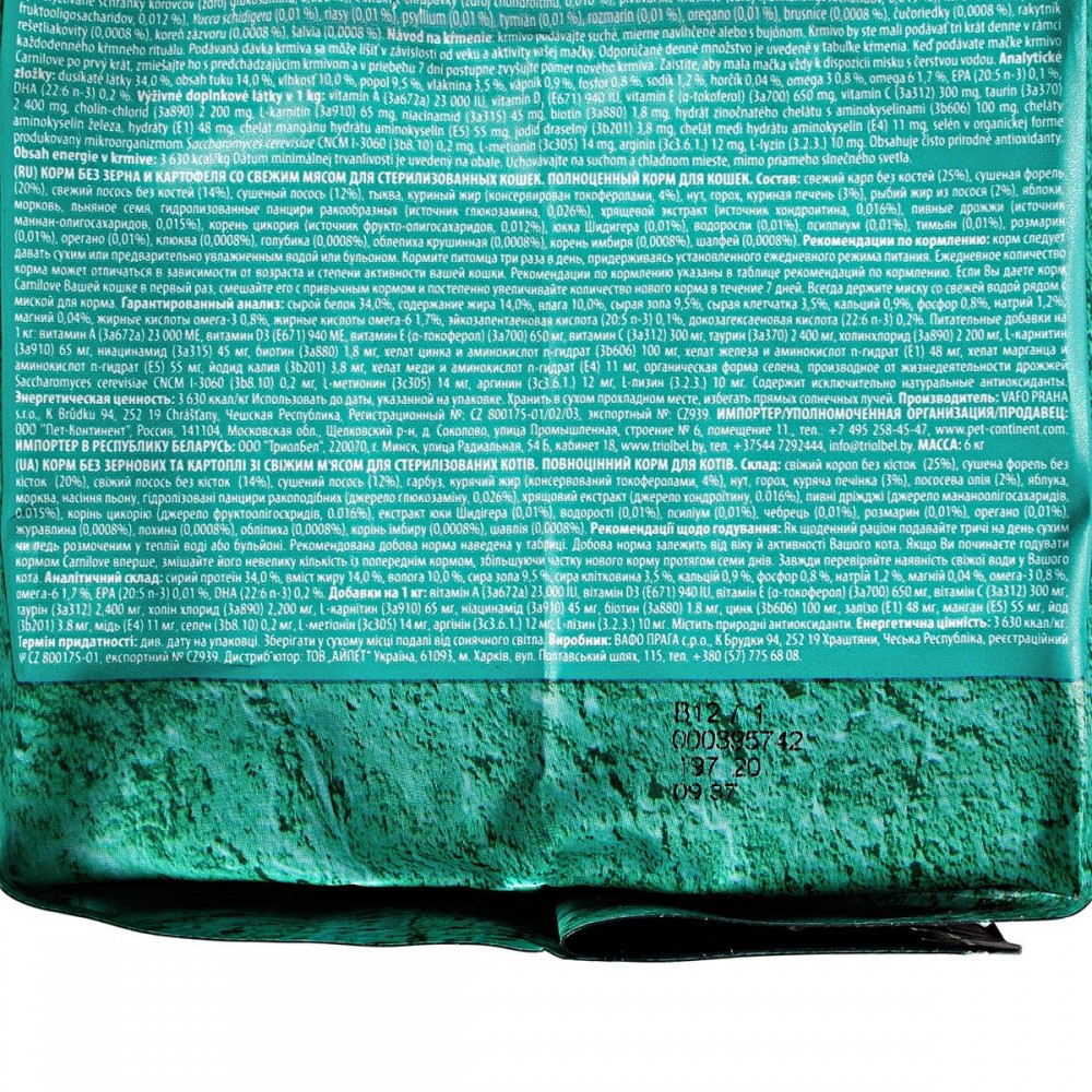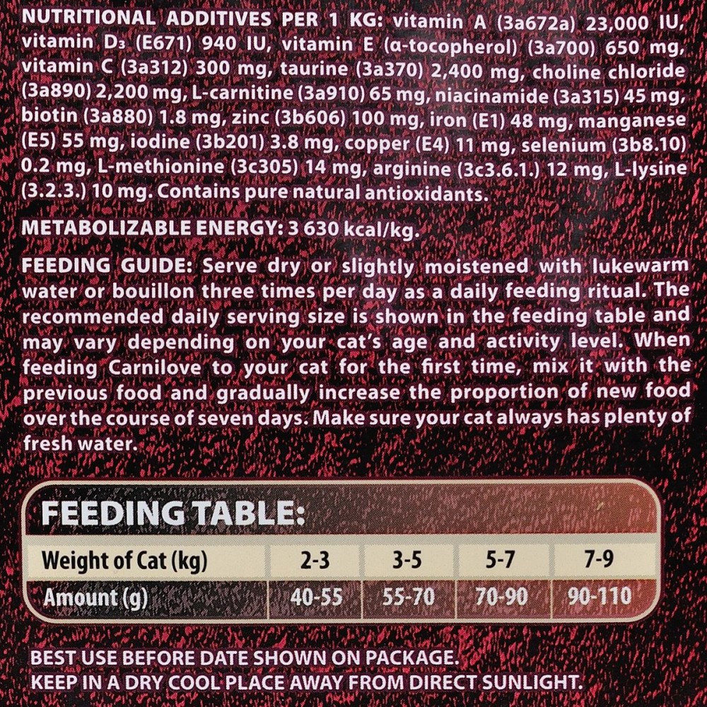 Коти — унікальні та незалежні тварини, які люблять м’ясо. Вони справжні хижаки і їхній спосіб життя визначається сильним мисливським інстинктом.Carnilove Fresh Carp & Trout створено з повагою до законів природи, забезпечуючи вашого кота збалансованим харчуванням, багатим рибою та морепродуктами у поєднанні з різноманітними овочами, ягодами та травами. Мінеральні речовини, які містяться в кормі, підтримують нормальну роботу нирок і сечовивідної системи, а натуральні антиоксиданти, отримані з фруктів і трав, мають очищаючі та протизапальні властивості. Повернення до природного раціону допомагає підтримувати стерилізованих котів у відмінній фізичній формі.Склад: свіжий короп (25%), сушена форель (20%), гідролізований лосось (14%), сушений лосось (12%), гарбуз, курячий жир (консервований токоферолами, 4%), нут, горох, куряча печінка (3%), лососева олія (2%), яблука, морква, насіння льону, гідролізовані панцири ракоподібних (джерело глюкозаміну, 0,026%), хрящовий екстракт (джерело хондроїтину, 0.016%), пивні дріжджі (джерело мананоолігосахаридів, 0.015%), корінь цикорію (джерело фруктоолігосхридів, 0.016%), екстракт юки Шидігера (0,01%), водорості (0,01%), псиліум (0,01%), чебрець (0,01%), розмарин (0,01%), орегано (0,01%), журавлина (0,0008%), лохина (0,0008%), обліпиха (0,0008%), корінь імбиру (0,0008%), шавлія (0,0008%).Харчові добавки на 1 кг:вітамін А (3a672a) 23,000 I.U., вітамін D3 (3a671) 940 I.U., вітамін E (3a700) 650 мг, вітамін C (3a312) 300 мг, таурін (3a312) 2,400 мг, холін хлорид (3a890) 2,200 мг, L-карнітин (3a910) 65 мг, ніацинамід (3a910) 45 мг, біотин (3a880) 1.8 мг, цинк (3b606) 100 мг, залізо (3b106) 48 мг, манган (3b504) 55 мг, йод (3b201) 3.8 мг, мідь (3b406) 11 мг, селен (3b810) 0,2 мг, L-метіонін (3c305) 14 мг, аргінін (3c3.6.1.) 12 мг, L-лізин (3.2.3.) 10 мг.Аналітичний склад на 1 кг:сирий протеїн 34,0 %, вміст жиру 14,0 %, волога 10,0 %, сира зола 9,5 %, сира клітковина 3,5 %, кальцій 0,9 %, фосфор 0,8 %, натрій 1,2 %, магній 0,04 %, омега-3 0,8 %, омега-6 1,7 %, EPA (20:5 n-3) 0,01 %, DHA (22:6 n-3) 0,2 %.Калорійність:3 630 ккал/кгВага кота (кг)2-33-55-77-9Добова норма (г)35-5050-6565-8585-95