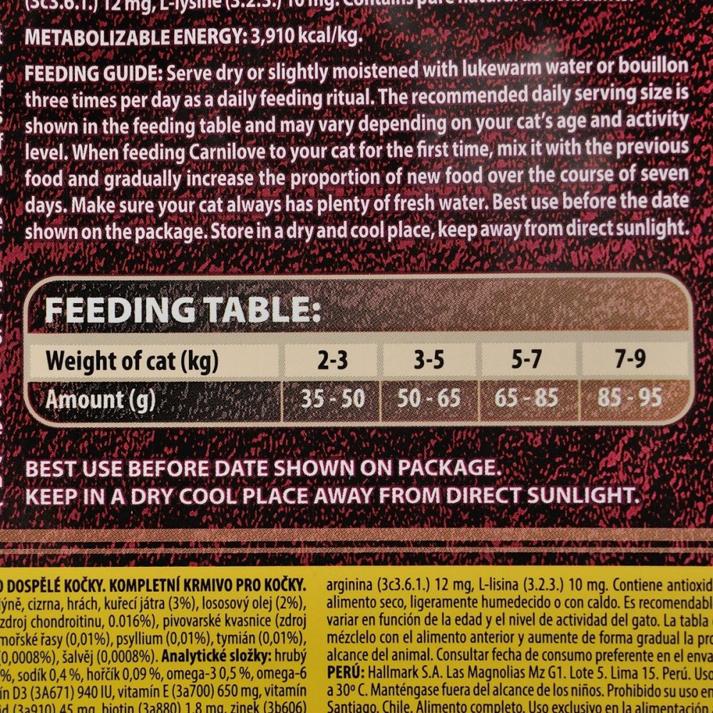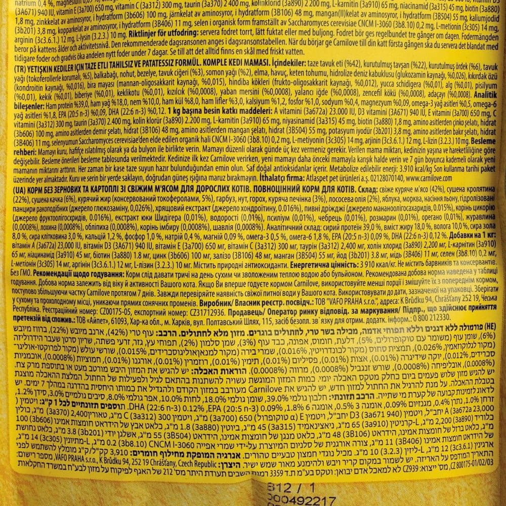 Коти— унікальні та незалежні тварини, які люблять м’ясо. Вони справжні хижаки і їхній спосіб життя визначається сильним мисливським інстинктом. Carnilove Fresh Chicken & Rabbit створено з повагою до законів природи, забезпечуючи вашу кішку збалансованим харчуванням, багатим свіжим м’ясом у поєднанні з різноманітними овочами, ягодами та травами.Повернення до природного раціону допомагає підтримувати здорове травлення та оптимальний фізичний стан. Перед насиченими смаком природними інгредієнтами найвищої якості не зможе встояти навіть найвибагливіший котячий гурман.Склад: свіжа курятина (42%), сушена кролятина (22%), сушена качка (6%), курячий жир (консервований токоферолами, 5%), гарбуз, нут, горох, куряча печінка (3%), лососева олія (2%), яблука, морква, насіння льону, гідролізовані панцири ракоподібних (джерело глюкозаміну, 0,026%), хрящовий екстракт (джерело хондроїтину, 0.016%), пивні дріжджі (джерело мананоолігосахаридів, 0.015%), корінь цикорію (джерело фруктоолігосхридів, 0.016%), екстракт юки Шидігера (0,01%), водорості (0,01%), псиліум (0,01%), чебрець (0,01%), розмарин (0,01%), орегано (0,01%), журавлина (0,0008%), лохина (0,0008%), обліпиха (0,0008%), корінь імбиру (0,0008%), шавлія (0,0008%).Харчові добавки на 1 кг:вітамін А (3a672a) 23,000 I.U., вітамін D3 (3a671) 940 I.U., вітамін E (3a700) 650 мг, вітамін C (3a312) 300 мг, таурін (3a312) 2,400 мг, холін хлорид (3a890) 2,200 мг, L-карнітин (3a910) 65 мг, ніацинамід (3a910) 45 мг, біотин (3a880) 1.8 мг, цинк (3b606) 100 мг, залізо (3b106) 48 мг, манган (3b504) 55 мг, йод (3b201) 3.8 мг, мідь (3b406) 11 мг, селен (3b810) 0,2 мг, L-метіонін (3c305) 14 мг, аргінін (3c3.6.1.) 12 мг, L-лізин (3.2.3.) 10 мг.Аналітичний склад на 1 кг:сирий протеїн 39,0 %, вміст жиру 18,0 %, волога 10,0 %, сира зола 8,0 %, сира клітковина 3,0 %, кальцій 1,2 %, фосфор 1,0 %, натрій 0,4 %, магній 0,09 %, омега-3 0,5 %, омега-6 1,8 %, EPA (20:5 n-3) 0,09 %, DHA (22:6 n-3) 0,12 %.Калорійність:3 910 ккал/кг.Вага кота (кг)2-33-55-77-9Добова норма (г)35-5050-6565-8585-95
