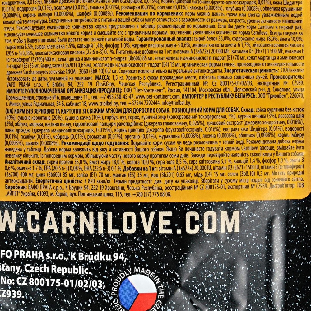 Carnilove Fresh Chicken & Rabbit створено з повагою до законів природи, забезпечуючи вашу собаку збалансованим харчуванням, багатим свіжим м’ясом у поєднанні з різноманітними овочами, ягодами та травами. Повернення до природного раціону покращує травлення вашого собаки та сприяє правильному росту м’язів і хрящів. Екстракти мідій забезпечують міцні кістки та здорові суглоби.Курка— чудове джерело незамінних амінокислот і мінералів. Її високий вміст білка забезпечує належний розвиток всіх тканин, а у поєднанні з легкозасвоюваним білком з м’яса кролика, робить цей корм унікальним і підходящим для будь-якого хижака. М’ясо кролика також містить дуже мало жиру, роблячи цей продукт надзвичайно пісним.Склад: свіжа курятина (40%), сушена кролятина (22%), сушена качка (10%), гарбуз, нут, горох, курячий жир (консервований токоферолами, 5%), куряча печінка (3%), лососева олія (2%), яблука, морква, насіння льону, гідролізовані панцири ракоподібних (джерело глюкозаміну, 0,026%), хрящовий екстракт (джерело хондроїтину, 0.016%), пивні дріжджі (джерело мананоолігосахаридів, 0.015%), корінь цикорію (джерело фруктоолігосхридів, 0.016%), екстракт юки Шидігера (0,01%), водорості (0,01%), псиліум (0,01%), чебрець (0,01%), розмарин (0,01%), орегано (0,01%), журавлина (0,0008%), лохина (0,0008%), обліпиха (0,0008%), корінь імбиру (0,0008%), шавлія (0,0008%).Харчові добавки на 1 кг:вітамін А (3a672a) 20,000 I.U., вітамін D3 (3a671) 1500 I.U., вітамін E (3a700) 400 мг, цинк (3b606) 85 мг, залізо (3b106) 70 мг, манган (3b504) 35 мг, йод (3b201) 0.65 мг, мідь (3b406) 15 мг, селен (3b810) 0,2 мг.Аналітичний склад на 1 кг:сирий протеїн 35,0 %, вміст жиру 18,0 %, волога 10,0 %, сира зола 8,5 %, сира клітковина 3,5 %, кальцій 1,4 %, фосфор 1,0 %, натрій 0,3 %, омега-3 0,6 %, омега-6 1,7 %, EPA (20:5 n-3) 0,08 %, DHA (22:6 n-3) 0,1 %.Калорійність:3 820 ккал/кгРекомендації щодо дозуваннязазначені на упаковці, обов’язково забезпечте вихованця порцією питної води.Вага собаки (кг)51015202530405060708090Добова норма (г/день)75130170220250280350420470530580640