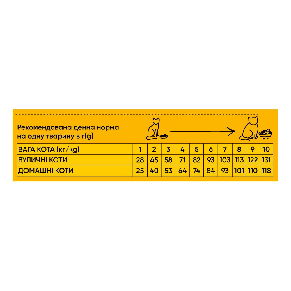 Повноцінний сухий корм для дорослих котів від 12 місяців. Забезпечує улюбленця необхідними поживними речовинами, піклується про комфортне травлення та міцний імунітет.Збагачена фруктами, овочами, хондропротекторами й лікарськими рослинами рецептура Half&Half піклується про оптимальну користь та смак у кожній порції.Переваги:Яловичина – це не тільки поживний білок для підтримки м’язової кондиції активних дорослих котів, але й багате джерело заліза для підтримки гемоглобіну, що також важливо для літніх улюбленців.Висівки не тільки багаті на вітаміни групи В, але як груба клітковина покращують травлення, поліпшують перистальтику кишечника та допомагають виведенню токсинів з організму. Оптимальне співвідношення компонентів джерел грубої клітковини допомагає виведенню шерсті малоактивних котів.Буряки й броколі допомагають покращенню та оптимізації процесів травлення, а також підтримці кишківника, томати і шпинат – важливі для здоров’я серцяХондропротектори глюкозамін і хондроїтину сульфат дбають про зміцнення та здорове формування суглобів і хрящів.Суміш лікарських рослин піклується про міцний імунітет улюбленця.Cклад:дегідрована яловичина (26 %), кукурудза, пшеничні висівки, кукурудзяні висівки, пшениця, яловичий жир (2 %), сушена бурякова м’якіть, гідролізована куряча печінка (1 %), мінерали, сушені броколі, сушені томати, сушений шпинат, сушені чорниці, глюкозамін, хондроїтину сульфат, суміш лікарських рослин (юка Мохаве, розмарин, куркума, цитрус, євгенія).Аналітичний склад:сирий білок – 26,5 %, сирий жир – 11,0 %, неорганічні речовини – 8,5 %, сира клітковина – 4,5 %, вологість – 9,0 %.Добавки (на кг).Вітаміни: вітамін A (3a672a) – 30.000 МО, вітамін D3 (3a671) – 1.300 МО, вітамін E (3a700) – 100 мг. Мікроелементи: залізо (3b103) – 100,0 мг, мідь (3b405) – 7,0 мг, цинк (3b605) – 100,0 мг, марганець (3b503) – 7,5 мг, йод (3b202) – 1,5 мг, селен (3b801) – 0,15 мг.Енергетична цінність:3.572 ккал/кг.Вага кота (кг)12345678910Вуличні коти (г)284558718293103113122131Домашні коти (г)25405364748493101110118