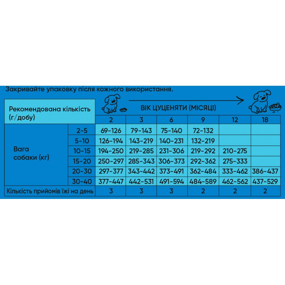 Повноцінний сухий корм для цуценят усіх порід від 2 місяців. Забезпечує собаку необхідними поживними речовинами для здорового та повноцінного росту та розвитку на усіх етапах формування.Збагачена фруктами, овочами, хондропротекторами й лікарськими рослинами рецептура Half&Half піклується про оптимальну користь та смак у кожній порції.Переваги:Поживна яловичина – оптимальний білок як для нарощування м’язової маси щільних порід собак, так і для підтримки оптимальної кондиції тендітних порід типу хортів.Висівки не тільки багаті на Вітаміни групи В, але як груба клітковина покращують травлення, поліпшують перистальтику кишечника та допомагають виведенню токсинів з організму.Буряки й броколі допомагають покращенню та оптимізації процесів травлення, а також підтримці здоров’я кишківника.Хондропротектори глюкозамін і хондроїтину сульфат дбають про зміцнення та здорове формування суглобів і хрящів.Суміш лікарських рослин піклується про міцний імунітет улюбленця.Склад: дегідрована яловичина (28 %), кукурудза, кукурудзяні висівки, пшеничні висівки, пшениця, гідролізована куряча печінка (2 %), яловичий жир (0,5 %), сушена бурякова м’якіть, мінерали, сушені броколі, сушені томати, сушений шпинат, сушені чорниці, глюкозамін, хондроїтину сульфат, суміш рослинних екстрактів (юка Мохаве, розмарин, куркума, цитрус, євгенія).Аналітичний склад: сирий білок – 25,0 %, сирий жир – 10,0 %, неорганічні речовини (сира зола) – 7,0 %, сира клітковина – 4,0 %, вологість – 9,0 %.Харчові добавки (на кг).Вітаміни: вітамін A (3a672a) – 14.000 МО, вітамін D3 (3a671) – 1.000 МО, – вітамін E (3a700) – 100 мг. Макроелементи: залізо (3b103) – 100,0 мг, мідь (3b405) – 10,0 мг, цинк (3b605) – 125,0 мг, марганець (3b503) – 5,0 мг, йод (3b202) – 1,5 мг, селен (3b801) – 0,2 мг.Енергетична цінність:3.454 ккал/кг.Кількість корму (г/добу)Вік цуценяти (місяці)23691218Вага собаки (кг)2-569-12679-14375-14072-1325-10126-194143-219140-231132-21910-15194-250219-285231-306219-292210-27515-20250-297285-343306-373292-362275-33320-30297-377343-442373-491362-484333-462386-43730-40377-447442-531491-594484-589462-562437-529