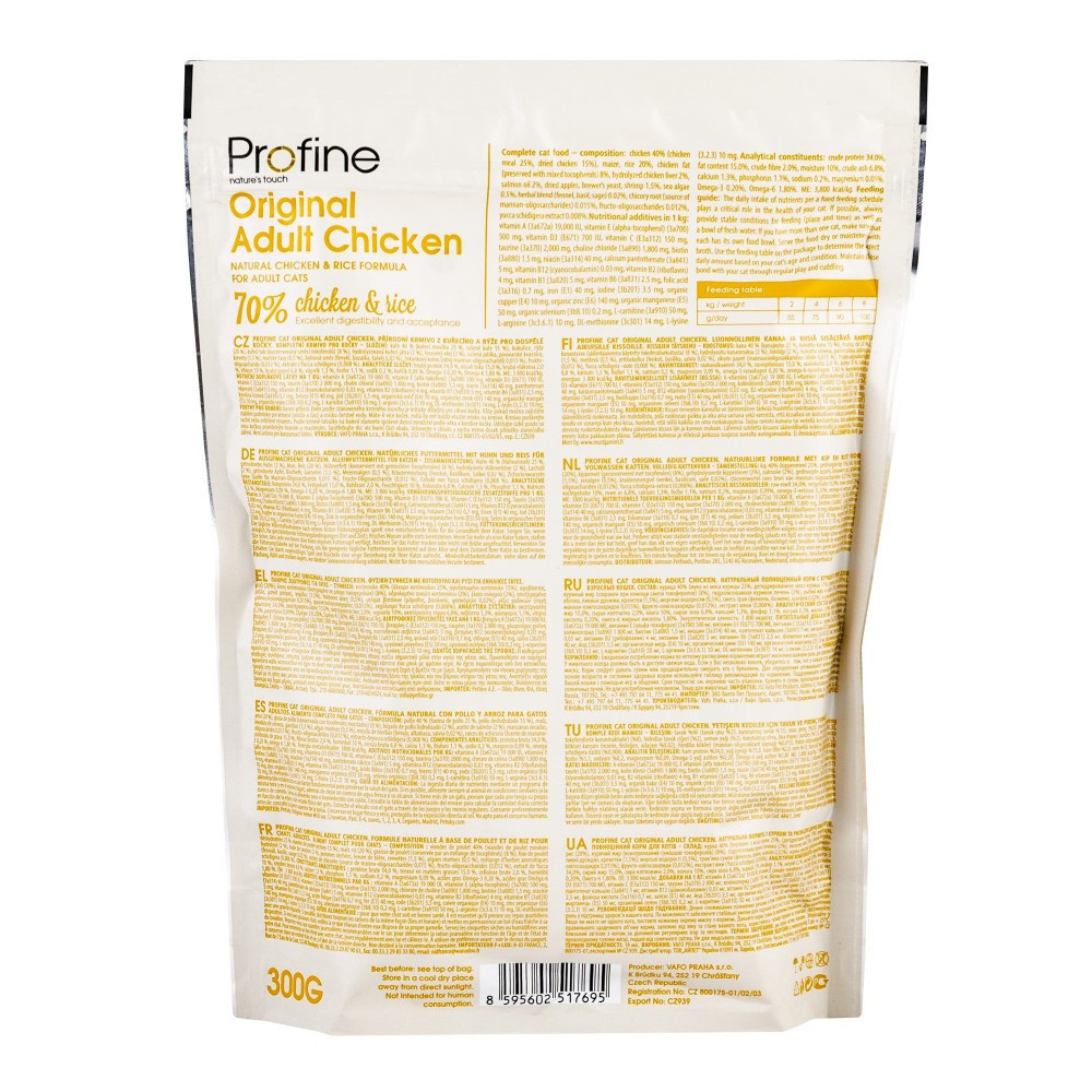 Сухий корм для дорослих кішок Profine Cat Original Adult із куркою. Природна формула супер-преміум класу. Корм Profine відрізняється високим вмістом білка, джерелом якого є курка, ягня і лосось.Завдяки вітамінно-мінеральному комплексу, вихованець буде активним і здоровим, пребіотики і пробіотики допомагають підтримувати оптимальну мікрофлору кишечника, попереджають виникнення захворювань шлунково-кишкового тракту.Курка – одне з найулюбленіших ласощів для котів. Курка легко засвоюється, містить у собі багато поживних речовин в поєднанні з чудовим смаком. Куряче м’ясо одне з найкращих для повсякденного годування котів.Рекомендації щодо дозування зазначені на упаковці, обов’язково забезпечте вихованця порцією питної водиСклад: курка 40% (борошно з м’яса курки 25%, дегідратована курка 15%), кукурудза, рис (20%), курячий жир (збережений за допомогою суміші токоферолів) (8%), гідролізована куряча печінка (2%), риб’ячий жир з лосося (2%), сушені яблука, пивні дріжджі, морські водорості (0,5%), трав’яна суміш (фенхель, базилік, шавлія 0,02%), корінь цикорію (джерело маннан-олігосахаридів 0,015%), фрукто-олігосахариди (0,012%), екстракт юкки Шидігера (Yucca schidigera), (0,008%).Аналітичний склад:сирий білок – 34,0%, сирий жир – 15,0%, сира клітковина – 2,0%, волога – 10%, сира зола – 6,8%, кальцій – 1,3%, фосфор – 1,1%, натрій – 0,2%, магній – 0,09%, Омега-3 – 0,20%, Омега-6 – 1,80%.Добавки на 1 кг: вітамін A (3a672a) – 19 000 МО, вітамін E (альфа-токоферол) (3a700) – 500 мг, вітамін D3 (E671) – 700 МО, вітамін C (E3a312) – 150 мг, таурин (3a370) – 2 000 мг, холінхлорид (3a890) – 1 800 мг, біотин (3a880) – 1,5 мг, ніацин (3a314) – 40 мг, пантотенат кальцію (3a841) – 5 мг, вітамін B12 (ціанокобаламін) – 0, 03 мг, вітамін B2 (рибофлавіну) – 4 мг, вітамін B1 (3a820) – 5 мг, вітамін B6 (3a831) – 2,5 мг, фолієва кислота (3a316) – 0,7 мг, залізо (E1) 40 мг, йод (3b201) – 3,5 мг, органічна мідь (E4) – 10 мг, органічний цинк (E6) – 140 мг, органічний марганець (E5) – 50 мг, органічний селен (3b8. 10) – 0,2 мг, L-карнітин (3a910) – 50 мг, L- аргінін (3c3. 6. 1) – 10 мг, DL-метіонін (3c301) – 14 мг, L-лізин (3. 2. 3) – 10 мг.Енергетична цінність:3 800 ккал / кг.Вага кішки, кг2468Добова норма, г557590100