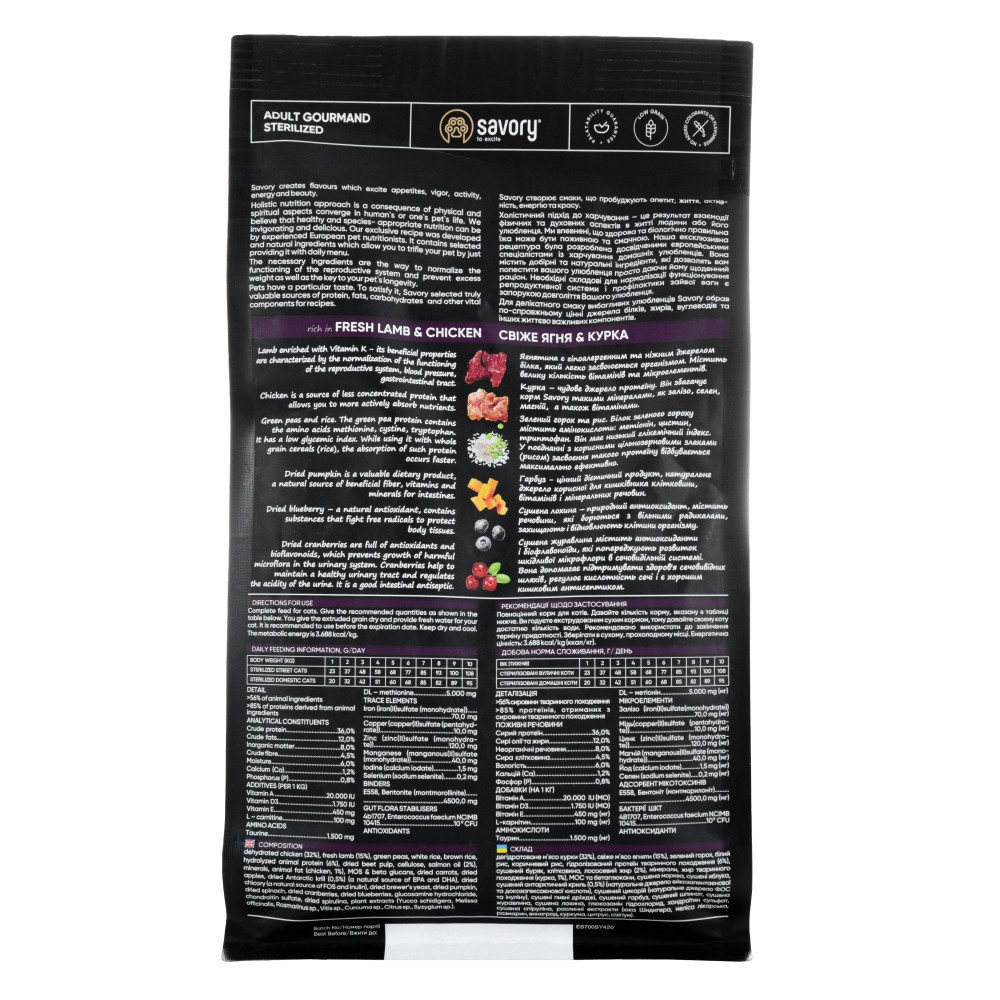 Корм класу холістик для стерилізованих котів. Повнораціонний сухий корм для котів Savory пробудить у вашого улюбленця ту життєву енергію, про яку він навіть сам ще не знав.Ексклюзивна рецептура корму була розроблена досвідченими європейськими спеціалістами з харчування домашніх улюбленців. Використовуючи холістичний підхід, вдалося створити біологічно відповідний, здоровий раціон для котів, який є корисним і смачним настільки, що лапки оближеш. Поєднання добірних натуральних інгредієнтів дає можливість піклуватися про здоров’я чотирилапого, а вишуканий смак – дарувати йому насолоду від щоденного споживання корму Savory.Сухий корм для котів Savory містить свіже м’ясо ягняти та дегідратоване м’ясо курки, ягоди, фрукти та овочі. Ці компоненти створені природою, щоб піклуватися про здоров’я нирок і сечовивідних шляхів котика та підтримати його оптимальну фізичну форму.Переваги:Свіже м’ясо ягняти та дегідроване м’ясо курки – цінне джерело білків, які легко засвоюються та надають корму неперевершеного смаку.Унікальний комплекс пребіотиків, пробіотиків і мінералів підтримує здорове травлення та зміцнює імунітет.Підтримання оптимальної ваги – рівномірний набір м’язової маси без відкладання жиру.Суперфуди для гармонійного розвитку та комфорту травлення.Містить хондропротектори для здорового формування, зміцнення та захисту суглобів.Ягоди, фрукти і овочі – джерело антиоксидантів, вітамінів і флавоноїдів для довгого та здорового життя котика.Не містить штучних барвників і штучних ароматизаторів – підхід «NafNac».Особливості:Ягня є найбільш гіпоалергенним та ніжним джерелом білка, легко засвоюється організмом. Не містить холестерину, багате на вітаміни, мікроелементи та лецитин.Курка – це чудове джерело протеїну, збагачує рецептуру Savory такими мінералами, як залізо, селен, магній, а також вітамінами.Зелений горох і рис. Білок зеленого гороху містить амінокислоти: метіонін, цистин, триптофан; має низький глікемічний індекс. У поєднанні з корисними цільнозерновими злаками (рисом) засвоєння такого протеїну відбувається максимально ефективно.Гарбуз – цінний дієтичний продукт, натуральне джерело корисної для кишківника клітковини, вітамінів і мінеральних речовин.Сушений антарктичний криль – натуральне джерело ейкозапентаєнової та докозагексаєнової кислот, необхідних для гострого зору, нормального функціонування мозку й здорової шкіри і шерсті.Сушена лохина – природний антиоксидант для боротьби з вільними радикалами, захисту і відновлення клітин організму.Сушена журавлина містить антиоксиданти і біофлавоноїди для профілактики розвитку шкідливої мікрофлори в сечовидільній системі. Ці ягоди підтримують здоров’я сечовивідних шляхів, регулюють кислотність сечі і є хорошим кишковим антисептиком.Яблука є джерелом пребіотиків (олігосахаридів), що покращують здоров’я мікрофлори кишечника.Шпинат – джерело вітамінів групи В, знижує процеси окислення в організмі, нормалізує артеріальний тиск.Корм Savory – корисне може бути смачним!Склад:дегідратоване м`ясо курки (32%), свіже м`ясо ягняти (15%), зелений горох, білий рис, коричневий рис, гідролізований протеїн тваринного походження (6%), сушений буряк, клітковина, лососева олія (2%), мінерали, жир тваринного походження (курка, 1%), МОС та бетаглюкани, сушена морква, сушені яблука