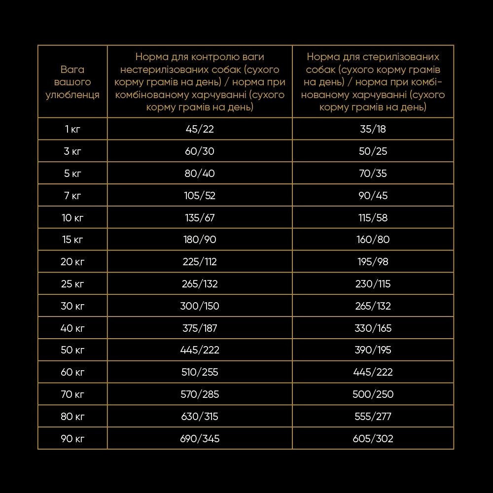 Холістична рецептура зі свіжою індичкою забезпечить легке засвоєння без переїдань. Дієтичне м’ясо сприяє підтримці здорової кондиції собак, після зміни обміну речовин, та профілактиці набору зайвої ваги. Оптимально підійде для кастрованих та стерилізованих улюбленців.Корм також можна використовувати у якості постійного раціону для собак, котрим потрібен контроль маси тіла, схильних до переїдань, та тих, котрі вже страждають від зайвої ваги.Породи:усі породи собак.Вік:стерилізовані, або кастровані собаки будь-якого віку.Крокети:рівносторонній трикутник, 11.69/6.5 мм завбільшки. Трикутник ідеально спонукає собаку не ковтати, а розгризати крокети. Це не тільки допомагає підтримці здоров’я ротової порожнини, але й допомагає контролювати надмірне переїдання. Кількість спожитого корму, котрий улюбленець вимушений розгризати буде відчутно менша, за кількість спожитого корму, якщо собака його проковтує в один і той самий прийом їжі.Склад:білок індички 27%, свіжа індичка 15%, білий рис 10%, коричневий рис, гідролізований курчячий білок 8%, дегідрована яблучна м’якіть 8%, пташиний жир 7%, лігноцелюлоза (рослинна клітковина) 3%, горох 3%, сочевиця 2%, лососева олія 2%, дріжджі 2%, гідролізована куряча печінка 2%, насіння чіа 0.5%, насіння кіноа 0.5%, горохове борошно, хлорид натрію (важливий електролит) 0.3%, монтморилоніт (мінерал, сорбент) 0.1%, дегідрована куркума 0.1%, глюкозамін 0.02%, хондроїтину сульфат 0.015%, мананоолігосахариди 0.014%, фруктоолігосахариди 0.011%, юка Мохаве 0.008%, насіння росторопші 0.005%, Lactobacillus helveticus HA – 122 inactivated (пробіотик) 15х10⁹ клітин/кг.Аналітичний склад:сирий білок 27%, сирий жир 11%, вологість 10%, сира зола 5%, сира клітковина 4.5%, кальцій 1.1%, фосфор 0.6%, натрій 0.2%, магній 0.06%, калій 0.6%, омега-3 жирні кислоти 0.4%, омега-6 жирні кислоти 1.75%.Харчові додатки на 1 кг:вітамін А (3а672) 16000 МО, вітамін D3 (3a671) 1500 МО, вітамін Е (3а700) 500 мг, вітамін С (3а312) 250 мг, L-карнітин (3а910) 200 мг, холіну хлорид (3a890) 600 мг, ніацинамід (3a315) 15 мг, біотин (3a880) 0,5 мг, цинк (3b606) 90 мг, залізо (3b106) 75 мг, марганець (3b504) 35 мг, йод (3b201) 0.6 мг, мідь (3b406) 15 мг, селен (3b810) 0.2 мг.Енергетична цінність:3,535 ккал/кг.Рекомендації з годування.Орієнтовна порція вказана в таблиці годування. Завжди слідкуйте за тим, щоб в улюбленця була свіжа питна вода.Вага улюбленцяНорма годуваннясобак (сухого корму грамів на день)/норма при комбінованому харчуванні (сухого корму грамів на день)Для контролю ваги нестерилізованих собакДля стерилізованих собак1 кг45/2235/183 кг60/3050/255 кг80/4070/357 кг105/5290/4510 кг135/67115/5815 кг180/90160/8020 кг225/112195/9825 кг265/132230/11530 кг300/150265/13240 кг375/187330/16550 кг445/222390/19560 кг510/255445/22270 кг570/285500/25080 кг630/315555/27790 кг690/345605/302*норми годування є середньостатистичними, та можуть корегуватися на +-20% в залежності від метаболізму та температур навколишнього середовища
