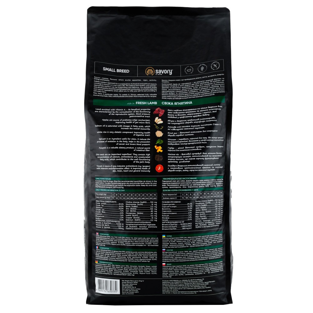 Корм класу холістик для собак малих порід вагою до 10 кг. Повнораціонний сухий корм для собак малих порід Savory пробудить у вашого улюбленця ту життєву енергію, про яку він навіть сам ще не знав.Ексклюзивна рецептура корму була розроблена досвідченими європейськими спеціалістами з харчування домашніх тварин. Використовуючи холістичний підхід, вдалося створити біологічно відповідний, здоровий раціон для собак, який є корисним і смачним настільки, що лапки оближеш. Поєднання добірних натуральних інгредієнтів дає можливість піклуватися про здоров’я чотирилапого, а вишуканий смак – дарувати йому насолоду від щоденного споживання корму Savory.Сухий корм для собак малих порід Savory містить якісне м’ясо ягняти, суперфуди, гарбуз, шпинат і помідори. Ці компоненти створені природою для невеличкого, але дуже активного песика. Гранули корму розроблені з урахуванням анатомічних особливостей собак малих порід.Переваги:Цінне джерело білків – свіже м’ясо ягняти.Унікальний комплекс пребіотиків, пробіотиків і мінералів для зміцнення імунітету.Містить хондропротектори для захисту суглобів.Підтримання оптимальної ваги – рівномірний набір м’язової маси без відкладання жиру.Суперфуди для гармонійного розвитку та комфорту травлення.Збалансований низькозерновий склад.Маленька крокета для зручного жування.Гіпоалергенні інгредієнти.Без барвників і ароматизаторів.Особливості:Ягня є найбільш гіпоалергенним та ніжним джерелом білка, легко засвоюється організмом. Не містить холестерину, багате на вітаміни, мікроелементи та лецитин.Яблука є джерелом пребіотиків (олігосахаридів), що покращують здоров’я мікрофлори кишечника.Лососева олія насичена жирними кислотами Омега-3, які підвищують загальний імунітет і надають блиску шерсті.Білий рис – дієтичний компонент зі сприятливою дією на травну систему.Гарбуз – цінний дієтичний продукт, натуральне джерело корисної для кишечника клітковини.Кокосове молоко має інтенсивну протизапальну та антибактеріальну дію. Покращує роботу ШКТ, стан шкіри та серця, підтримує оптимальну кондицію організму.Насіння чіа – суперфуд з високою концентрацією кальцію, антиоксидантів та ненасичених жирних кислот для правильного функціонування організму тварини.Насіння кіноа містить калій, рутин, мінеральні солі, каротин, ефірні масла, а також важливі для роботи шлунково-кишкового тракту пектин і клітковину.Помідори є джерелом антиоксидантів, які мають інтенсивний протизапальний ефект, покращують стан шкіри, роботу мозку і захищають серце.Шпинат – джерело вітамінів групи В, знижує процеси окислення в організмі, нормалізує артеріальний тиск.Корм Savory – корисне може бути смачним!Склад:дегідроване ягня (30%), рис, свеже ягненя (15%), курячий жир, сушені яблука, горох, лососева олія, гідролізат курячої печінки, дріжджі, гарбуз (1%), сушена селера (0,5%), насіння чіа (0,5%), насіння кіноа (0,5%), сушені томати (0,5%), шпінат сушений (0,5%), горохове борошно, сушена куркума (0,2%), хондропротектори глюкозамин (0,025%) та хондроїтин сульфат (0,015%), пребіотики мананолігосахариди (MOS) (0,015%), фруктоолігосахариди (FOS) (0,01%), юкка Шидигера (0,01%), пробіотик інактивована культура Lactobacillus acidophilus HA – 122 (15×109 клеток/кг).Аналітичний склад:сирий протеїн 26,0%, сирі олії та жири 17,0%, вологість 10,0%, сира зола 7,0%, сира клітковина 2,5%, кальцій (Ca) 1,6%, фосфор (P) 1,2%, натрій (Na) 0