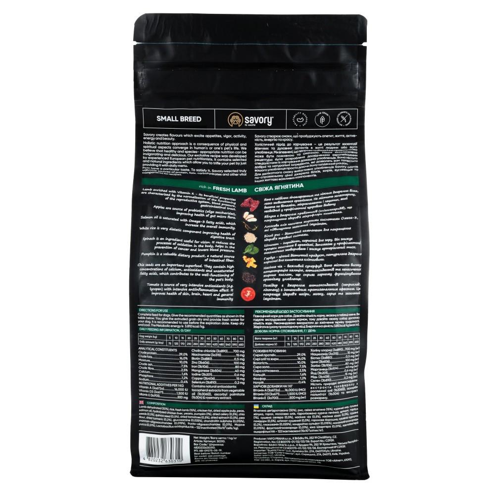 Корм класу холістик для собак малих порід вагою до 10 кг. Повнораціонний сухий корм для собак малих порід Savory пробудить у вашого улюбленця ту життєву енергію, про яку він навіть сам ще не знав.Ексклюзивна рецептура корму була розроблена досвідченими європейськими спеціалістами з харчування домашніх тварин. Використовуючи холістичний підхід, вдалося створити біологічно відповідний, здоровий раціон для собак, який є корисним і смачним настільки, що лапки оближеш. Поєднання добірних натуральних інгредієнтів дає можливість піклуватися про здоров’я чотирилапого, а вишуканий смак – дарувати йому насолоду від щоденного споживання корму Savory.Сухий корм для собак малих порід Savory містить якісне м’ясо ягняти, суперфуди, гарбуз, шпинат і помідори. Ці компоненти створені природою для невеличкого, але дуже активного песика. Гранули корму розроблені з урахуванням анатомічних особливостей собак малих порід.Переваги:Цінне джерело білків – свіже м’ясо ягняти.Унікальний комплекс пребіотиків, пробіотиків і мінералів для зміцнення імунітету.Містить хондропротектори для захисту суглобів.Підтримання оптимальної ваги – рівномірний набір м’язової маси без відкладання жиру.Суперфуди для гармонійного розвитку та комфорту травлення.Збалансований низькозерновий склад.Маленька крокета для зручного жування.Гіпоалергенні інгредієнти.Без барвників і ароматизаторів.Особливості:Ягня є найбільш гіпоалергенним та ніжним джерелом білка, легко засвоюється організмом. Не містить холестерину, багате на вітаміни, мікроелементи та лецитин.Яблука є джерелом пребіотиків (олігосахаридів), що покращують здоров’я мікрофлори кишечника.Лососева олія насичена жирними кислотами Омега-3, які підвищують загальний імунітет і надають блиску шерсті.Білий рис – дієтичний компонент зі сприятливою дією на травну систему.Гарбуз – цінний дієтичний продукт, натуральне джерело корисної для кишечника клітковини.Кокосове молоко має інтенсивну протизапальну та антибактеріальну дію. Покращує роботу ШКТ, стан шкіри та серця, підтримує оптимальну кондицію організму.Насіння чіа – суперфуд з високою концентрацією кальцію, антиоксидантів та ненасичених жирних кислот для правильного функціонування організму тварини.Насіння кіноа містить калій, рутин, мінеральні солі, каротин, ефірні масла, а також важливі для роботи шлунково-кишкового тракту пектин і клітковину.Помідори є джерелом антиоксидантів, які мають інтенсивний протизапальний ефект, покращують стан шкіри, роботу мозку і захищають серце.Шпинат – джерело вітамінів групи В, знижує процеси окислення в організмі, нормалізує артеріальний тиск.Корм Savory – корисне може бути смачним!Склад:дегідроване ягня (30%), рис, свеже ягненя (15%), курячий жир, сушені яблука, горох, лососева олія, гідролізат курячої печінки, дріжджі, гарбуз (1%), сушена селера (0,5%), насіння чіа (0,5%), насіння кіноа (0,5%), сушені томати (0,5%), шпінат сушений (0,5%), горохове борошно, сушена куркума (0,2%), хондропротектори глюкозамин (0,025%) та хондроїтин сульфат (0,015%), пребіотики мананолігосахариди (MOS) (0,015%), фруктоолігосахариди (FOS) (0,01%), юкка Шидигера (0,01%), пробіотик інактивована культура Lactobacillus acidophilus HA – 122 (15×109 клеток/кг).Аналітичний склад:сирий протеїн 26,0%, сирі олії та жири 17,0%, вологість 10,0%, сира зола 7,0%, сира клітковина 2,5%, кальцій (Ca) 1,6%, фосфор (P) 1,2%, натрій (Na) 0