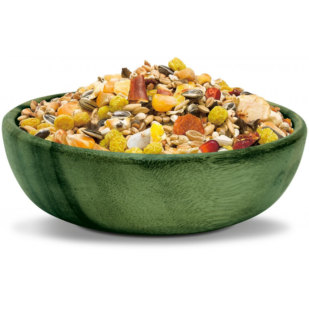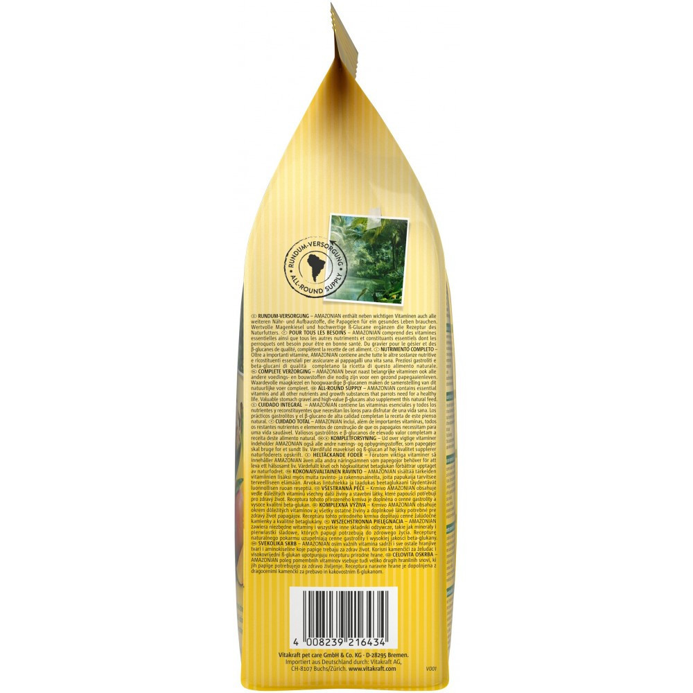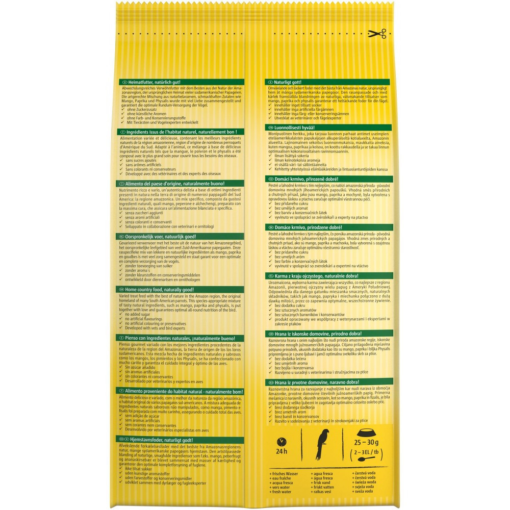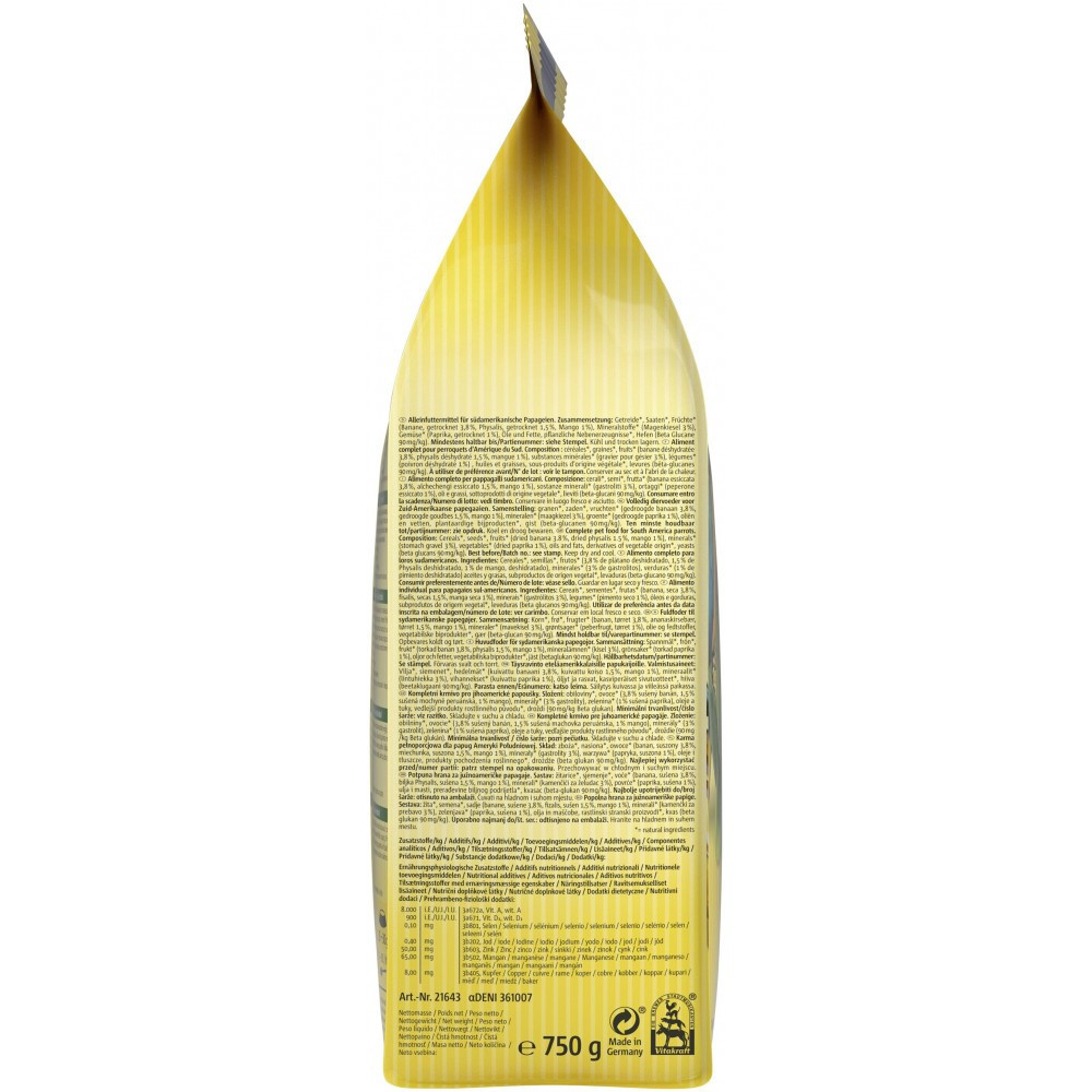 Склад корму відповідає раціону птаха в природному середовищі існування. Батьківщиною багатьох американських птахів є Амазонія, тому корм містить суміш таких інгредієнтів як манго, солодкий перець, фізаліс. Крім основних інгредієнтів, корм містить вітаміни й інші поживні речовини, які необхідні великим птахам для здорового способу життя.Шлункові камені та мінерали регулюють оптимальну роботу шлунка і кишечникаБета-глюкани зміцнюють імунну системуОптимальне співвідношення кальцію і фосфору для здорового росту кістокНе містять цукру, барвників, ароматизаторів і консервантівКонтинентальні корми забезпечують оптимальний догляд і задовольняють потреби птахів у поживних речовинахСклад: Злаки, Насіння, Фрукти (банан сушений 3.8%, фізаліс сушений 1.5%, манго 1%), Мінерали (гравій 3%), Овочі, Олії та жири, Рослинні екстракти білка, Овочі та овочеві продукти, Дріжджі (бета-глюкан 90 мг/кг).Добавки на 1 кг:Вітамін А – 8000 МО, Вітамін D3 – 900 МО, селен – 0.10 мг, йод – 0.40 мг, мідь – 8.00 мг, марганець – 65.00 мг, цинк – 50.00 мг,Рекомендації з годування:Давати щодня 1-2 столові ложки (10-15 г).