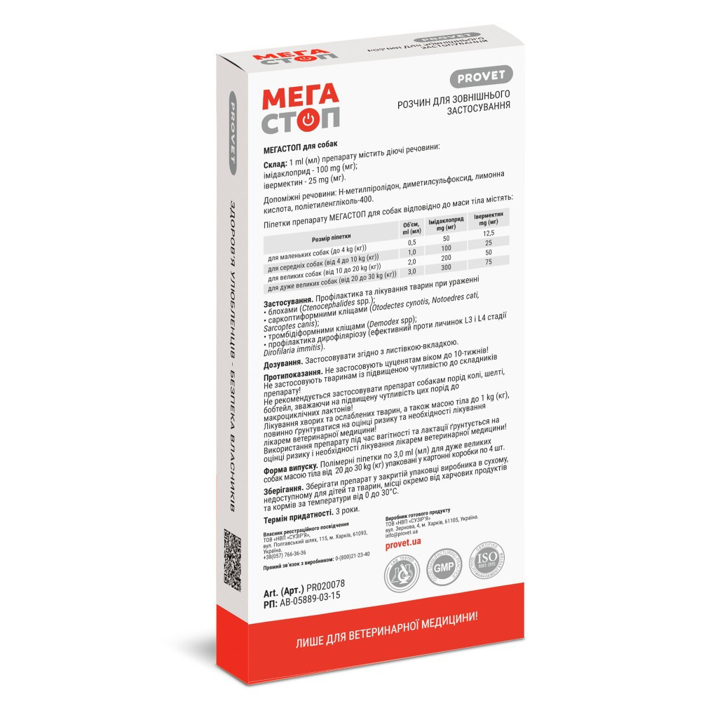 Краплі Provet МЕГАСТОП для собак від 20 до 30 кг від зовнішніх та внутрішніх паразитів 4 піпетки х 3 мл