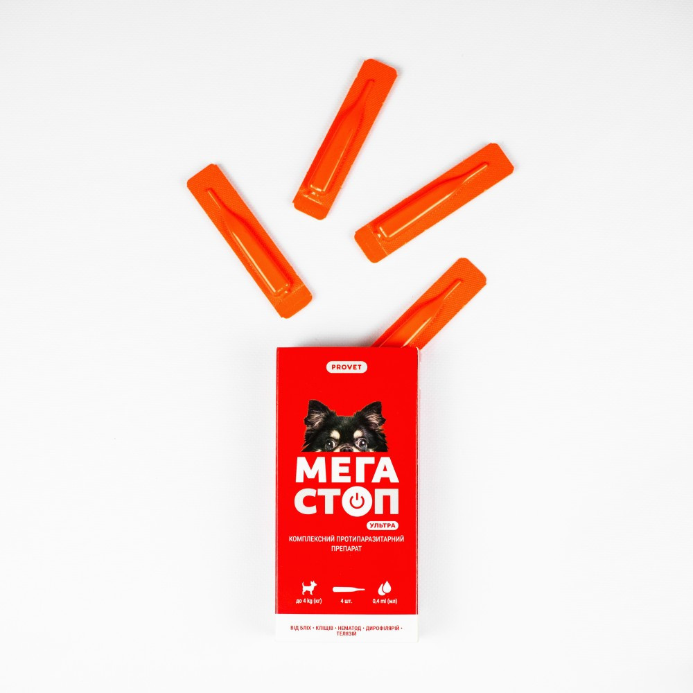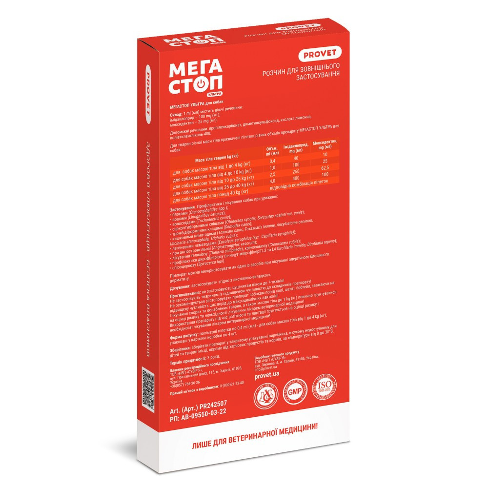 Профілактика і лікування собак при ураженні блохами (Ctenocephalides spp.), вошами (Linognathus setosus), волосоїдами (Trichodectes canis); саркоптиформними кліщами (Otodectes cynotis, Sarcoptes scabiei var. canis); тромбідіформними кліщами (Demodex canis), кишковими нематодами (Тoxocara canis, Toxascaris leonine, Ancylostoma caninum, Uncinaria stenocephala, Trichuris vulpis), легеневими нематодами (Eucoleus aerophilus / syn. Capillaria aerophila) при ангілостронгільозі (Angiostrongylus vasorum); лікування телязіозу (Thelazia callipaeda), стронгілятозів (Crenosoma vulpis); профілактика дирофіляріозу (знищує мікродирофілярії L3 та L4 Dirofilaria immitis; Dirofilaria repens), спіроцеркозу (Spirocerca lupi).Препарат можна використовувати як один із засобів при лікуванні алергічного блошиного дерматиту.Опис: прозорий розчин від слабко-жовтого до жовтого кольору без механічних включень.Склад: 1 ml (мл) препарату містить діючі речовини: імідаклоприд – 100 mg (мг); моксидектин – 25 mg (мг). Допоміжні речовини: пропіленкарбонат, диметилсульфоксид, кислота лимонна, поліетиленгліколь-400.Лікування та попередження зараження блохамиОдноразова обробка препаратом попереджає зараження блохами собак протягом 4 тижнів. Личинки бліх можуть з’являтися в навколишньому середовищі, тому необхідно додатково обробляти місця перебування тварин та предмети догляду з метою переривання життєвого циклу бліх.При лікуванні алергічного блошиного дерматиту препарат рекомендується застосовувати щомісяця.Лікування отодектозуОдноразова обробка препаратом. За рекомендацією ветеринарного лікаря можлива повторна обробка через 30 діб. Не наносити безпосередньо у вушний канал.Лікування саркоптозуЛікування проводять двічі з інтервалом 4 тижні. За необхідності курс лікування повторюють під контролем мікроскопії зіскрібків шкіри.Лікування демодекозуПрепарат застосовують 2-4 рази з інтервалом 30 діб. У тяжких випадках препарат застосовують з інтервалом 7 діб. За необхідності курс лікування повторюють під контролем мікроскопії зіскрібків шкіри. Лікування рекомендується проводити комплексно із застосуванням етіотропних, патогенетичних і симптоматичних засобів.Лікування та профілактика кишкових і легеневих нематодозівЗ лікувальною метою препарат застосовують одноразово, за необхідності (за результатами лабораторних досліджень) через 14 діб обробку потрібно повторити. З профілактичною метою препарат застосовують один раз на місяць.Профілактика дирофіляріозуПрепарат застосовують за місяць до очікуваної активності кровосисних комах, протягом усього періоду активності та ще місяць після завершення їхньої активності, або протягом всього року. Обробку тварин рекомендується проводити щомісяця в один і той самий день.Порядок застосуванняПрепарат застосовувати лише зовнішньо. На ділянці шиї біля основи черепа розділити шерсть тварини, щоб видно було шкіру. Розмістити кінець піпетки на шкірі, міцно стиснути піпетку декілька разів, нанести весь вміст безпосередньо на шкіру. Наносити препарат на неушкоджену поверхню шкіри.Великим собакам масою тіла понад 25 kg (кг) вміст піпетки наносити на шкіру у 3-4 точки вздовж хребта, від холки до хвоста.Протипоказання:Не застосовують цуценятам віком до 7 тижнів!Не застосовують тваринам із підвищеною чутливістю до складників препарату!Не рекомендується застосовувати препарат собакам порід колі, шелті, бобтейл, зважаючи на підвищену чутливість цих порід до макроциклічних лактонів!Лікування хв