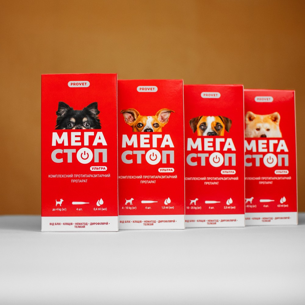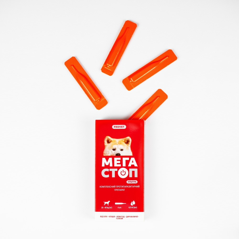 Профілактика і лікування собак при ураженні блохами (Ctenocephalides spp.), вошами (Linognathus setosus), волосоїдами (Trichodectes canis); саркоптиформними кліщами (Otodectes cynotis, Sarcoptes scabiei var. canis); тромбідіформними кліщами (Demodex canis), кишковими нематодами (Тoxocara canis, Toxascaris leonine, Ancylostoma caninum, Uncinaria stenocephala, Trichuris vulpis), легеневими нематодами (Eucoleus aerophilus / syn. Capillaria aerophila) при ангілостронгільозі (Angiostrongylus vasorum); лікування телязіозу (Thelazia callipaeda), стронгілятозів (Crenosoma vulpis); профілактика дирофіляріозу (знищує мікродирофілярії L3 та L4 Dirofilaria immitis; Dirofilaria repens), спіроцеркозу (Spirocerca lupi).Препарат можна використовувати як один із засобів при лікуванні алергічного блошиного дерматиту.Опис: прозорий розчин від слабко-жовтого до жовтого кольору без механічних включень.Склад: 1 ml (мл) препарату містить діючі речовини: імідаклоприд – 100 mg (мг); моксидектин – 25 mg (мг). Допоміжні речовини: пропіленкарбонат, диметилсульфоксид, кислота лимонна, поліетиленгліколь-400.Лікування та попередження зараження блохамиОдноразова обробка препаратом попереджає зараження блохами собак протягом 4 тижнів. Личинки бліх можуть з’являтися в навколишньому середовищі, тому необхідно додатково обробляти місця перебування тварин та предмети догляду з метою переривання життєвого циклу бліх.При лікуванні алергічного блошиного дерматиту препарат рекомендується застосовувати щомісяця.Лікування отодектозуОдноразова обробка препаратом. За рекомендацією ветеринарного лікаря можлива повторна обробка через 30 діб. Не наносити безпосередньо у вушний канал.Лікування саркоптозуЛікування проводять двічі з інтервалом 4 тижні. За необхідності курс лікування повторюють під контролем мікроскопії зіскрібків шкіри.Лікування демодекозуПрепарат застосовують 2-4 рази з інтервалом 30 діб. У тяжких випадках препарат застосовують з інтервалом 7 діб. За необхідності курс лікування повторюють під контролем мікроскопії зіскрібків шкіри. Лікування рекомендується проводити комплексно із застосуванням етіотропних, патогенетичних і симптоматичних засобів.Лікування та профілактика кишкових і легеневих нематодозівЗ лікувальною метою препарат застосовують одноразово, за необхідності (за результатами лабораторних досліджень) через 14 діб обробку потрібно повторити. З профілактичною метою препарат застосовують один раз на місяць.Профілактика дирофіляріозуПрепарат застосовують за місяць до очікуваної активності кровосисних комах, протягом усього періоду активності та ще місяць після завершення їхньої активності, або протягом всього року. Обробку тварин рекомендується проводити щомісяця в один і той самий день.Порядок застосуванняПрепарат застосовувати лише зовнішньо. На ділянці шиї біля основи черепа розділити шерсть тварини, щоб видно було шкіру. Розмістити кінець піпетки на шкірі, міцно стиснути піпетку декілька разів, нанести весь вміст безпосередньо на шкіру. Наносити препарат на неушкоджену поверхню шкіри.Великим собакам масою тіла понад 25 kg (кг) вміст піпетки наносити на шкіру у 3-4 точки вздовж хребта, від холки до хвоста.Протипоказання:Не застосовують цуценятам віком до 7 тижнів!Не застосовують тваринам із підвищеною чутливістю до складників препарату!Не рекомендується застосовувати препарат собакам порід колі, шелті, бобтейл, зважаючи на підвищену чутливість цих порід до макроциклічних лактонів!Лікування хв
