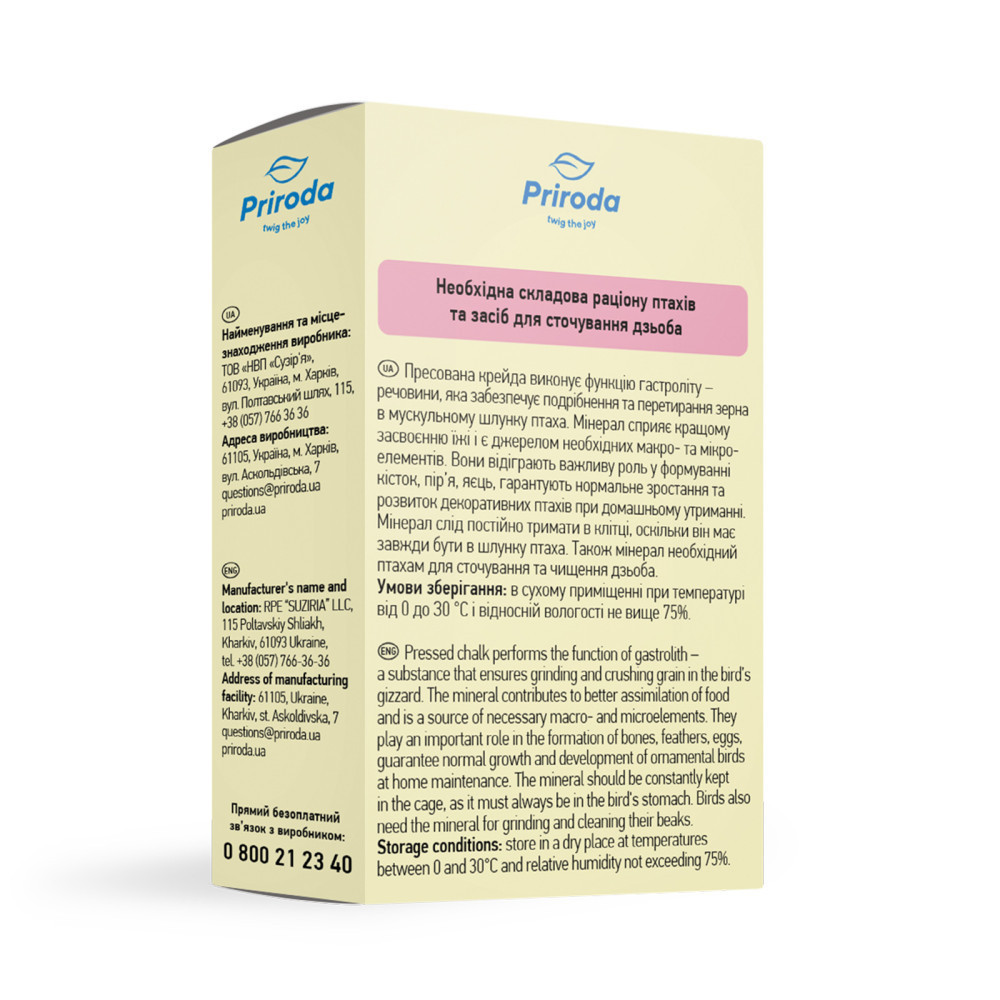 Мінеральні добавки необхідні і молодим, і дорослим птахам для підтримування чудової кондиції, яскравого оперення, формування міцних кісток. Також мінерал виконує роль гастроліту – речовини, необхідної для кращого подрібнення та перетирання зерна в мускульному шлунку. Ще одне призначення мінералу – допомагати улюбленцям чистити та сточувати дзьоб.Склад: пресована крейда, карбонат кальцію, фосфат кальцію, сульфат кальцію, йод, пісок, морські мушлі.Рекомендації. Закріпити мінерал на ґратах так, щоб до нього був вільний доступ. Слідкуйте за тим, щоб в поїлці завжди була свіжа вода.