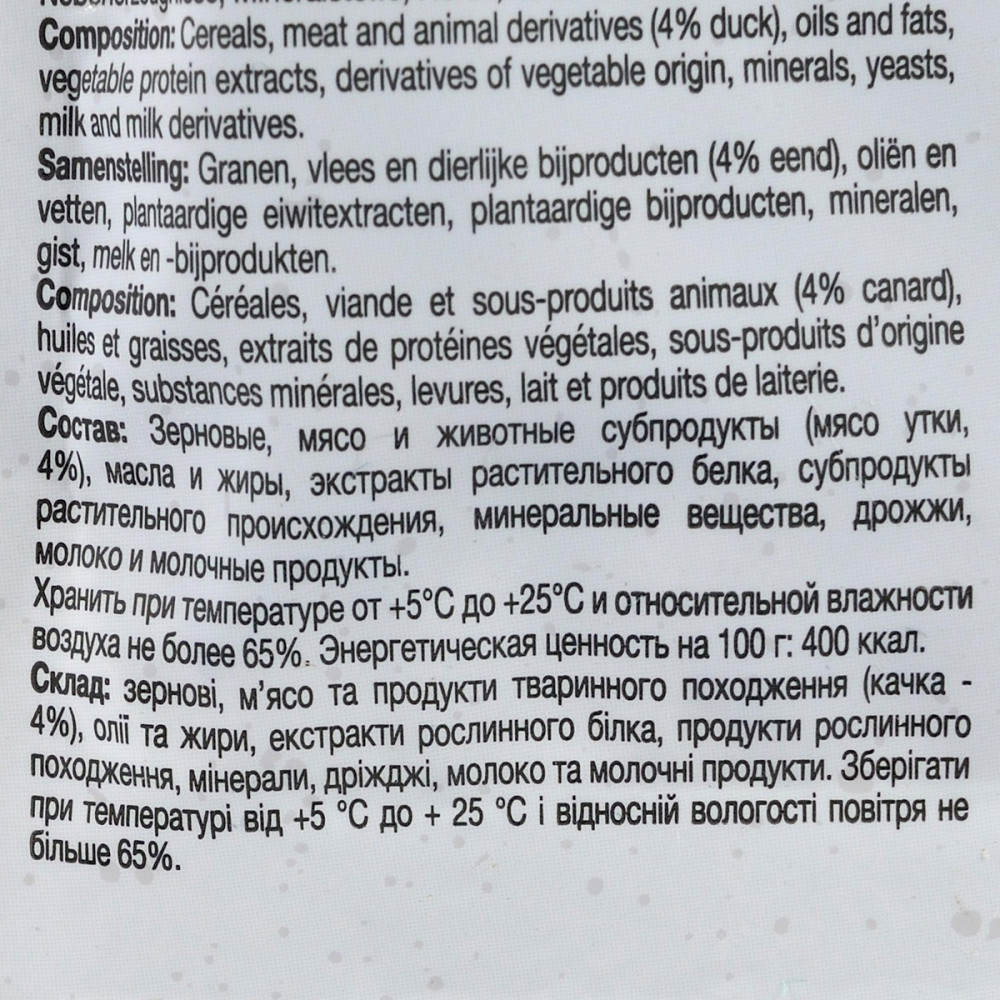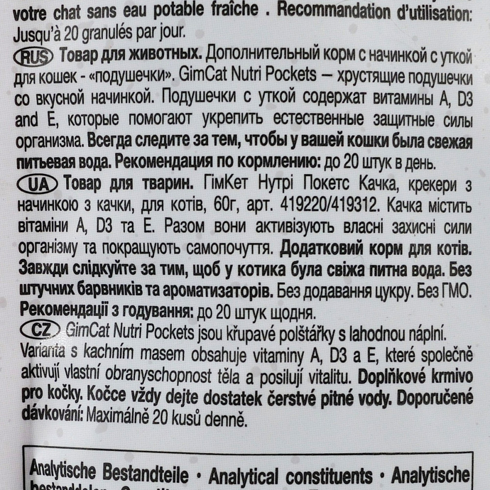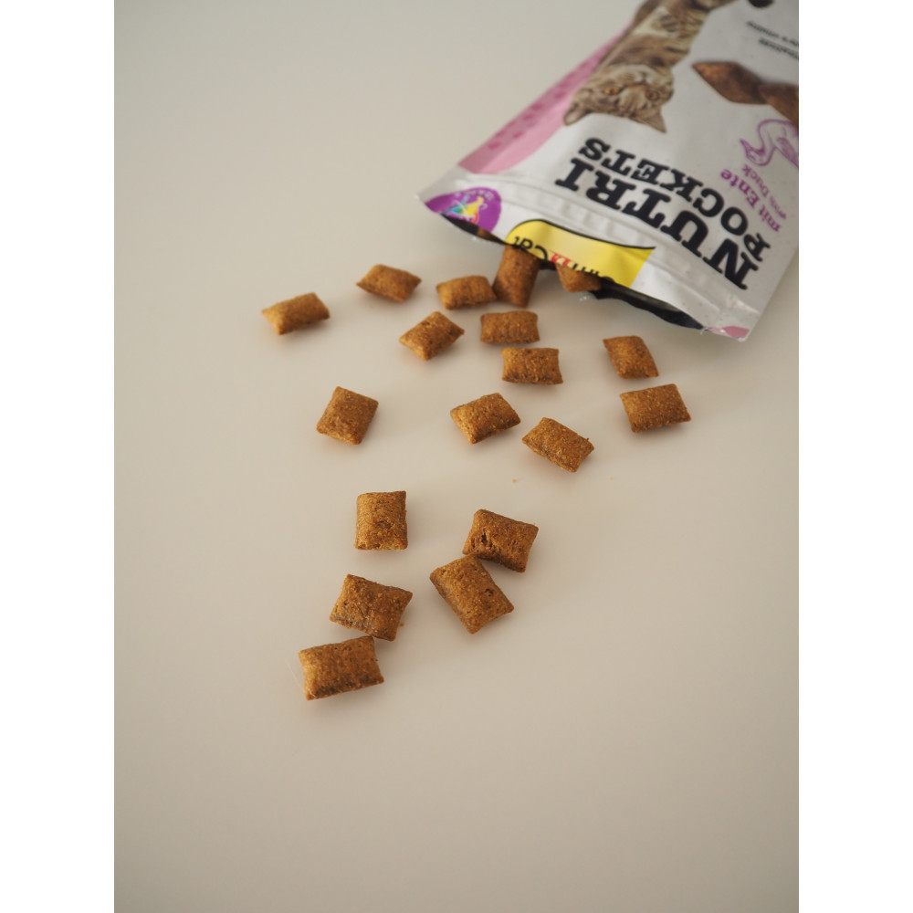 Вітамінні ласощі GimCat Nutri Pockets з качкою – хрусткі подушечки зі смачною начинкою. Подушечки з качкою містять вітаміни A, D3 і E, які допомагають зміцнити природні захисні сили організму.Рекомендації з годування: пригощайте вашого котика ласощами Nutri Pockets до 20 шт. на день. Завжди слідкуйте за тим, щоб в улюбленця була свіжа питна вода.Склад: зернові, м’ясо та продукти тваринного походження (качка – 4%), олії та жири, екстракти рослинного білка, продукти рослинного походження, мінерали, дріжджі, молоко та молочні продукти.Харчова поживність:білки 31,0 %, жири 20,0 %, сира клітковина 4 %, сира зола 6,0 %, вологість 9,0 %.Вітаміни: A: 9.000 МО, Віт. D3: 630 МО, Віт. E: 90 МО, Таурин: 1.000 мг.