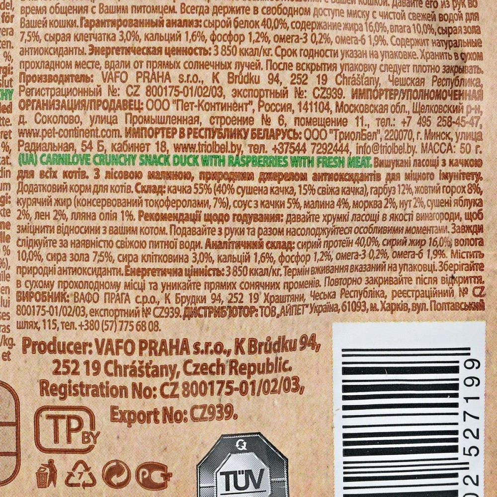 Carnilove Carnilove Crunchy Snack Duck & Raspberries – вишукані ласощі з качкою і малиною для котів. Ці снеки мають беззернову рецептуру та сприяють зміцненню імунітету улюбленця. Є прекрасним варіантом, щоб пригостити котика чимось смачненьким або для його заохочення.Рекомендації з годування:дотримуватися рекомендаційних норм, вказаних на упаковці товару. Намагайтеся не перегодовувати улюбленця. Слідкуйте за тим, щоб у вихованця був завжди доступ до питної води.Склад:качка 55% (40% сушена качка, 15% cвіжа качка), гарбуз 12%, жовтий горох 8%, курячий жир (консервований токоферолами, 7%), соус з качки 5%, малина 4%, морква 2%, нут 2%, сушені яблука 2%, льон 2%, лляна олія 1%.Аналітичні компоненти:сирий протеїн 40,0%, cирий жир 16,0%, волога 10,0%, сира зола 7,5%, сира клітковина 3,0%, кальцій 1,6%, фосфор 1,2%, омега-3 0,2%, омега-6 1,9%. Містить природні антиоксиданти.Енергетична цінність:3 850 ккал/кг