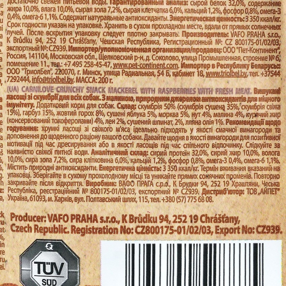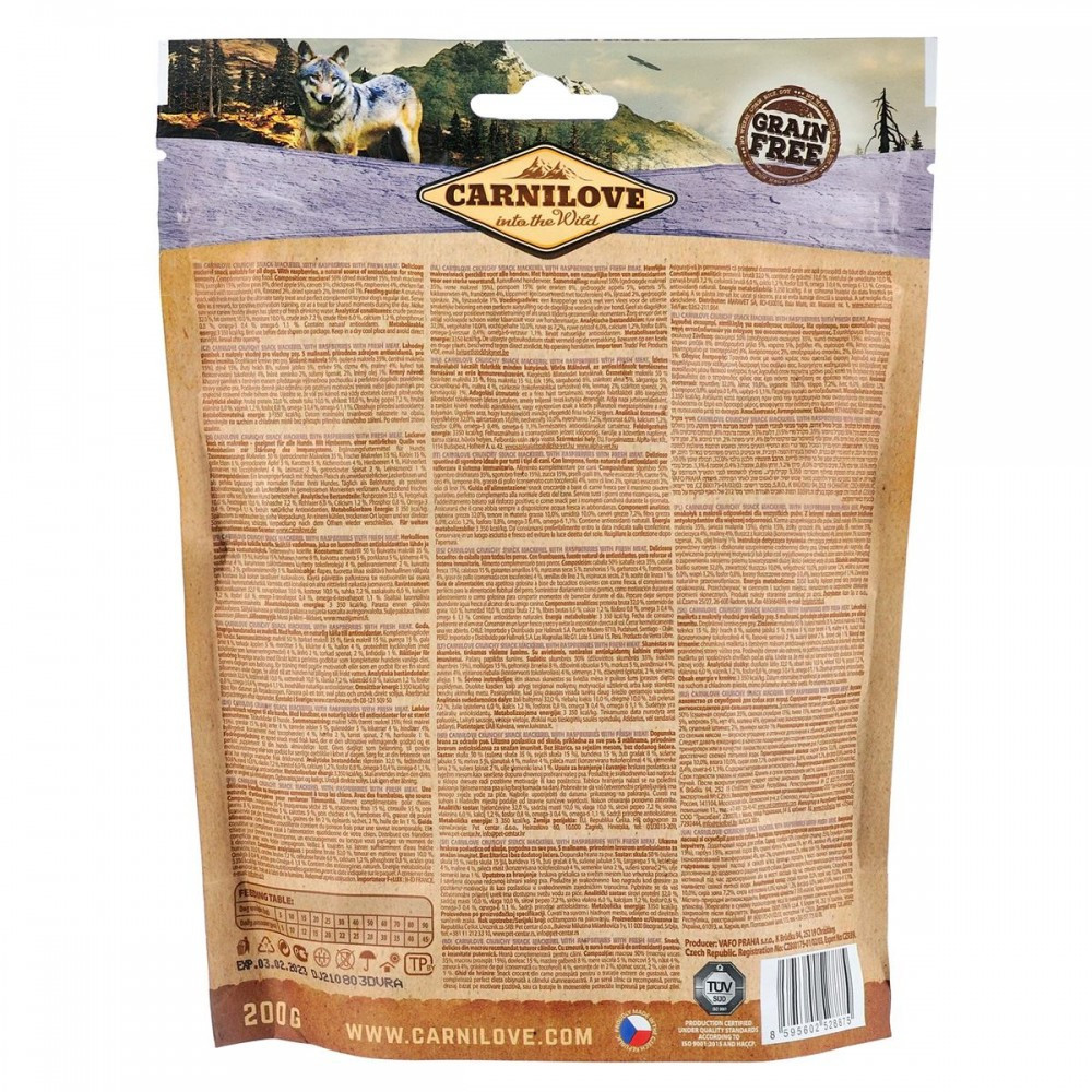 Carnilove Crunchy Mackerel with Raspberries – вишукані ласощі зі свіжою скумбрією і малиною для собак. Снеки мають беззернову рецептуру, а малина є природним джерелом антиоксидантів для міцного імунітету.Рекомендації з годування:дотримуватися рекомендаційних норм, вказаних на упаковці товару. Намагайтеся не перегодовувати улюбленця. Слідкуйте за тим, щоб у вихованця був завжди доступ до питної води.Склад:скумбрія 50% (скумбрія сушена 35%, скумбрія свіжа 15%), гарбуз 15%, жовтий горох 8%, сушені яблука 5%, морква 5%, нут 4%, малина 4%, курячий жир (консервований токоферолами) 4%, лен 2%, сушений шпинат, 2%, лляна олія 1%.Аналітичні компоненти:сирий протеїн 32,0%, cирий жир 10,0%, волога 10,0%, сира зола 7,2%, сира клітковина 6,0%, кальцій 1,2%, фосфор 0,8%, омега-3 0,4%, омега-6 1,1%. Містить природні антиоксиданти.Енергетична цінність:3 350 ккал/кг