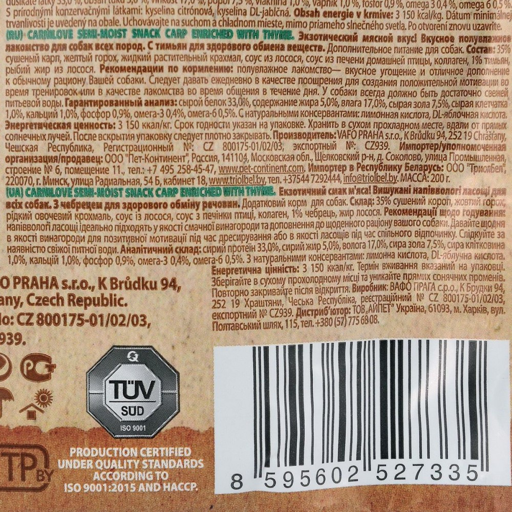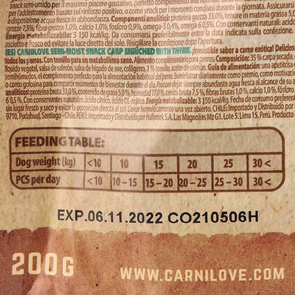 Carnilove Semi-Moist Carp with Thyme – напіввологі беззернові ласощі з коропом і чебрецем для собак. Спокушають улюбленців своїм екзотичним смаком, а особливий склад снеків покращує обмін речовин у чотирилапих.Рекомендації з годування:дотримуватися рекомендаційних норм, вказаних на упаковці товару. Намагайтеся не перегодовувати улюбленця. Слідкуйте за тим, щоб у вихованця був завжди доступ до питної води.Склад:35% сушений короп, жовтий горох, рідкий овочевий крохмаль, соус із лосося, соус з печінки птиці, колаген, 1% чебрець, жир лосося.Аналітичні компоненти:сирий протеїн 33,0%, cирий жир 5,0%, волога 17,0%, сира зола 7,5%, сира клітковина 1,0%, кальцій 1,0%, фосфор 0,9%, омега-3 0,4%, омега-6 0,5%. З натуральними консервантами: лимонна кислота, DL-яблучна кислота.Енергетична цінність:3 150 ккал/кг
