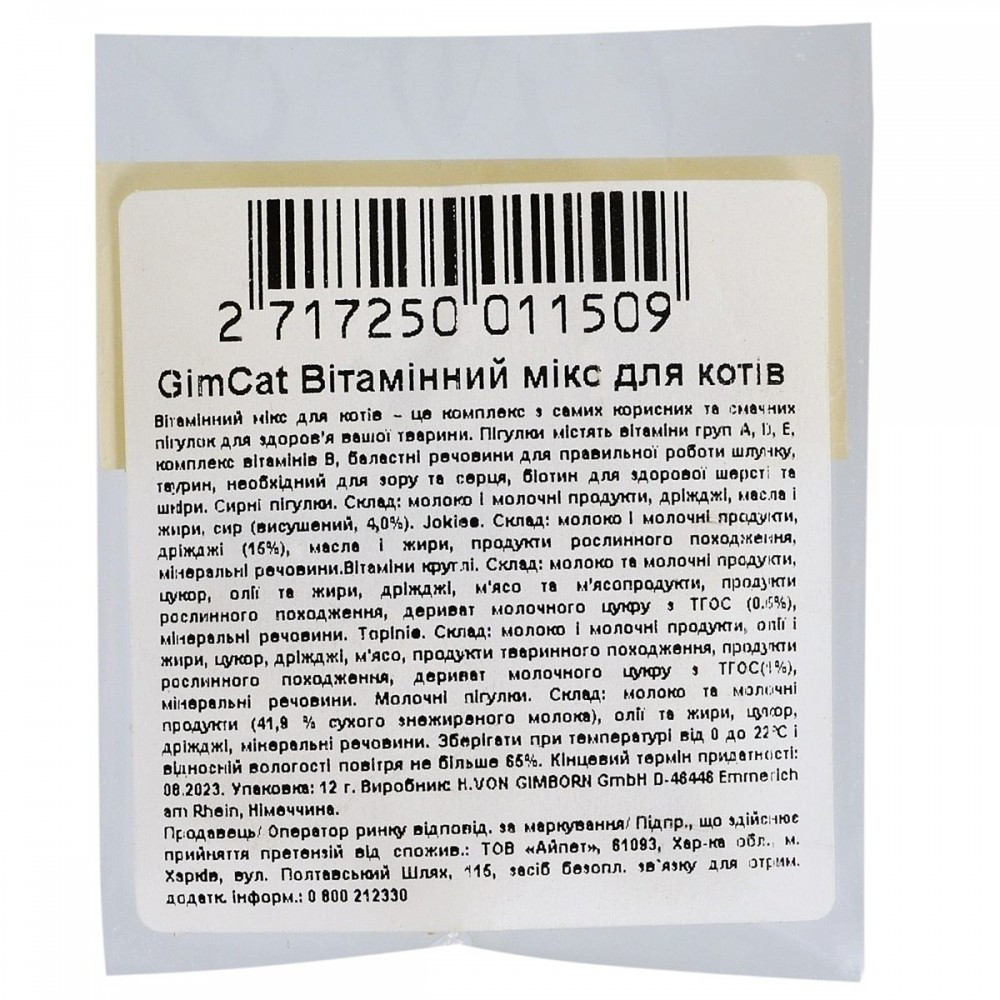 Вітамінний мікс для котів– це комплекс з самих корисних та смачних таблеток для здоров’я вашого улюбленця. Вони містять вітаміни груп А, D, Е, комплекс вітамінів В, баластні речовини для правильної роботи шлунку, таурин, необхідний для зору та серця, біотин для здорової шерсті та шкіри.Сирні таблетки. Склад:молоко і молочні продукти, дріжджі, олії і жири, сир (висушений, 4,0%).Topinis. Склад:молоко і молочні продукти, олії і жири, цукор, дріжджі, м’ясо, продукти тваринного походження, продукти рослинного походження, дериват молочного цукру з ТГОС(1%), мінеральні речовини.Сердечка. Склад:молоко та молочні продукти, цукор, олії та жири, молочні дріжджі, продукти рослинного походження, мінеральні речовини, дериват молочного цукру з ТГОС (1,0%).Вітаміни круглі. Склад:молоко та молочні продукти, цукор, олії та жири, дріжджі, м’ясо та м’ясопродукти, продукти рослинного походження, дериват молочного цукру з ТГОС (0.5%), мінеральні речовини