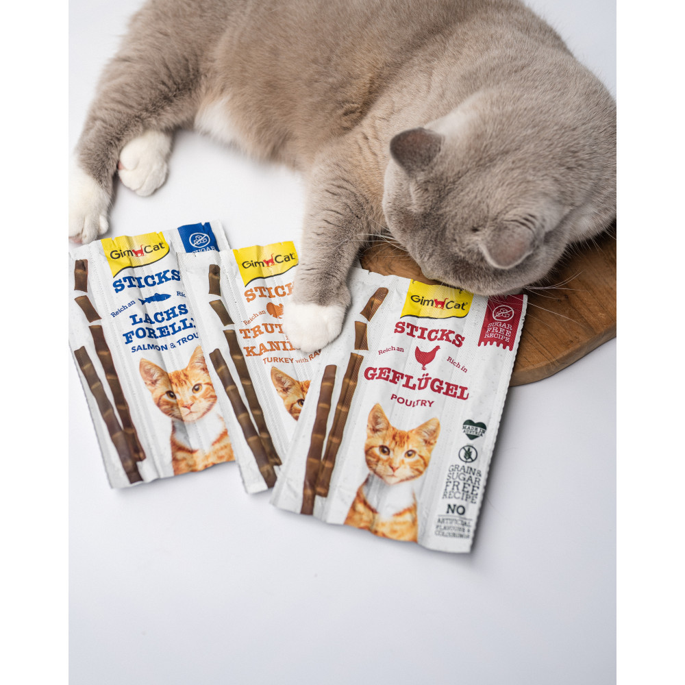Палички Gimpet – це надзвичайна насолода для вередливих котів. До їх складу входить м’ясо лосося та тріска, а також вітаміни А, D3 та Е.Склад:м’ясо та продукти переробки м’яса, риба та продукти переробки риби (лосось 8%, тріска 8%), дріжджі (мін. – 4%), цукор, мінеральні речовини, олії та жири, продукти рослинного походження.Інгредієнти:білки – 37,0%, жири – 21,0%, сира клітковина – 2,0%, сирий попіл – 7,0%, вологість – 27,0%, Омега 3 жирні кислоти – 1,0%.Додатки на 1 кг:вітамін А – 150 000 МО, вітамін D3 – 500 МО, вітамін Е – 5 мг, таурин – 1000 мкг.Рекомендації щодо годування:дорослим котам – 1-2 палички щоденно. Завжди забезпечуйте тварину свіжою питною водою.