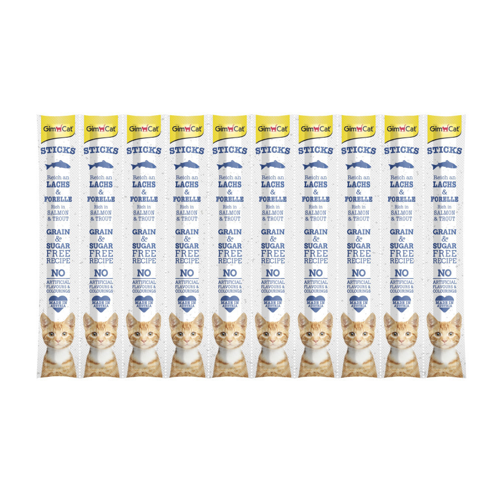 GimCat Sticks Salmon & Troutn – це смачнючі ласощі для котиків. Ретельно підібраний рецепт містить лосось і форель, а також вітаміни та таурин. Рецептура настільки наповнена корисними інгредієнтами, що в ній немає місця для доданого цукру, зерна, штучних барвників чи ароматизаторів.Смачні та корисні снеки на кожен день!Склад: м’ясо і продукти тваринного походження, риба і рибні продукти (15% з лосося і 15% з форелі, дріжджі, мінерали.Добавки до продукту:добавки на 1 кг: вітамін A 5000 МО, вітамін D3 500 МО, віт. Е (альфатокоферол) 5 мг, таурин 1000 мг, з консервантами.Рекомендації щодо годування:дорослим котам – 1-2 палички щоденно. Завжди забезпечуйте тварину свіжою питною водою.