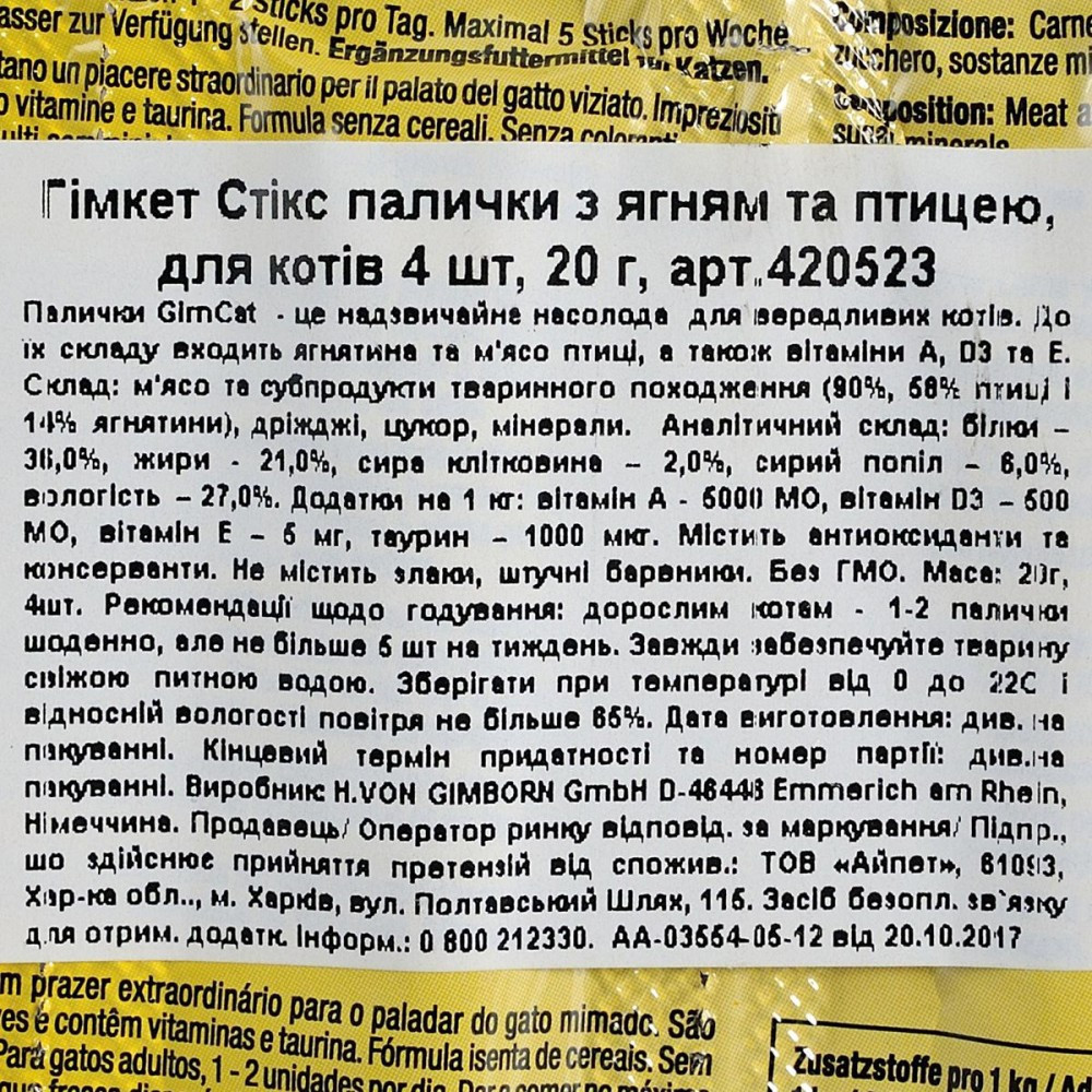 Смачнючі палички GimCat Sticks з ягням і м’ясом птахів – надзвичайна насолода навіть для вередливих котів. Вони містять багато м’яса, вітаміни і таурин.Беззернова формула. Без штучних барвників.Склад: м’ясо та продукти тваринного походження (95 %, 52 % м’яса птахів, 14% ягня), дріжджі, мінерали.Харчові добавки на 1 кг: вітамін A 5.000 МО, вітамін D3 500 МО, вітамін E 5 мг, таурин 1.000 мг.Рекомендації з годування:дорослим котикам до 1-2 палички на день. Максимум 5 паличок на тиждень.