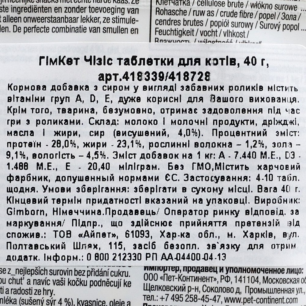 Ласощі з сиром у вигляді кумедних кульок містять вітаміни груп А, D, Е. Вони дуже корисні для Вашого вихованця. Крім того, улюбленець, безумовно, отримає задоволення під час гри з кульками.Склад: молоко і молочні продукти, дріжджі, олії та жири, сир (висушений, 4,0%).Процентний зміст: протеїн – 28,0%, жири – 23,1%, рослинні волокна – 1,2%, зола – 9,1%, вологість – 4,5%.Вміст добавок на 1 кг: А – 7.440 М.Е., D3 – 1.488 М.Е., Е – 20,40 міліграм.Застосування: 4-10 табл. щодня.
