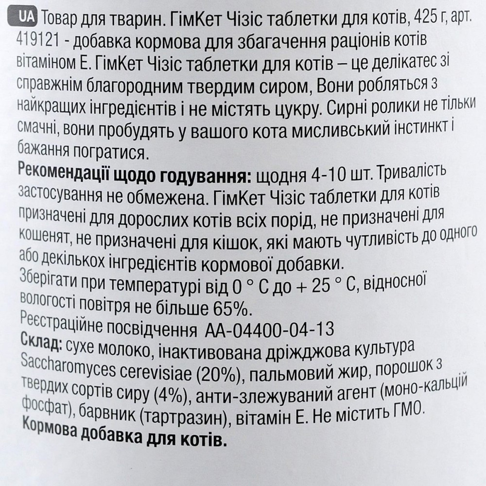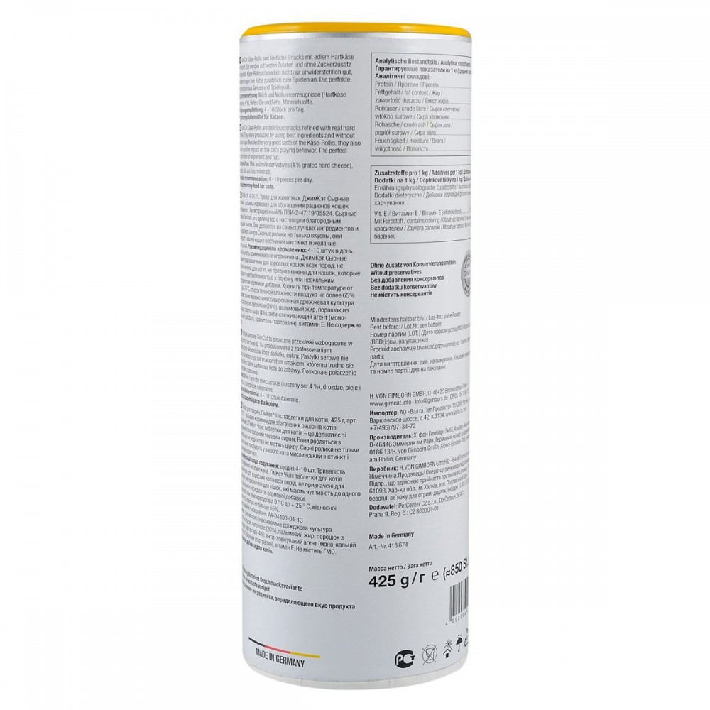 Ласощі з сиром у вигляді кумедних кульок містять вітаміни груп А, D, Е. Вони дуже корисні для Вашого вихованця. Крім того, улюбленець, безумовно, отримає задоволення під час гри з кульками.Склад: молоко і молочні продукти, дріжджі, олії та жири, сир (висушений, 4,0%).Процентний зміст:протеїн – 28,0%, жири – 23,1%, рослинні волокна – 1,2%, зола – 9,1%, вологість – 4,5%.Зміст добавок на 1 кг:А – 7.440 М.Е., D3 – 1.488 М.Е., Е – 20,40 міліграм.Застосування: 4-10 табл. щодня.Кінцевий термін придатності вказаний на упаковці.