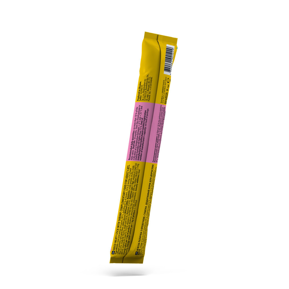 М’ясна паличка для котів. Додаткове харчування, яке можна використовувати як частування, для заохочення, або для закріплення бажаної поведінки. М’яка текстура дозволяє легко розділити паличку на шматочки навіть для котиків з чутливими зубами та яснами.Склад:м’ясо та м’ясні інгредієнти (90 %, зокрема курка 67 %, креветка 19 %, білок колагеновий з яловичини 4 %), борошно зародків кукурудзи, гліцерин харчовий. Без ГМО.Поживні речовини:сирий протеїн 24,0 %, сира клітковина 2,0 %, сирий жир 14,0 %, сира зола 5,0 %. Вміст вологи 21,0 %.Добавки (на 1 кг):вітамін А(3а672а) 880 МО/IU, вітамін D3(3а671) 713 МО/IU, вітамін Е(3а700) 62 мг/mg, цинк (3b605) 100 мг/mg, йод (3b202) 1,5 мг/mg.Технологічні добавки:загущувач, консервант, антиоксидант.Сенсорні добавки:барвник харчовий.Енергетична цінність на 1 кг/kg продукту:3190 ккал/kcal.Рекомендована денна норма:не більше 10 % від добового раціону.