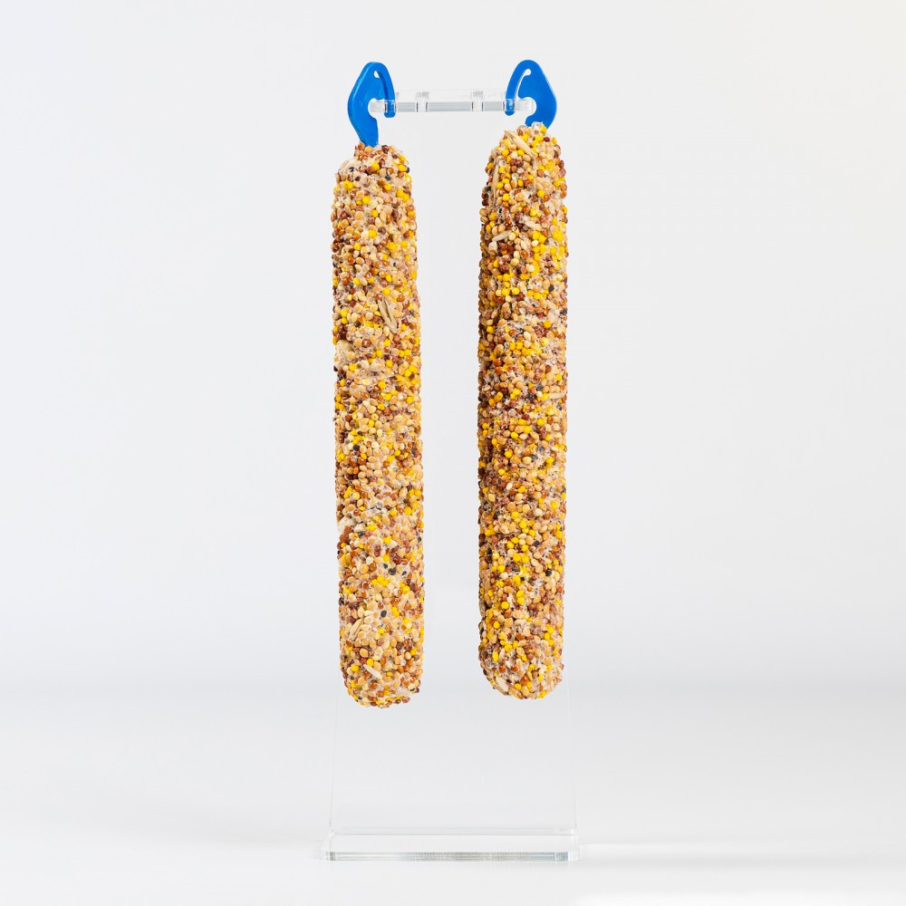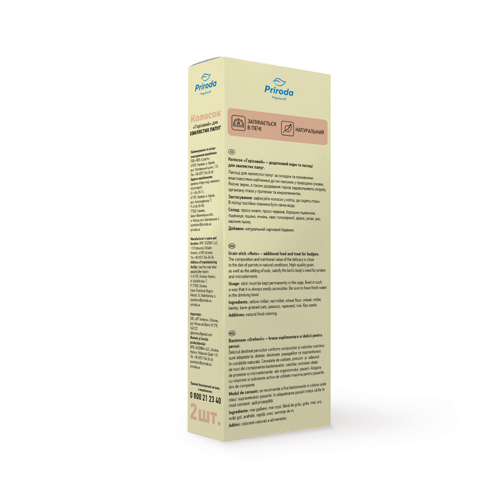 Повноцінні вітамінізовані ласощі мають високу поживну цінність і смакові якості завдяки спеціальній технології обробки інгредієнтів. Склад колосків наближений до їжі папуг в природних умовах. Добірні зерна забезпечують птахів енергією.Сушені за спеціальною технологією овочі та фрукти зберігають максимальну кількість корисних речовин. Ласощі позитивно впливають на травлення птахів, а це забезпечує чудову кондицію та рухливість.Горіхи доповнюють раціон птахів білками та харчовими волокнами, вітамінами PP, E, групи B, макро- та мікроелементами, в тому числі калієм, магнієм, кальцієм, натрієм.Склад: насіння льону, овес голозерний, рапс, просо, ячмінь, пшениця, арахіс, рис, пшоноДобавки: питна вода, борошно пшеничне, натуральний харчовий барвник