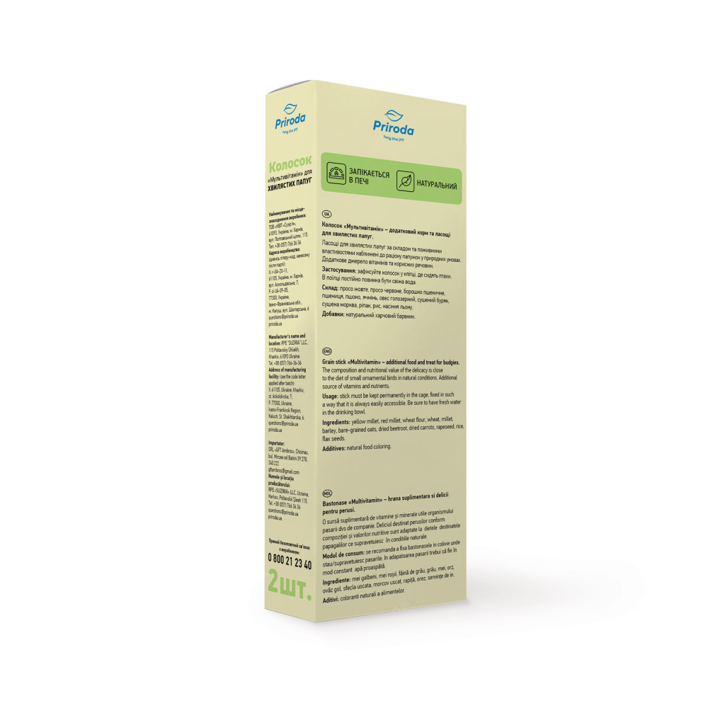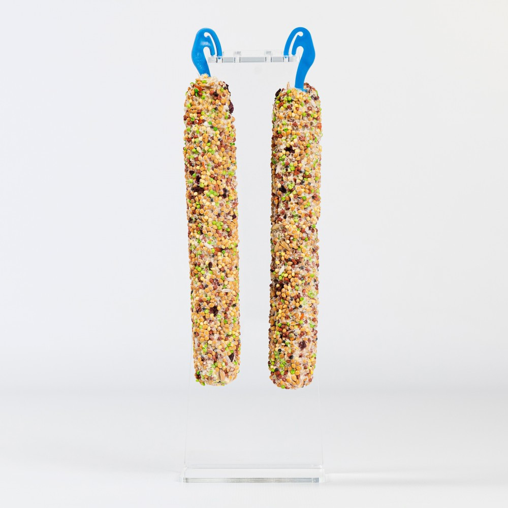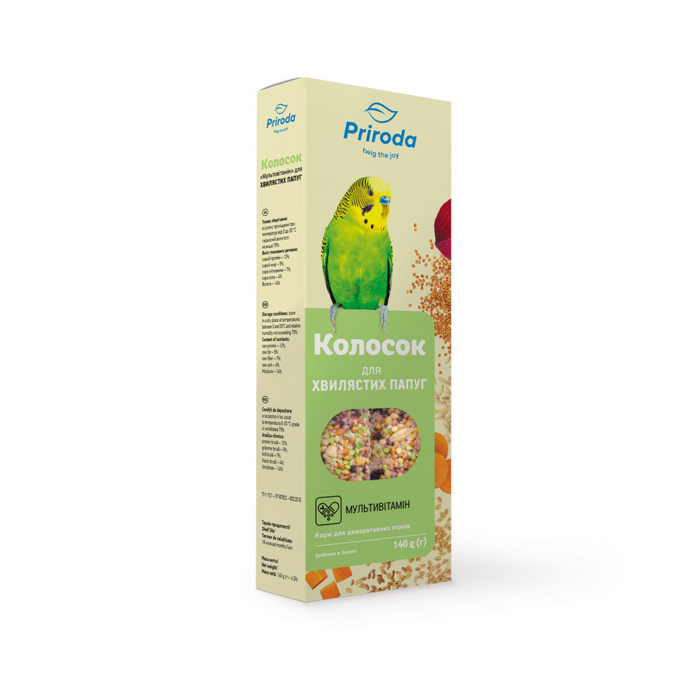 Повноцінні вітамінізовані ласощі мають високу поживну цінність і смакові якості завдяки спеціальній технології обробки інгредієнтів. Склад колосків наближений до їжі папуг в природних умовах. Добірні зерна забезпечують птахів енергією.Сушені за спеціальною технологією овочі та фрукти зберігають максимальну кількість корисних речовин. Ласощі позитивно впливають на травлення птахів, а це забезпечує чудову кондицію та рухливість.Зневоднені фрукти й овочі збагачують раціон птахів вітамінами, мікроелементами, пектиновими речовинами. Це благотворно впливає на імунітет, запобігає стресу.Склад: насіння льону, овес голозерний, рапс, просо, ячмінь, пшениця, сухий буряк, суха морква, рис, пшоно.Добавки: питна вода, борошно пшеничне, натуральний харчовий барвник