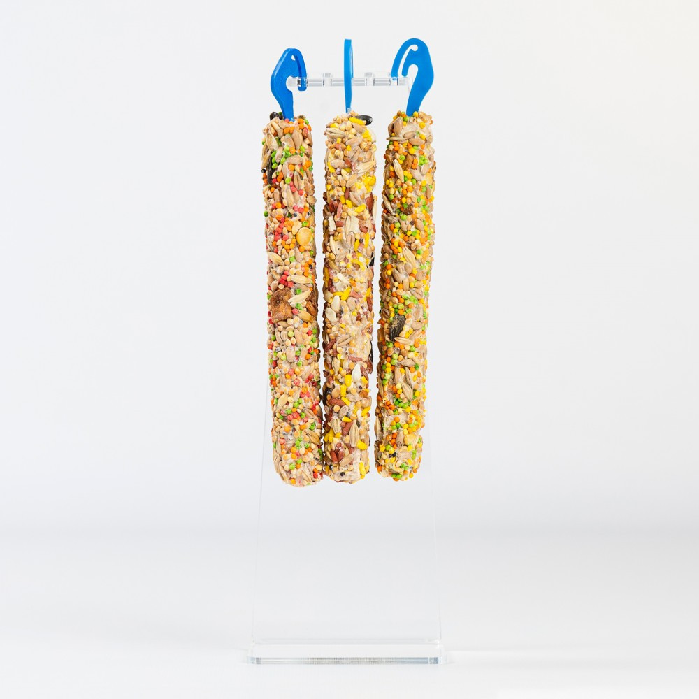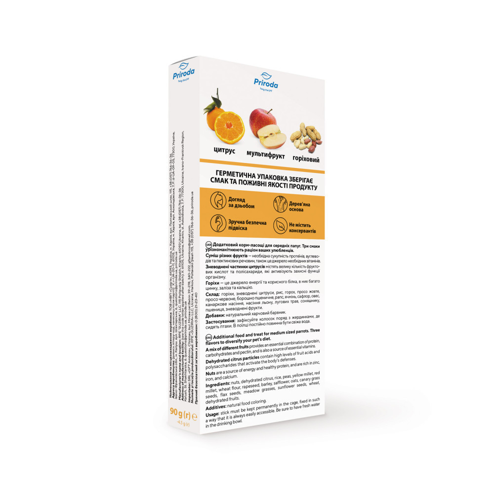 Суміш різноманітних фруктів – необхідна сукупність вуглеводів, а також пектинових речовин, які впливають на загальний імунітет птахів. Також фрукти – це джерело необхідних вітамінів.Горіхи – це джерело енергії і корисного білка, в них багато цинку, заліза і кальцію, тому це незамінна частина раціону птахів, вони сприяють нормальному обміну речовин і зміцненню імунітету. Зневодненні частки цитрусів містять велику кількість фруктових кислот і полісахариди. Полісахариди в складі цитрусових активізують захисні функції організму, попереджають інфекційні захворювання.Склад: насіння льону, овес голозерний, ріпак, просо, ячмінь, пшениця, сушені яблука, сушені апельсини, сафлор, сушений виноград, насіння соняшнику, горохова крупа, рис, арахіс, пшоноДобавки: питна вода, борошно пшеничне, натуральний харчовий барвник