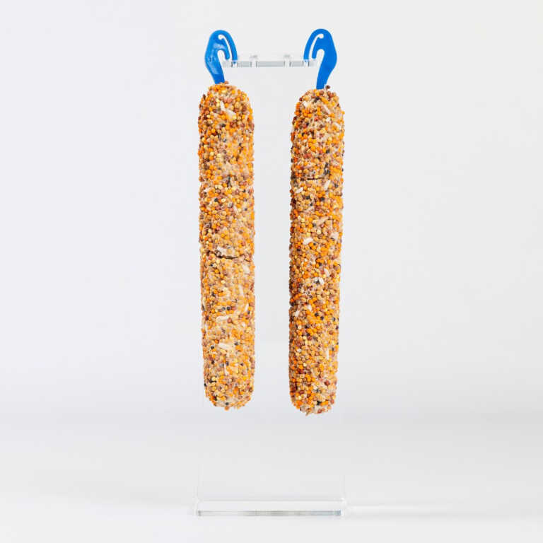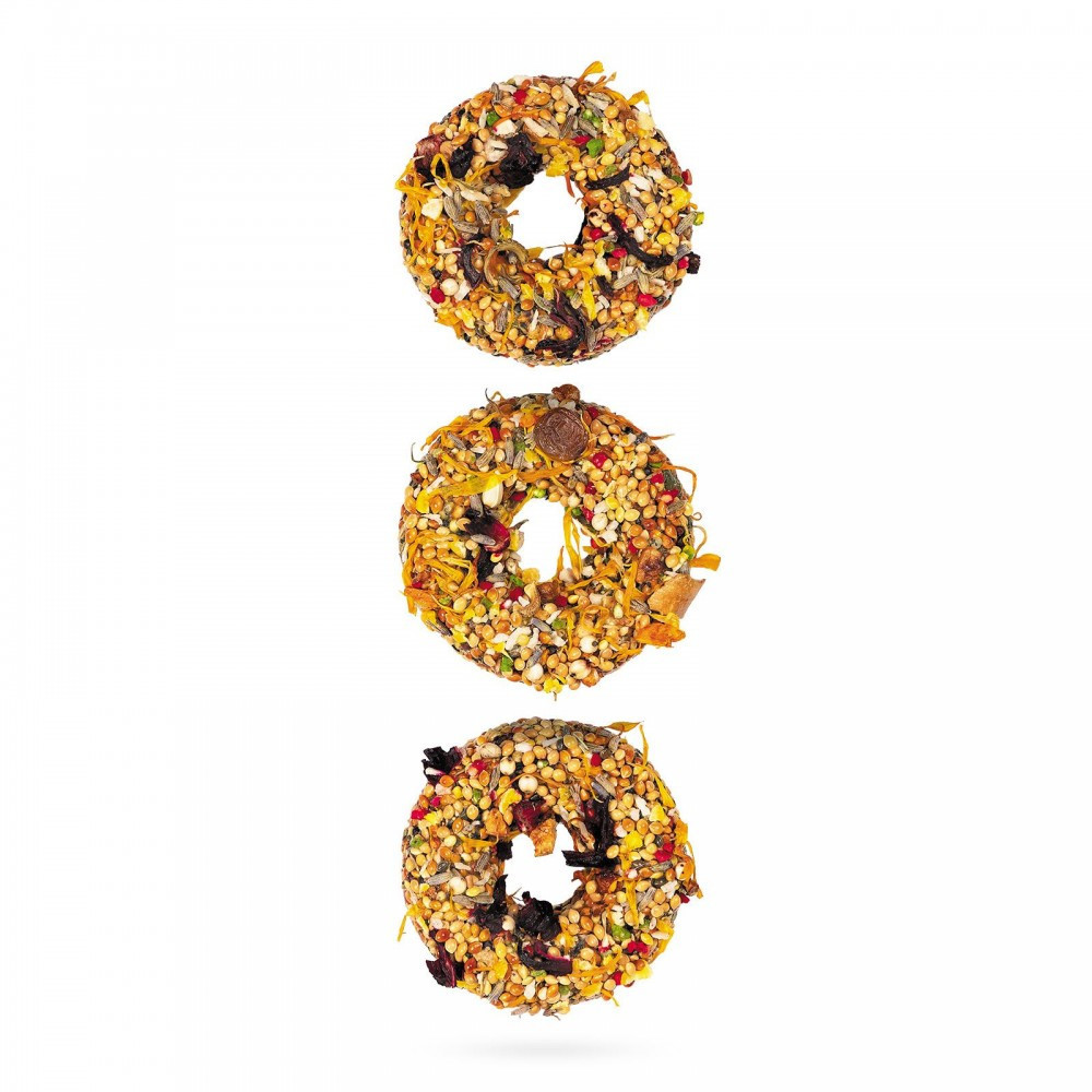 Додатковий корм має унікальний, надзвичайно різноманітний склад, який включає інгредієнти з природного місця проживання улюбленців.Рецептура ласощів розроблена спеціально для декоративних птахів, які утримуються в домашніх умовах. Смаколики чудово доповнюють раціон птахів корисними речовинами і дарують нові смаки. Виноград, гібіск, ромашка, ехінацея та смородина є джерелом вітамінів, підвищують опірність інфекціям. Пончик зручно кріпиться у клітці за допомогою спеціального тримача.Склад:просо жовте, просо червоне, борошно пшеничне, пшоно, морква сушена, райграс, ріпак, кероб, виноград сушений (1,33%), насіння льону, кукурудзяні пластівці, яблука сушені, смородина чорна (0,67%), овес голозерний, квіти ромашки, кропива, листя берези, сорго біле, гібіск, овочево-зернова крихта, злаково-трав’яна крихта, кокосова стружка, сафлор, ехінацеї пурпурної трава (0,09%), квіти календули.