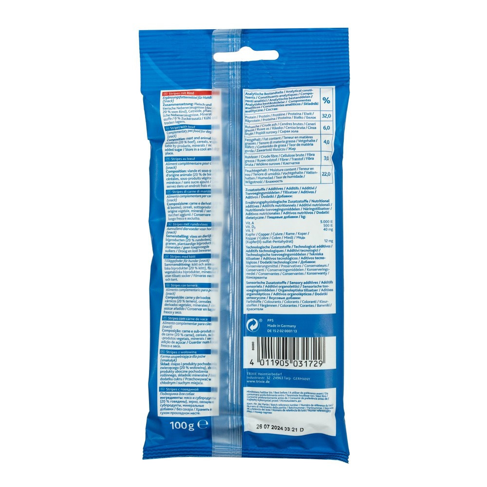Апетитні снеки Trixie Stripes Light не залишать байдужим жодного собаку. Ці ласощі є прекрасною можливістю продемонструвати свою любов і збагатити раціон улюбленця поживними речовинами. Також це чудовий варіант винагороди для собаки під час тренування. До складу продукту входить велика кількість вітамінів, які є невід’ємною складовою щоденного раціону.З яловичиноюБез цукруРекомендації з годування: давати як добавку до основного корму, залежно від розміру улюбленця, але не більше, ніж 10% від його денного раціону.Склад: м’ясо та субпродукти тваринного походження (20% яловичини), злаки, рослинні субпродукти, мінеральні речовиниАналітичний склад:жир 4%, вологість 22%, протеїн 32%, сира зола 6%, сира клітковина 3%Вага: 10 шт./100 г